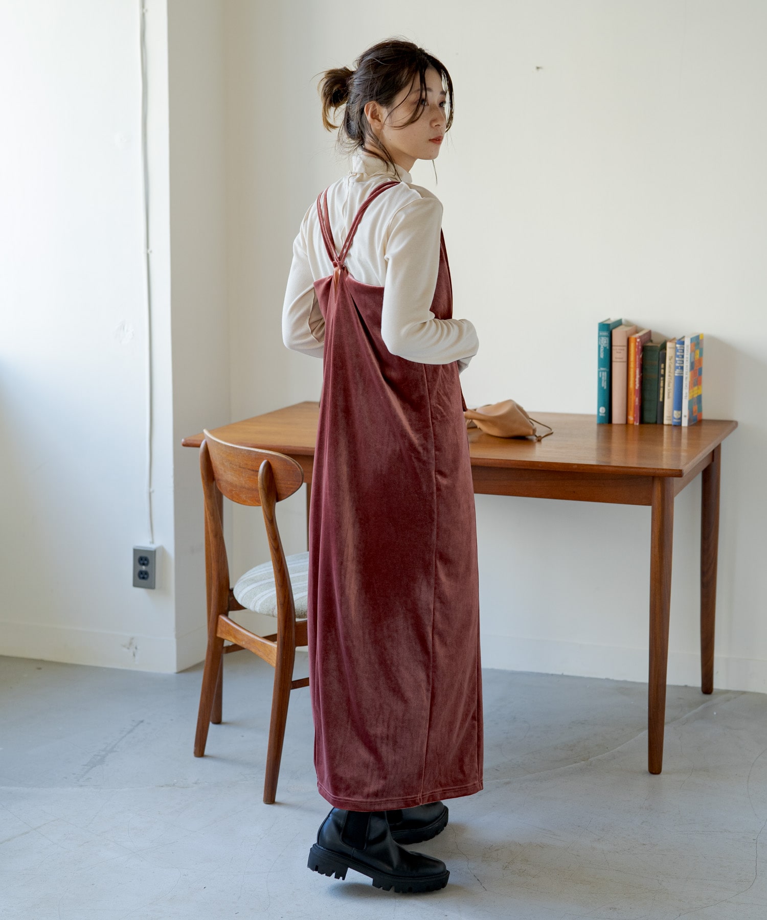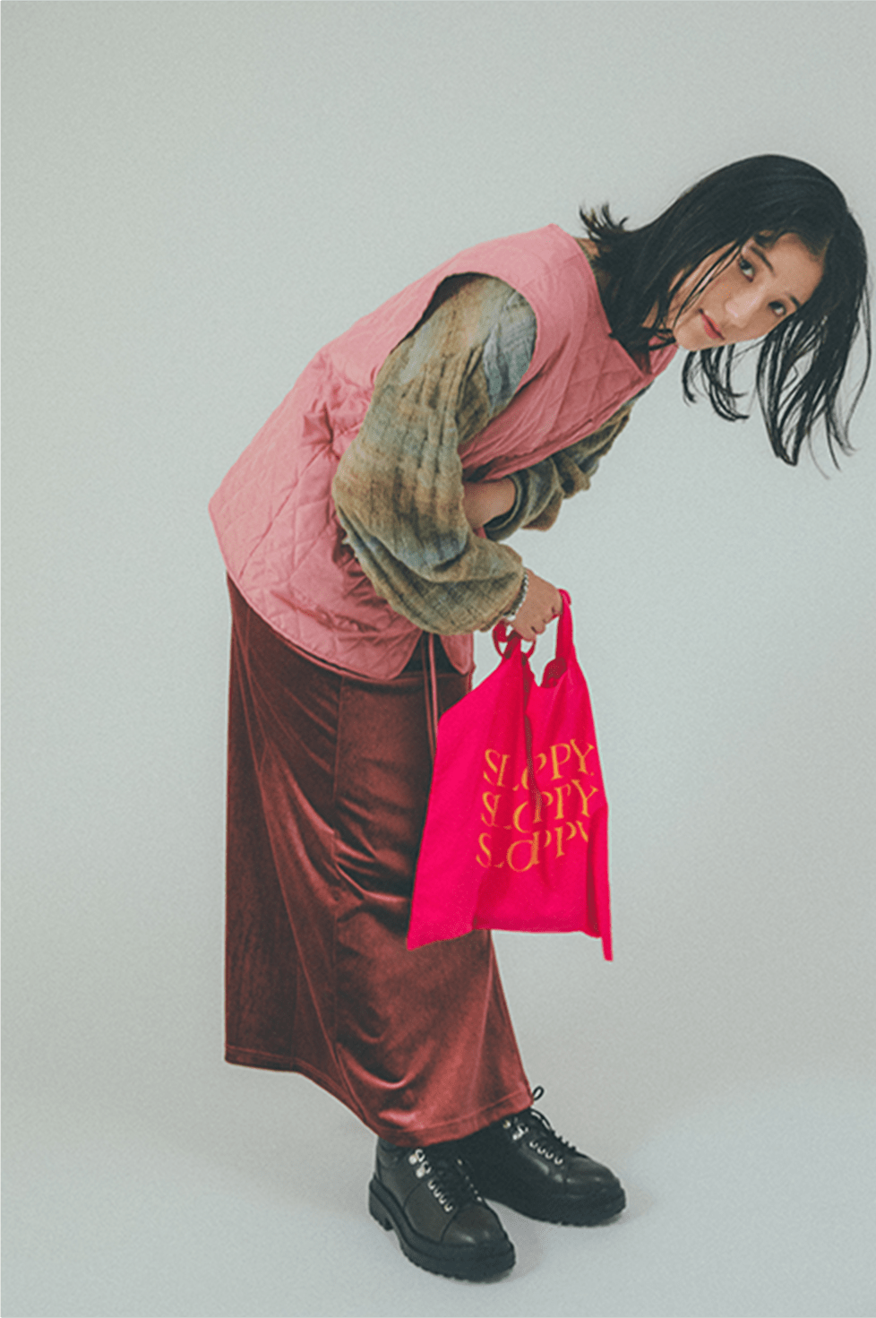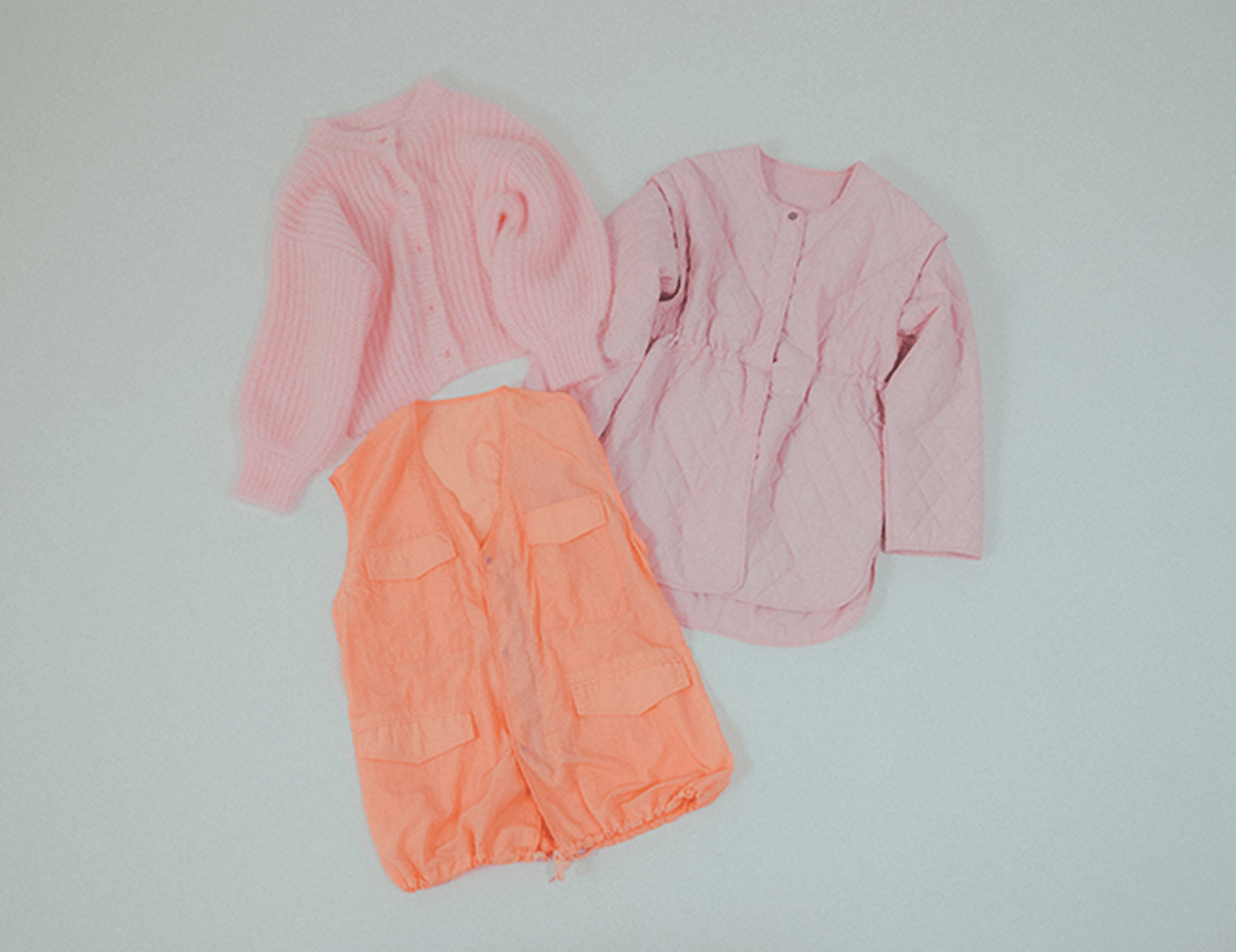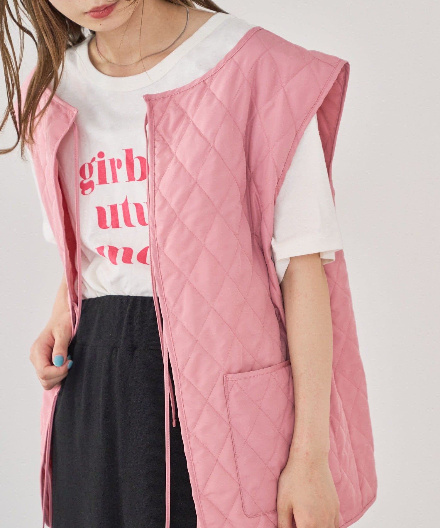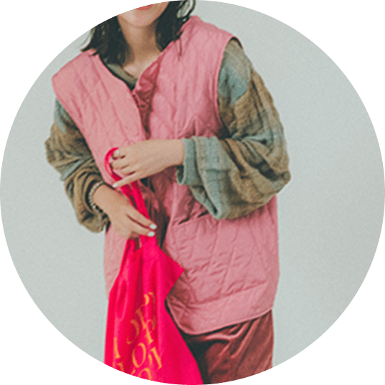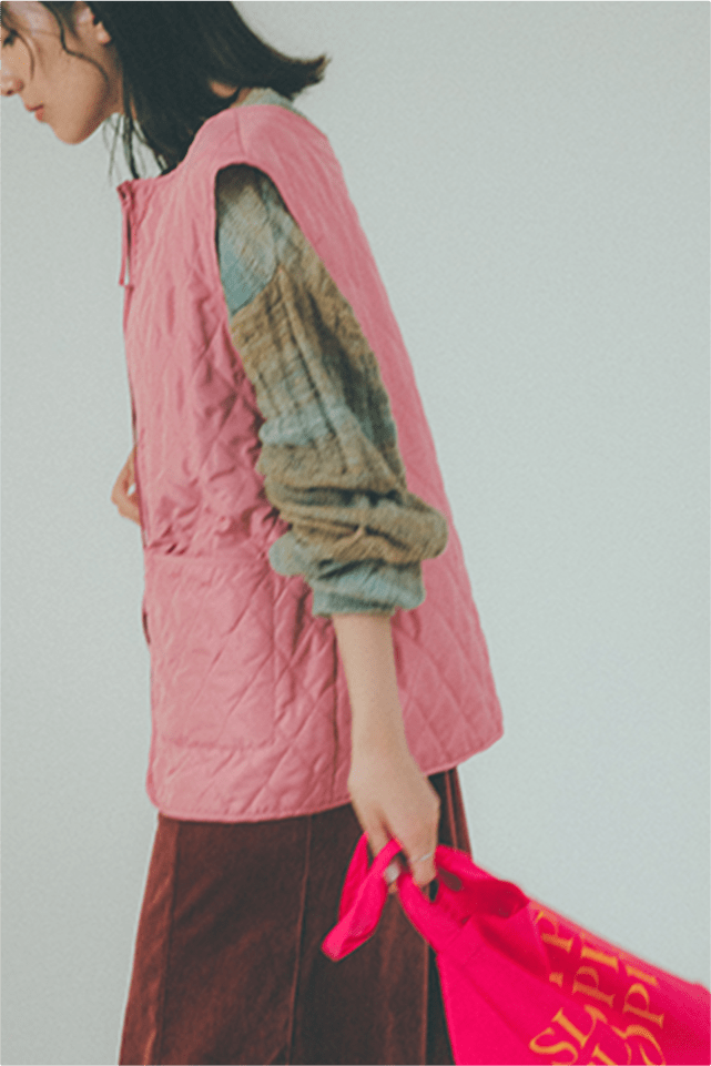 春夏に引き続きピンク気分。インナーとワンピースをシックなピンク、ベストは明るいピンクでコーディネートしました。