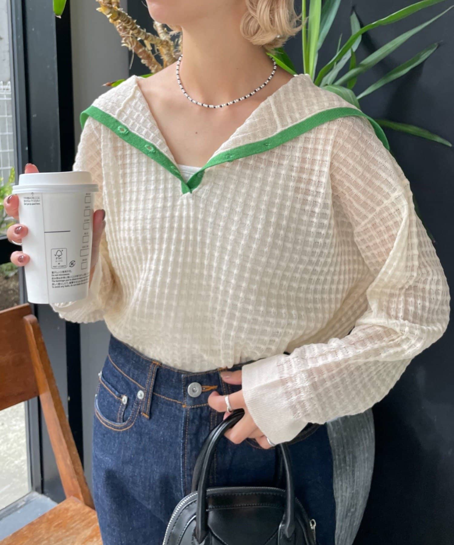 気分にピッタリなセーラーのショートニットはチョコチップのような色を選びました。