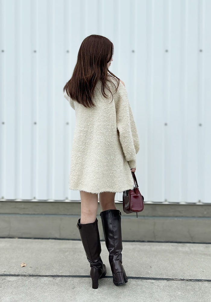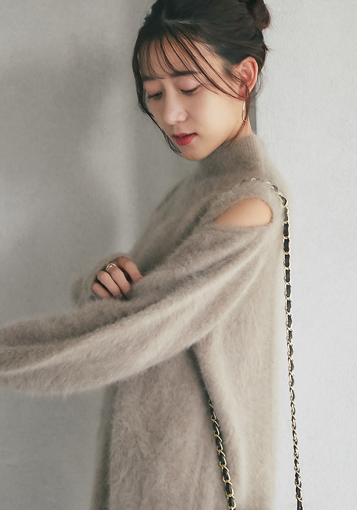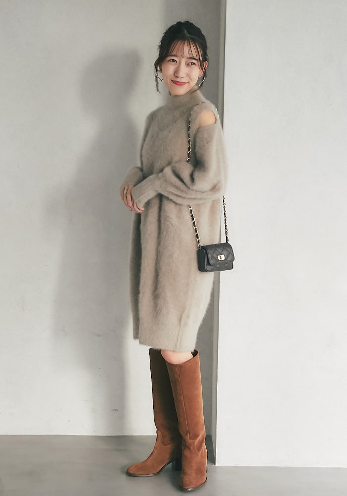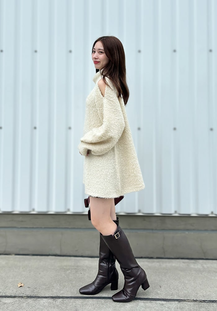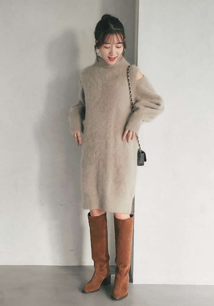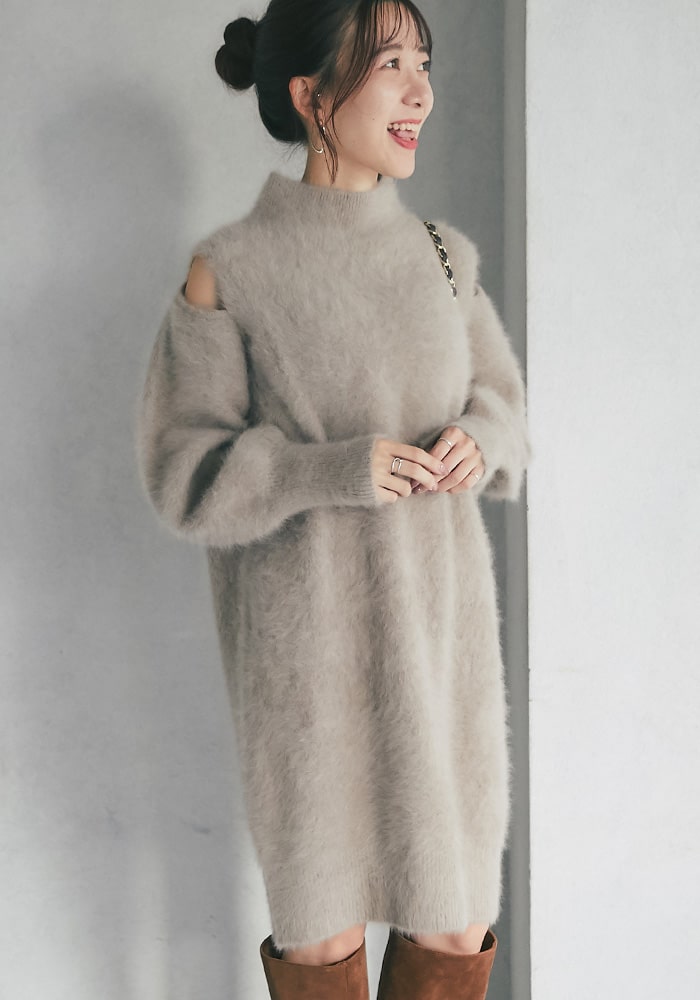 冬のデート服におすすめのミニワンピース。肩スリットでさりげない肌見せとAラインシルエットでスタイルアップも叶えてくれます!ラメとふわふわな素材感がポイントで、ショートパンツと合わせてチュニックとして着るのもおすすめです◎