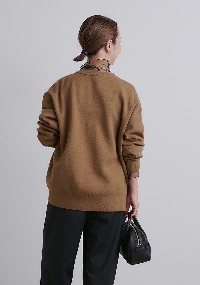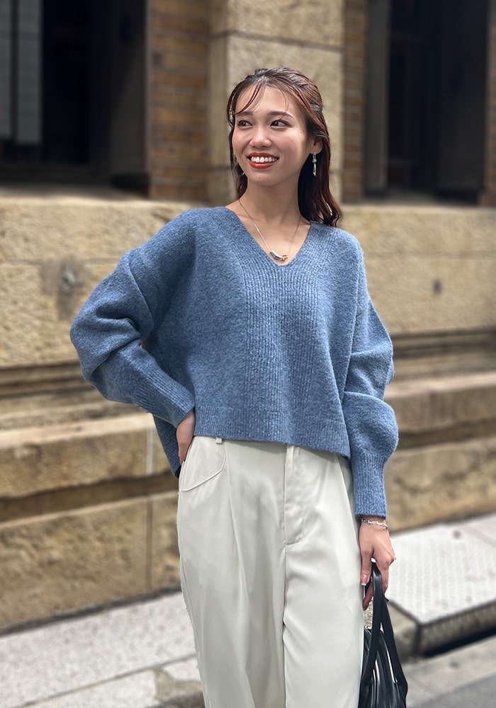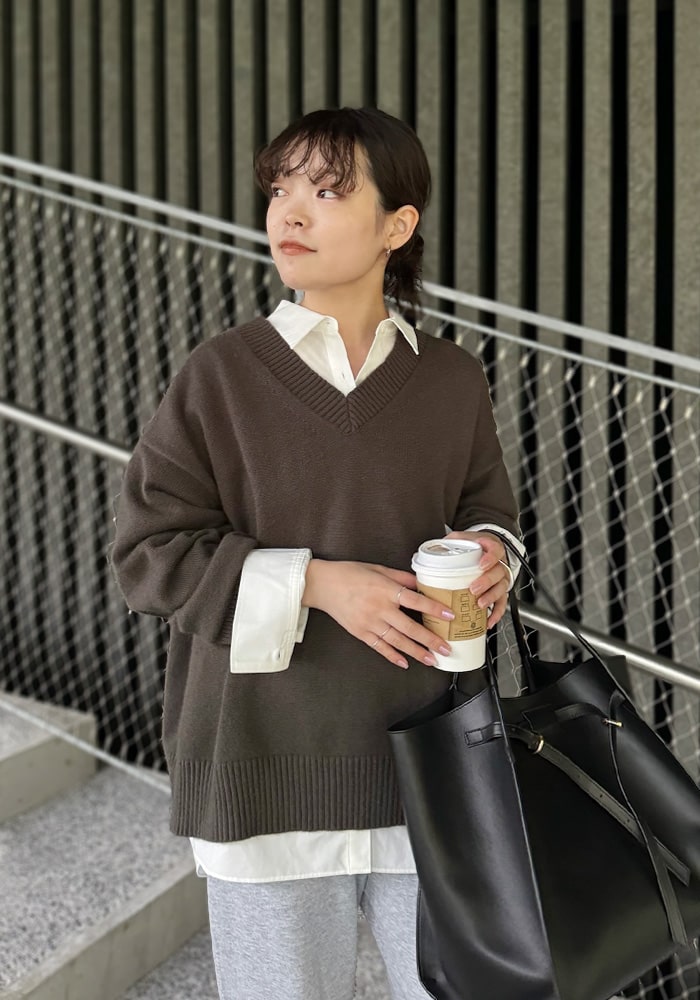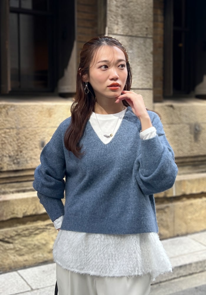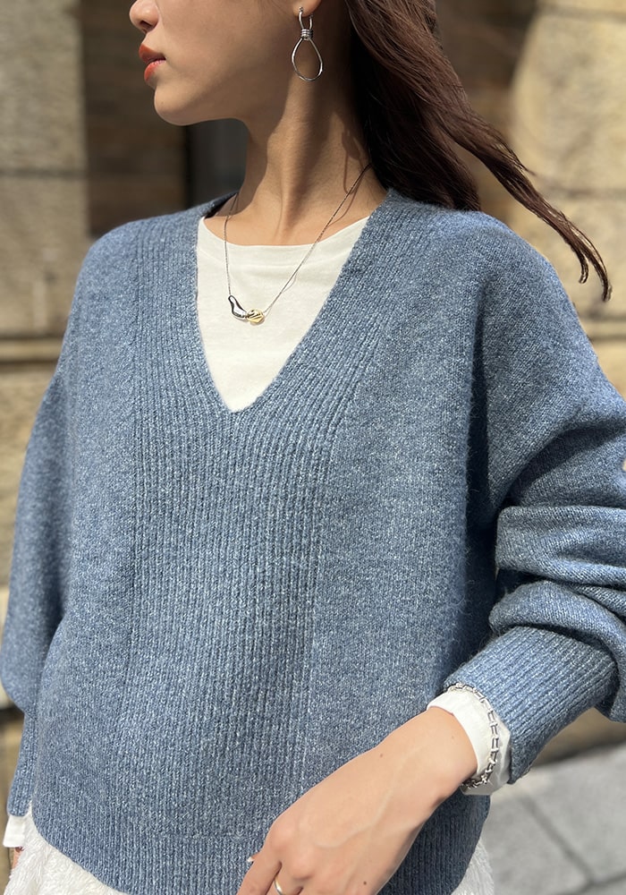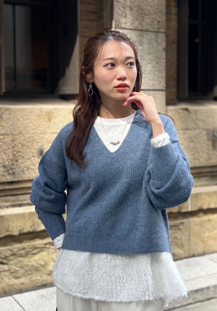 厚手のニットなど着膨れして見えやすい「骨格ストレート」の私が、Vネックの開き具合や着丈など着痩せするシルエットにこだわったニットです。これからの時季はシャツやブラウスをレイヤードしても素敵に着られるおすすめの一着です。