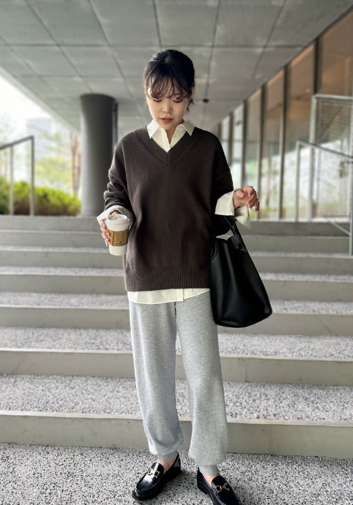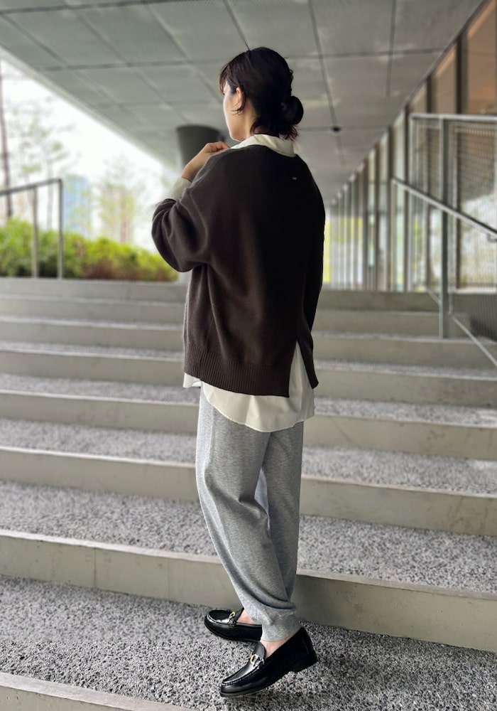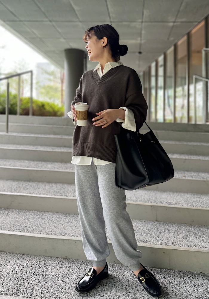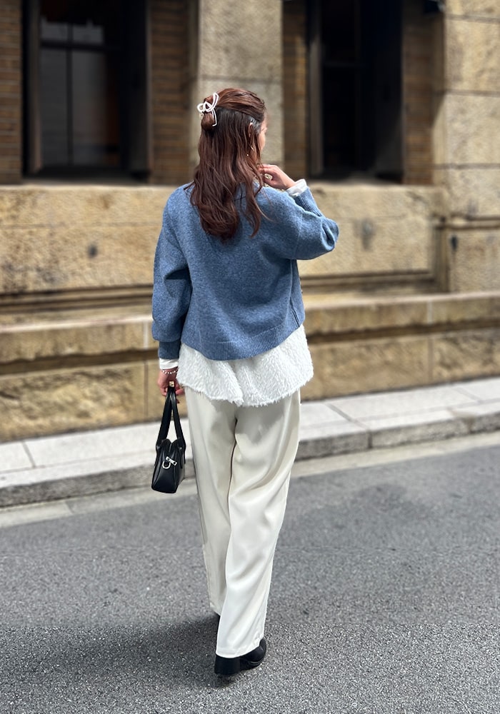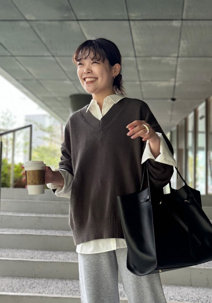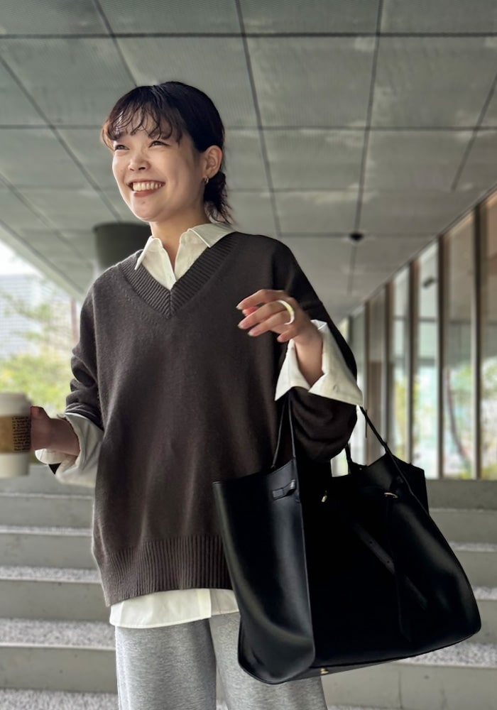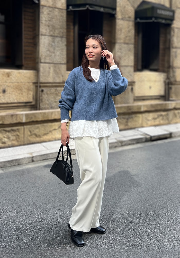 厚手のニットなど着膨れして見えやすい「骨格ストレート」の私が、Vネックの開き具合や着丈など着痩せするシルエットにこだわったニットです。これからの時季はシャツやブラウスをレイヤードしても素敵に着られるおすすめの一着です。