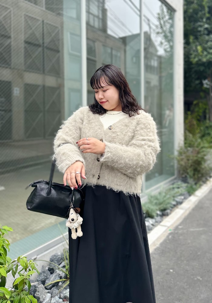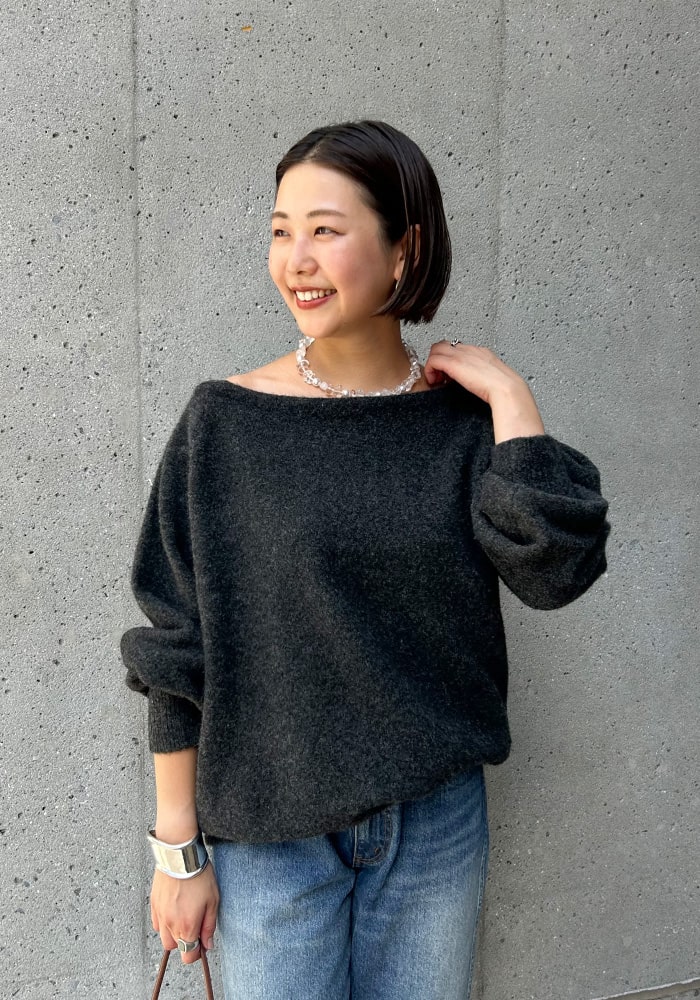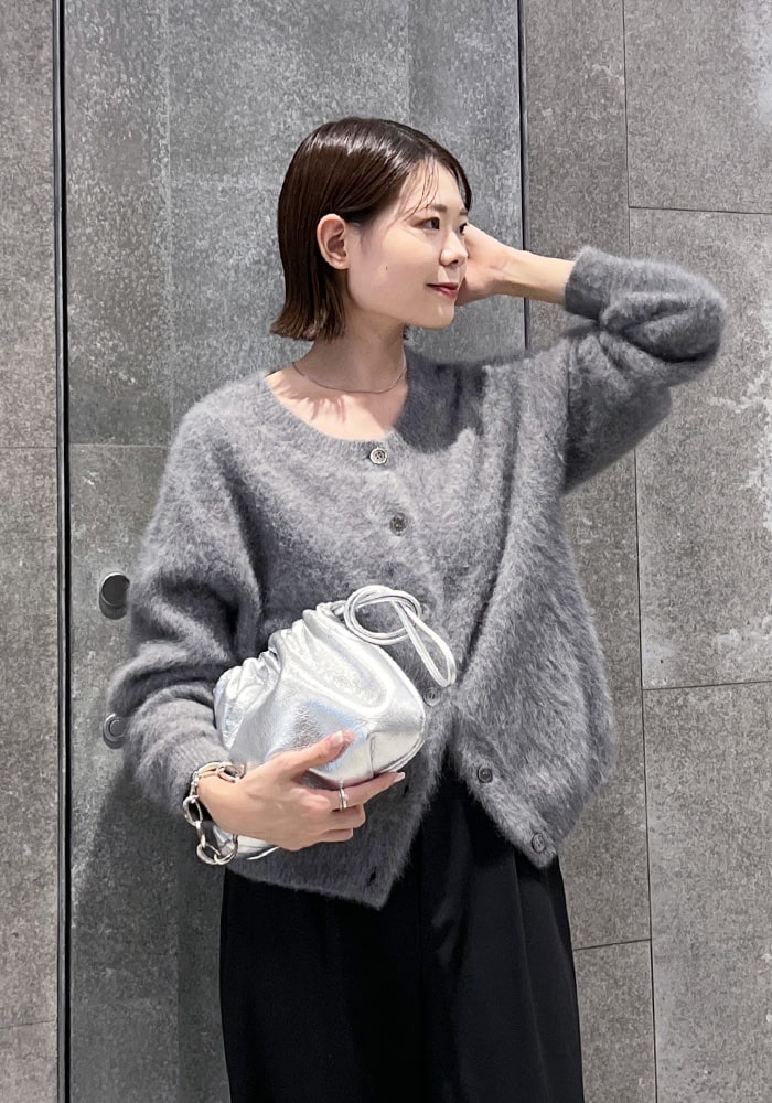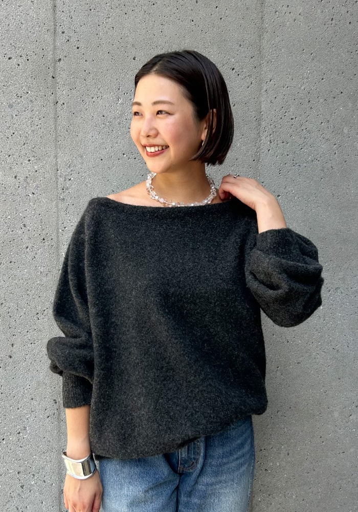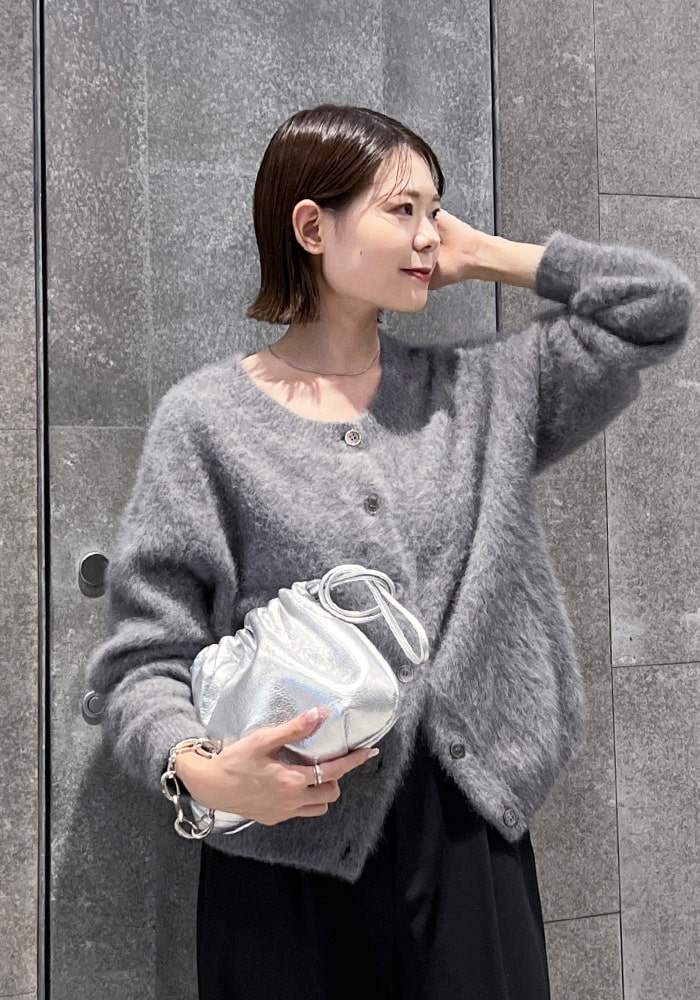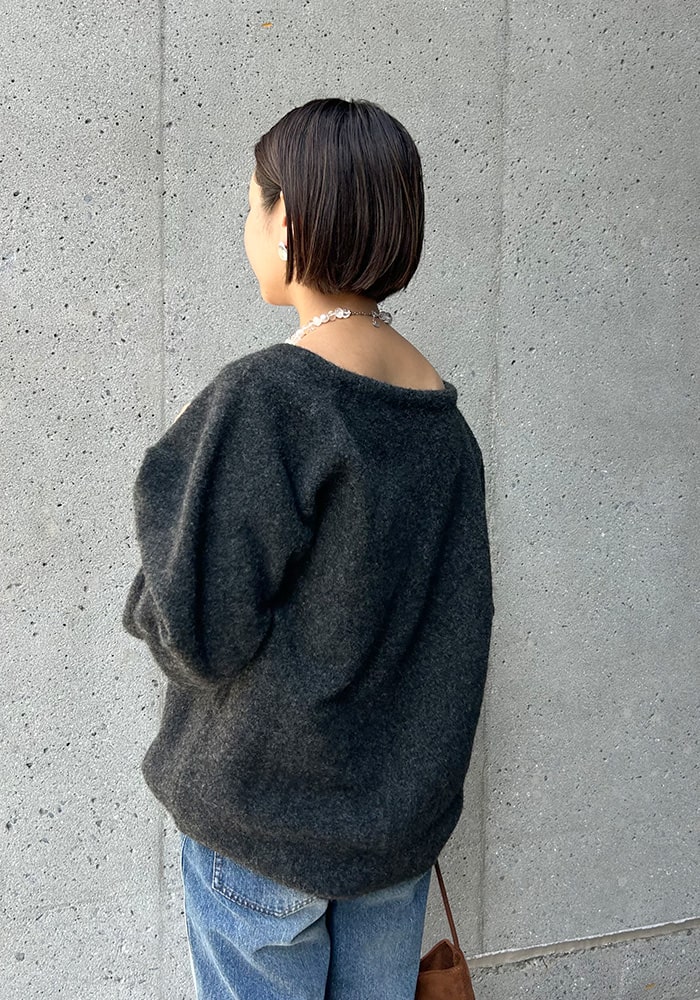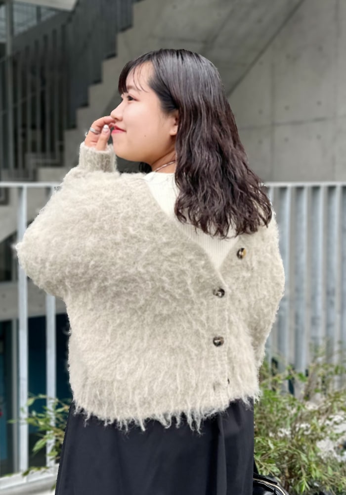 可愛いと思ったふわふわニットは着膨れして見えてしまう、、という悩みを解決できるようなニットを企画しました!落ち感のあるシャギー素材とスッキリ見えする首周りがポイント。着回ししやすいようにニットとカーディガンの2WAY仕様にしました。