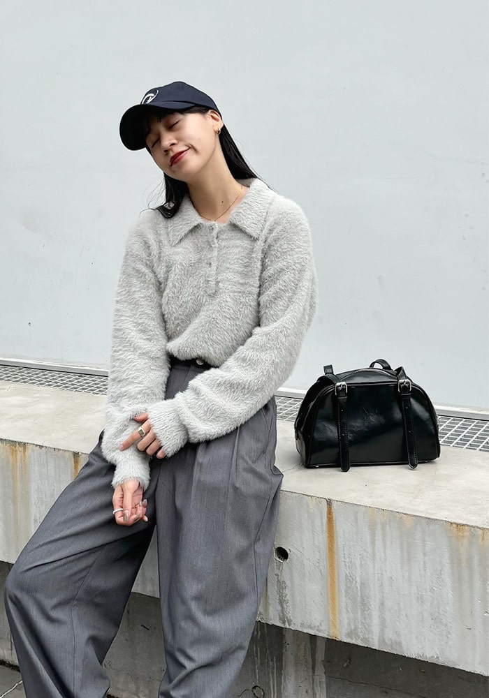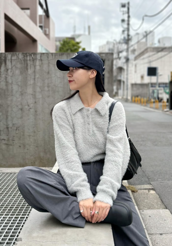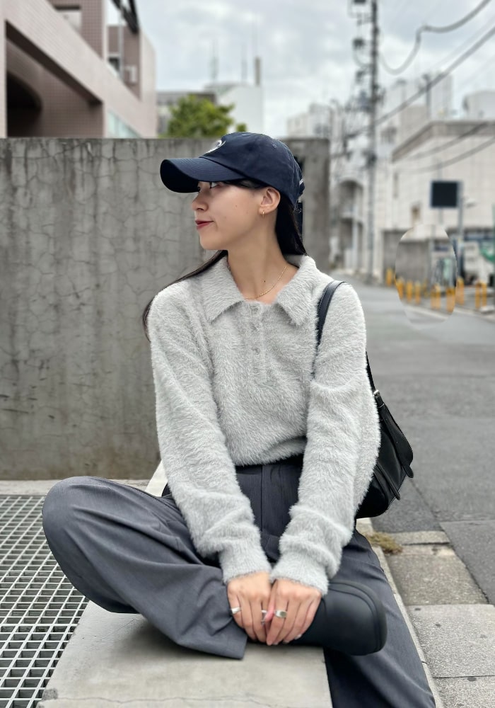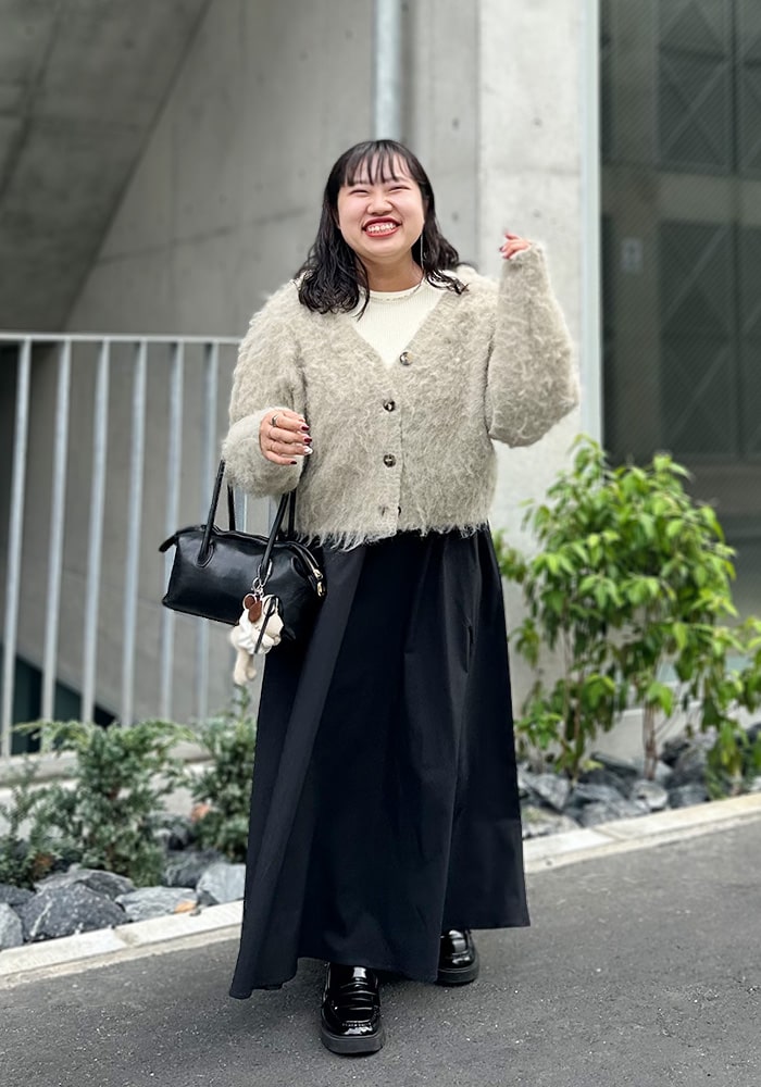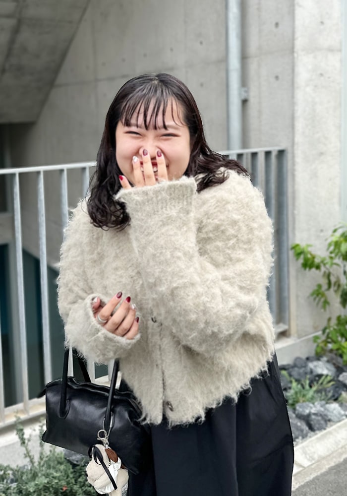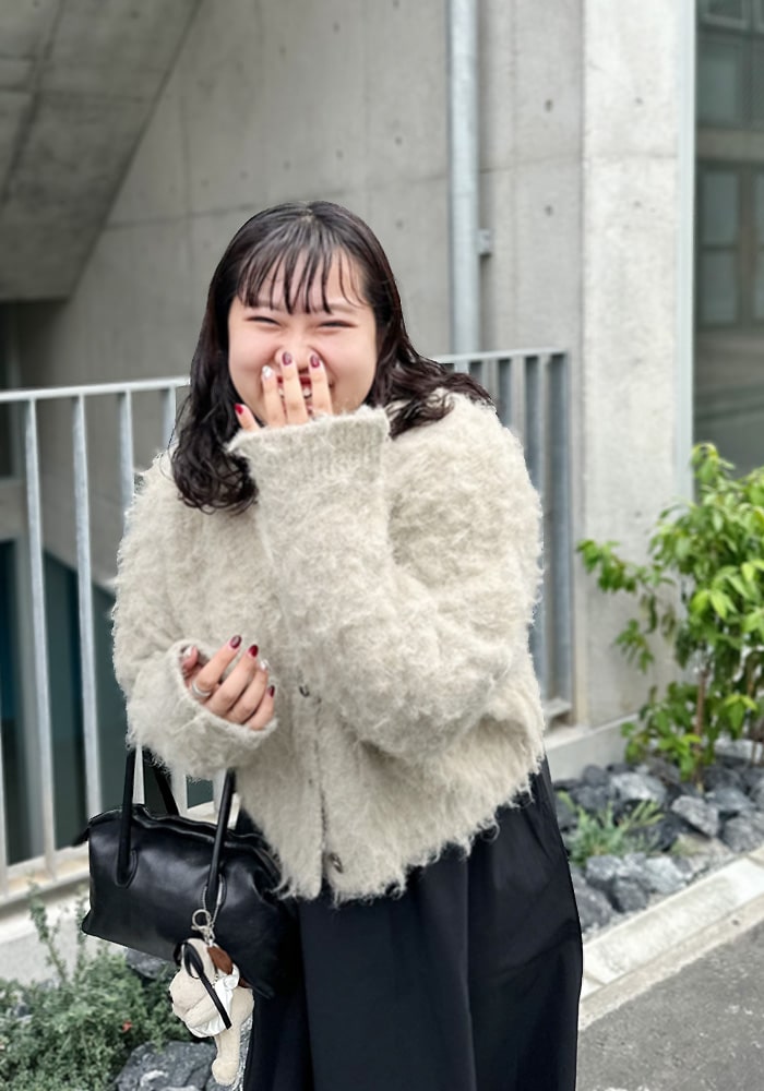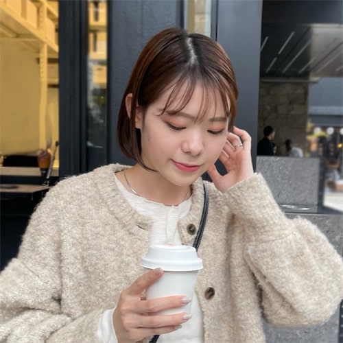 可愛いと思ったふわふわニットは着膨れして見えてしまう、、という悩みを解決できるようなニットを企画しました!落ち感のあるシャギー素材とスッキリ見えする首周りがポイント。着回ししやすいようにニットとカーディガンの2WAY仕様にしました。