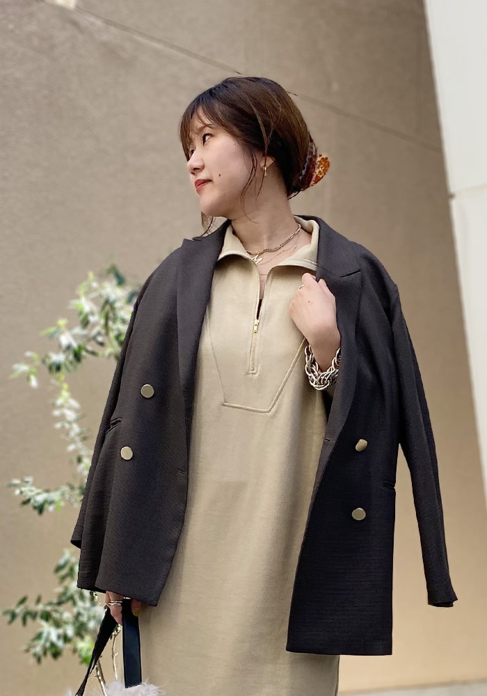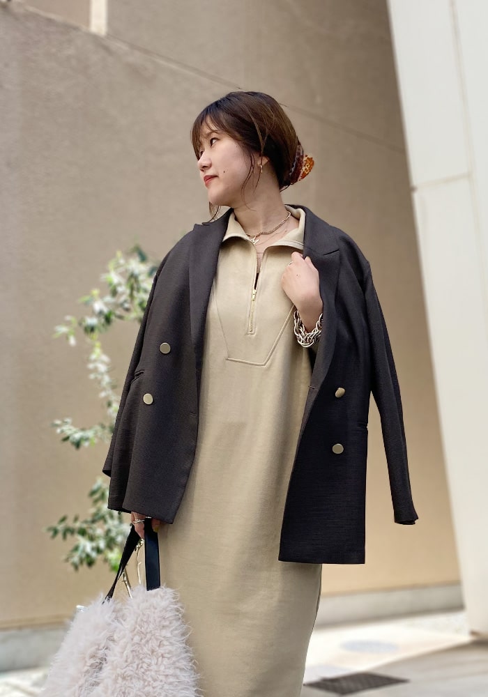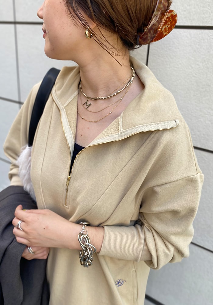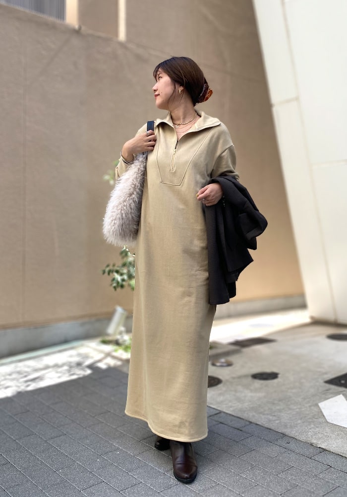 一枚で秋のスタイリングが完成するワンピース。着心地の良いスウェット素材なので、身体のラインを拾わずに安心して着られます。ポケットにあるDOUDOUの刺繍はさりげないワンポイントに!ジップを閉じるとまた違った雰囲気を楽しめますよ。