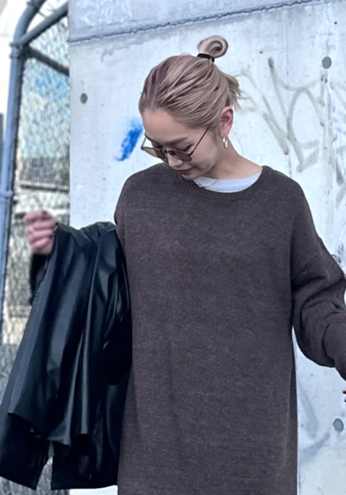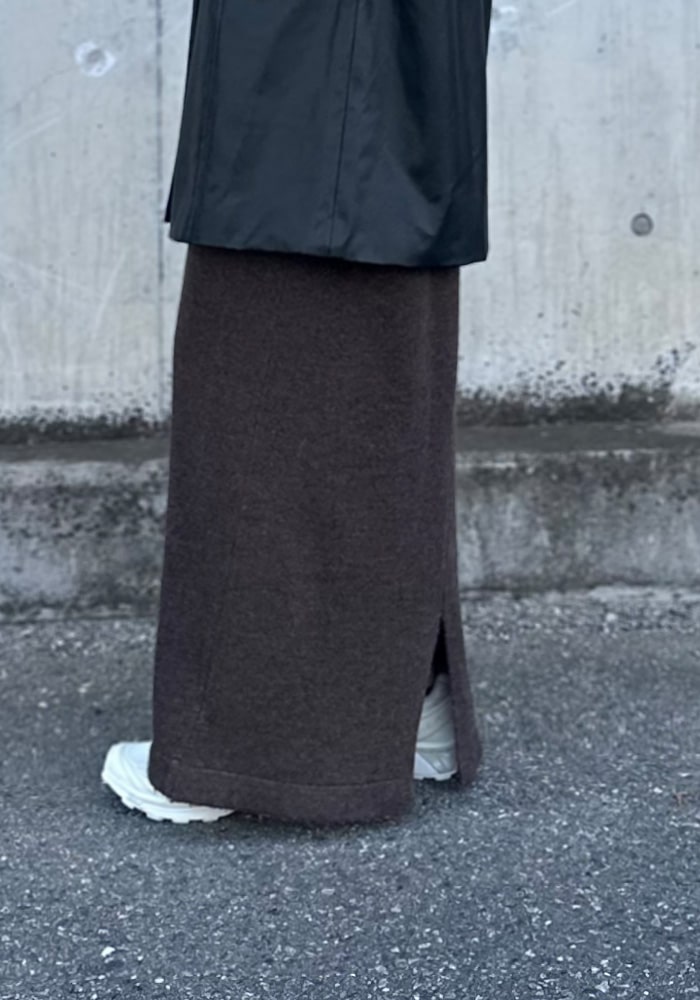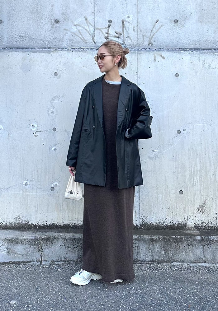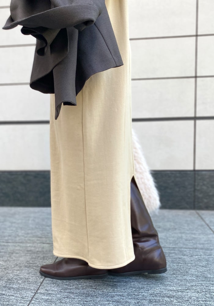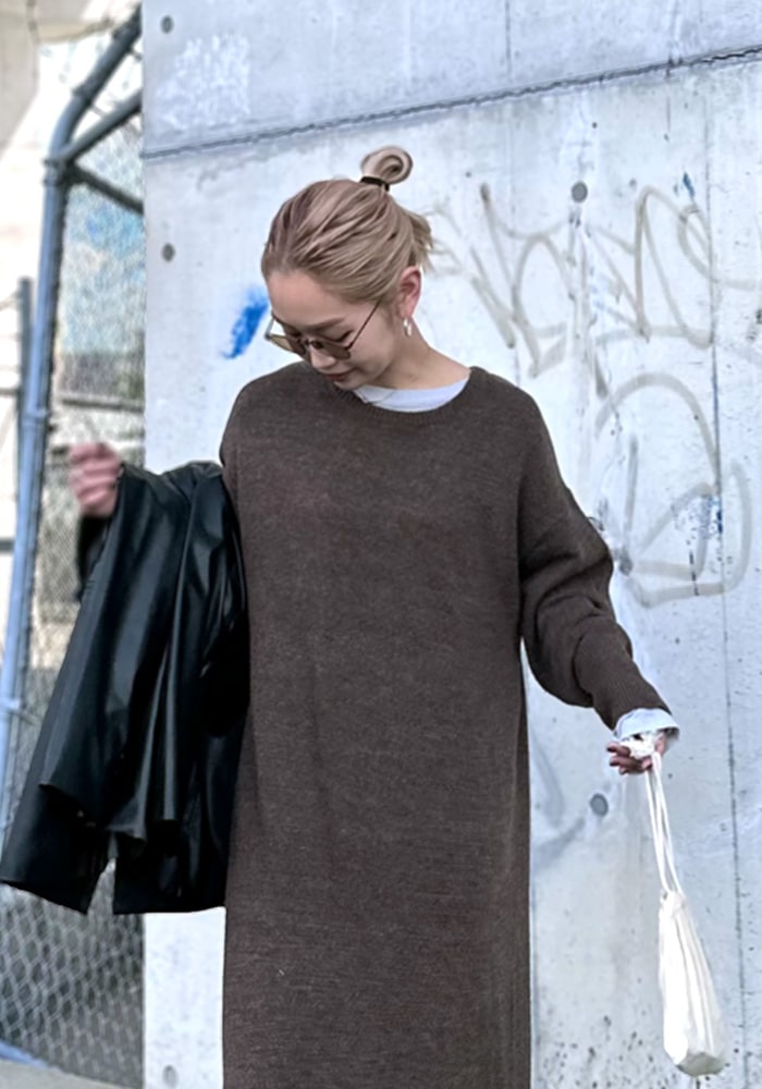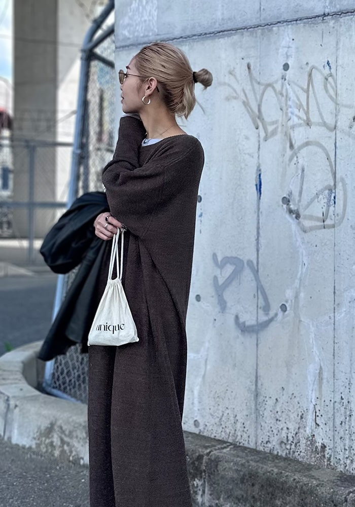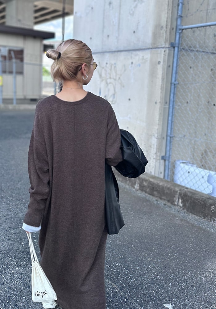 足首まで隠れるズルっとしたニットワンピースが欲しいと思って企画しました!バックスタイルには深すぎないスリットを入れているので一枚でもお洒落見えします。落ち感があり体のラインが出にくいので、体系カバーができるのも嬉しいポイント!是非この秋冬色んなコーディネートに取り入れていただきたいです。