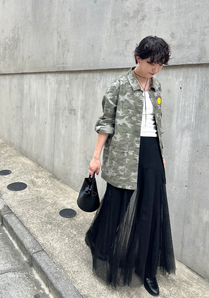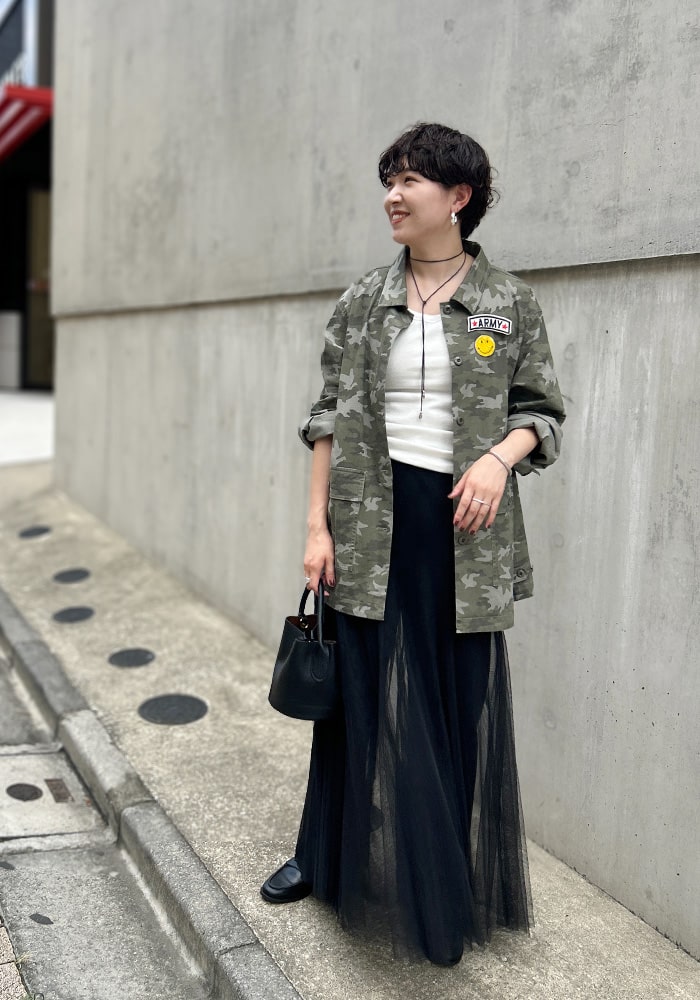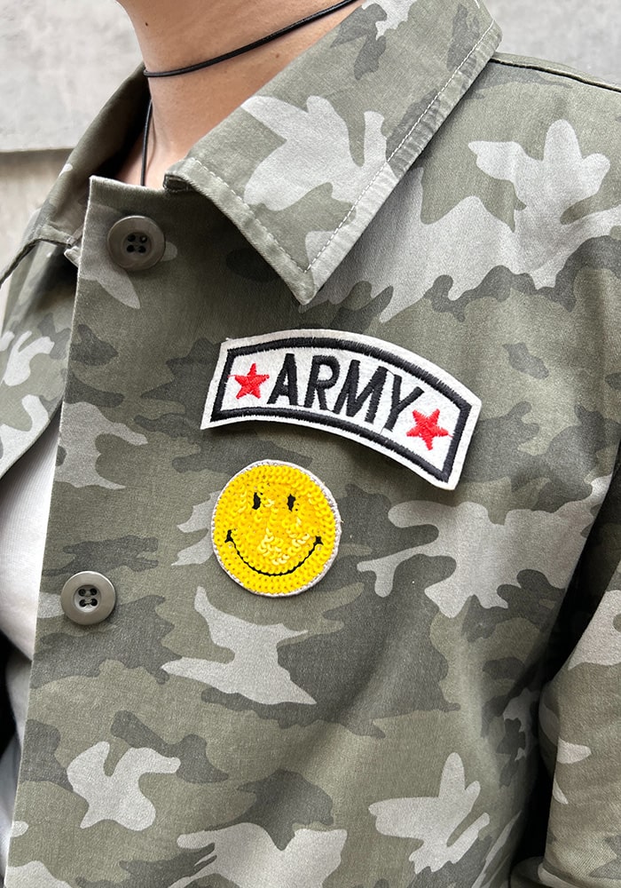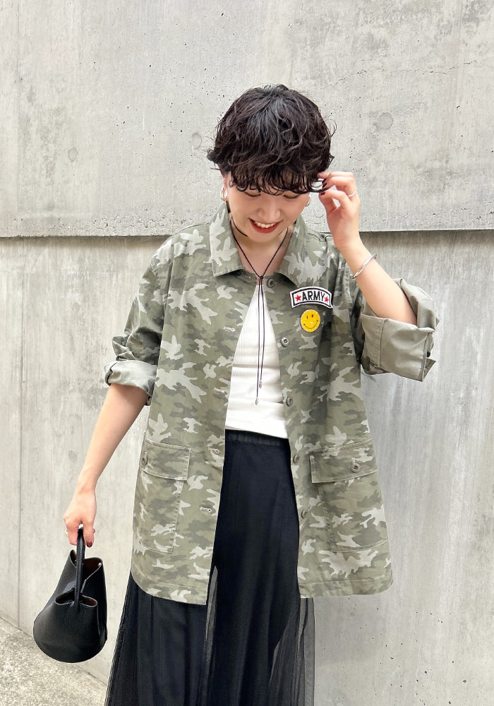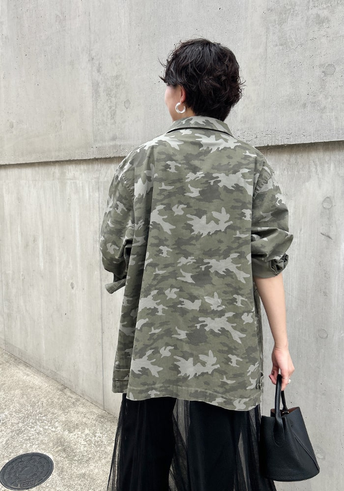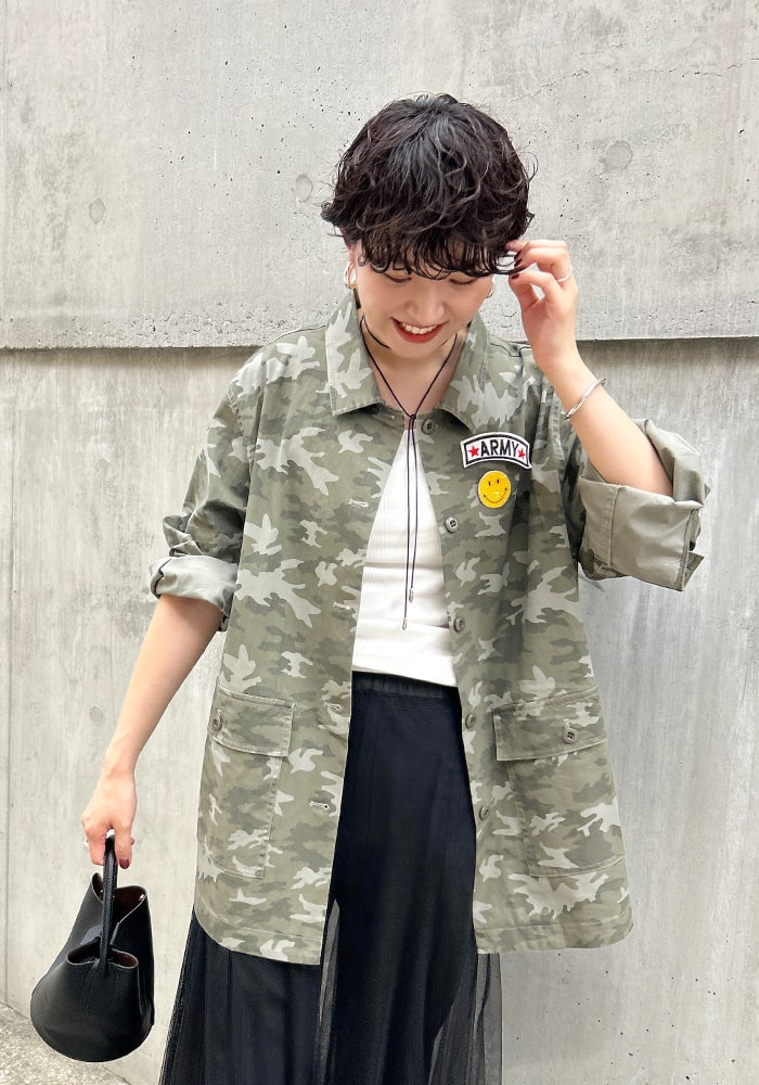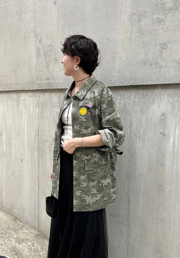 カッコいいイメージのミリタリージャケットに、遊び心のあるピンバッジをセットにしました。少しオーバーなシルエットですが、柔らかい素材なので着心地も良く女性らしく羽織れます。ミリタリー好きな方はもちろん、あまり着たことがない方にもチャレンジしやすいこだわりの詰まったジャケットです。