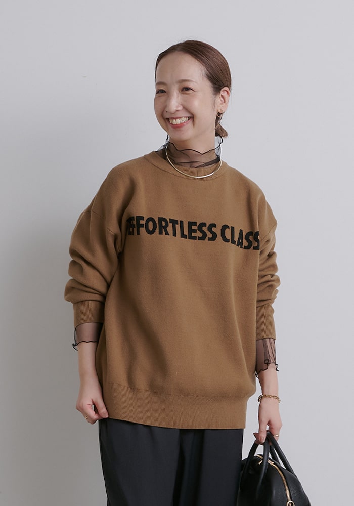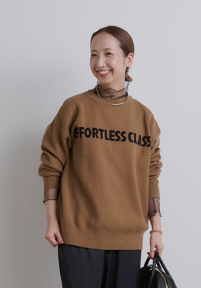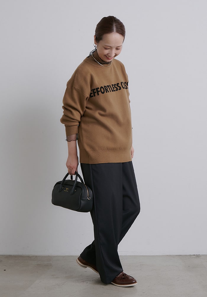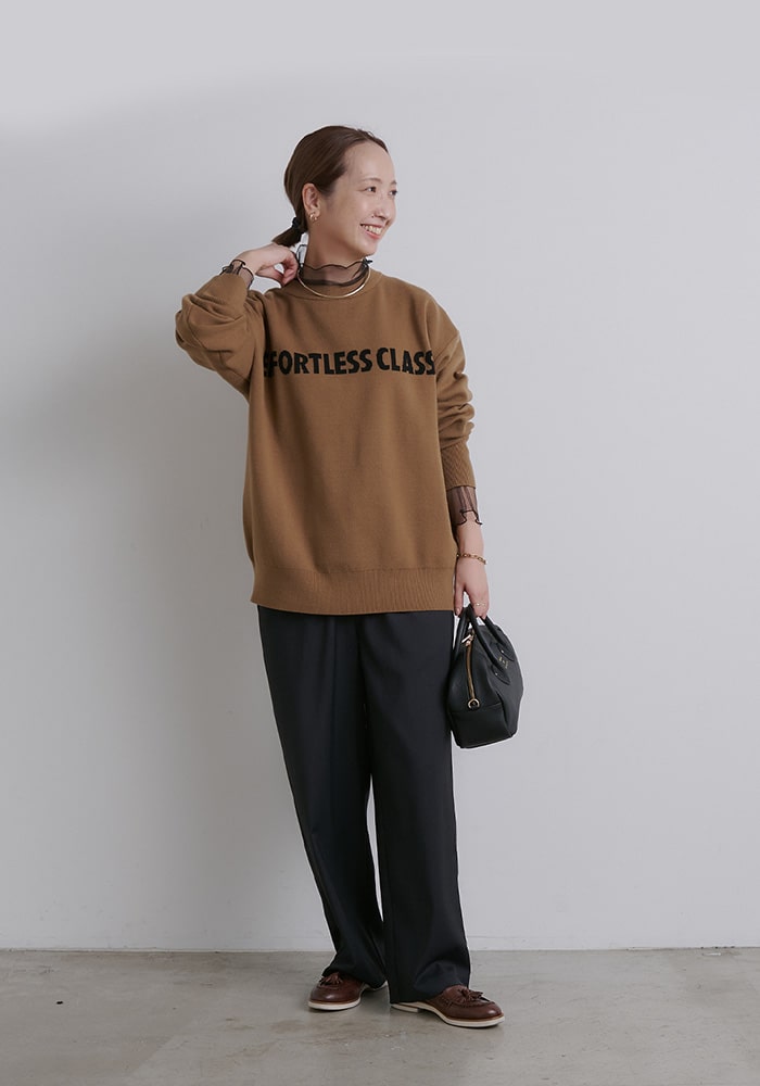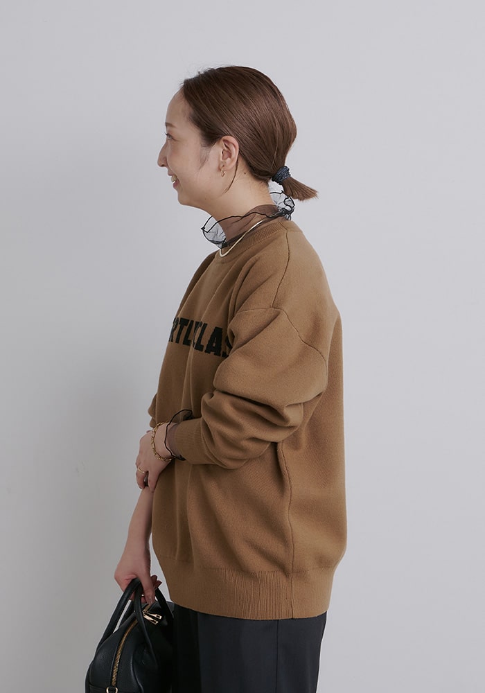 ボトムスとの相性を考えたサイジングに仕上げ、スウェットのような感覚でデイリーに着たくなるデザインにしました。企画段階からこだわった大人見えするロゴのバランスや配色などもポイントです。