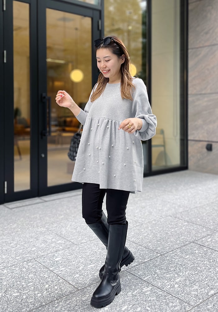 体型カバーができるのにスッキリ見えする可愛いアイテムを作りました!スウェットライクなニットなのでチクチク感がなく、着心地が良いところもポイント◎ゆるっとしたサイズ感ですが、セットインスリーブなので骨ストでもスッキリ着れます。