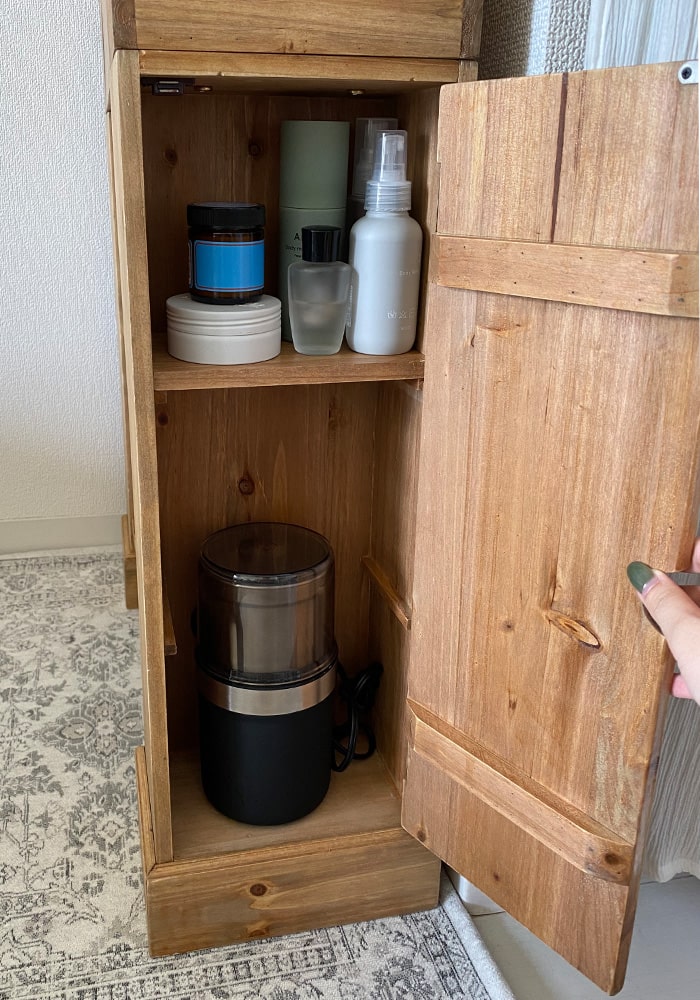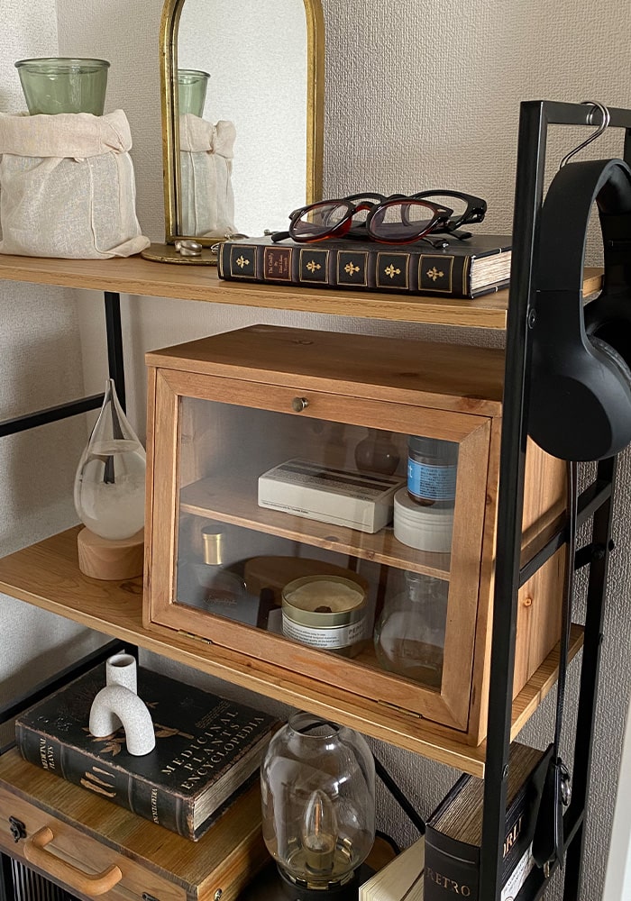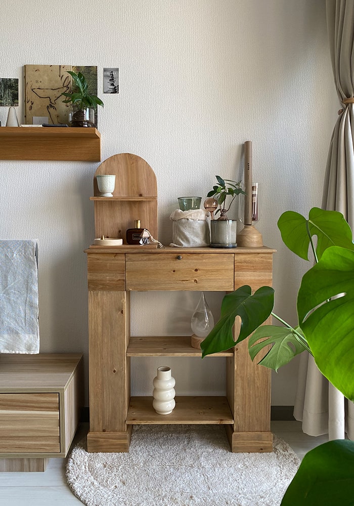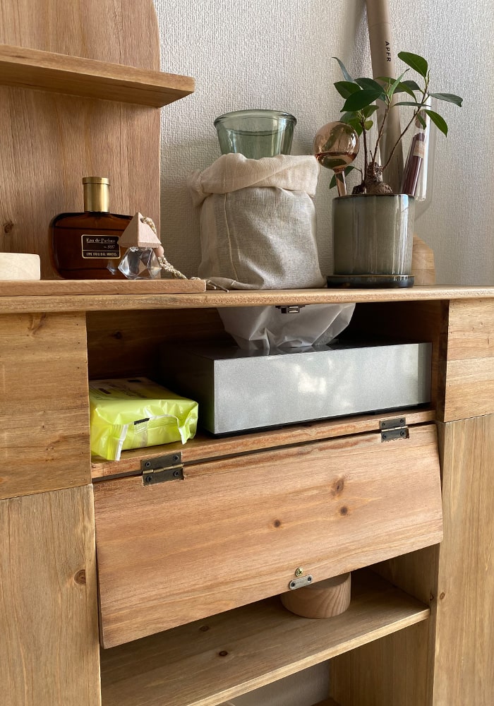 飾るだけでなく、収納力にもこだわった「魅せる」と「隠す」を両立するマントルピース。生活感を隠せる正面の扉収納に加え、左右にも取り外し可能な中板付きの扉収納を備え、たっぷり収納できるのがポイントです。