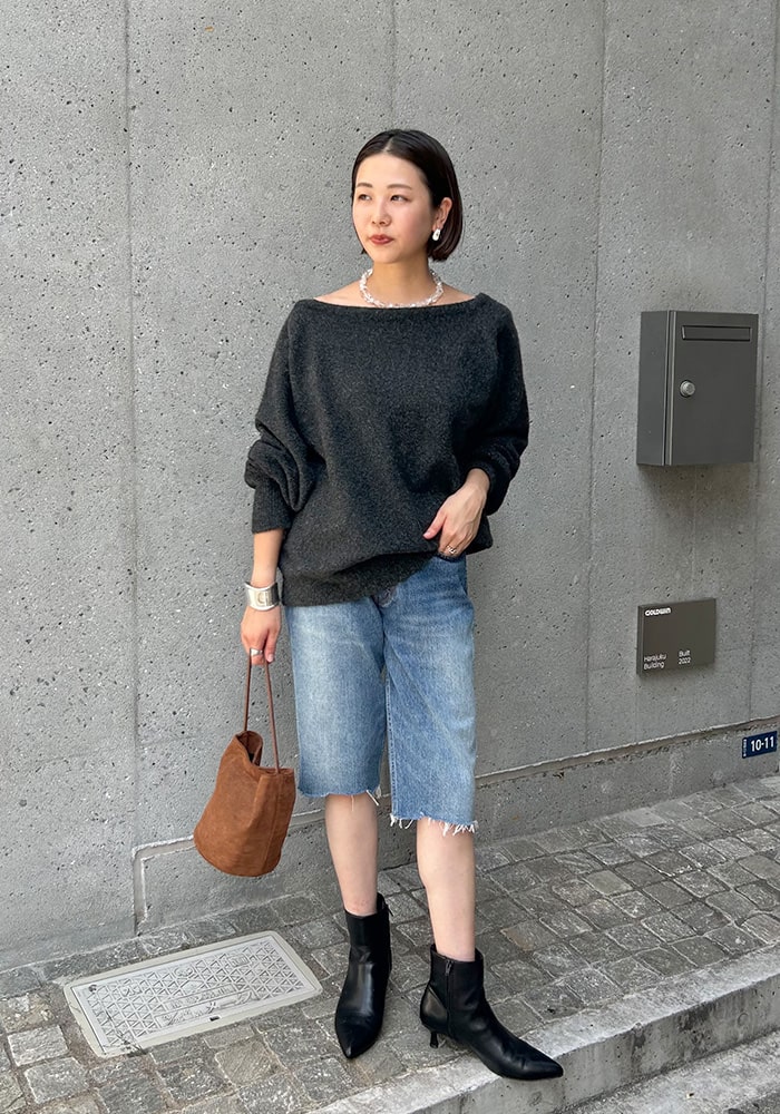 SHENERYインフルエンサー鶴ヶ崎企画第二弾!今回は大人カジュアルなオフショルニットをご用意しました。トレンド要素もありつつ、ほどよい肌見せで抜け感のあるスタイリングに仕上がります◎