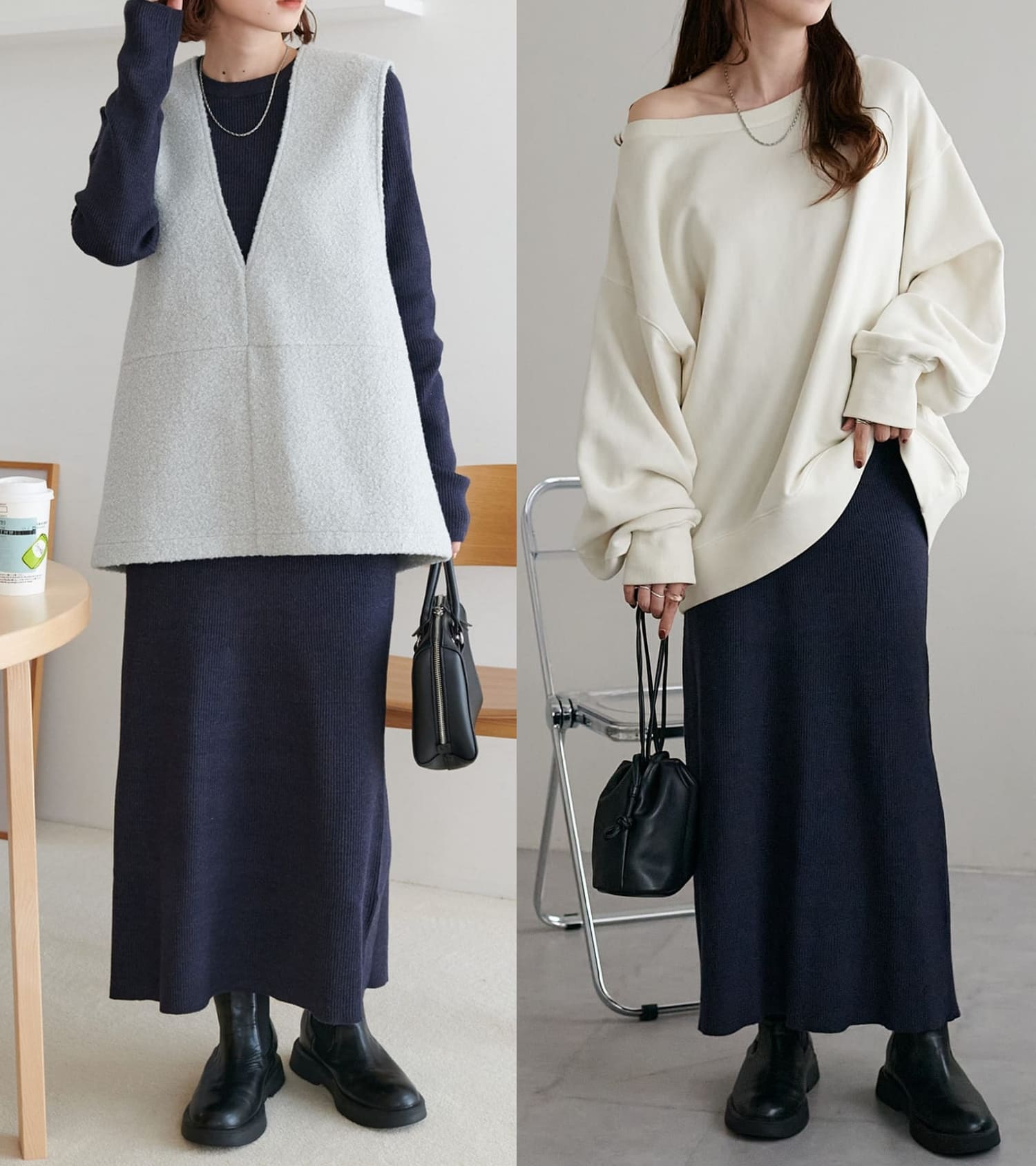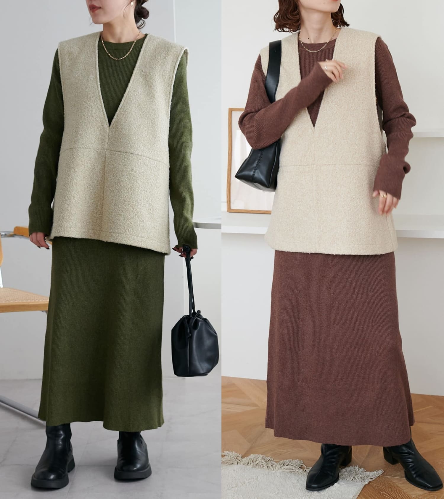ニット素材のセットアップなのに体のラインがピタっと出ることはなく、ベストが気になるところをちょうど隠してくれるので、ホントに可愛く着られます♡♡