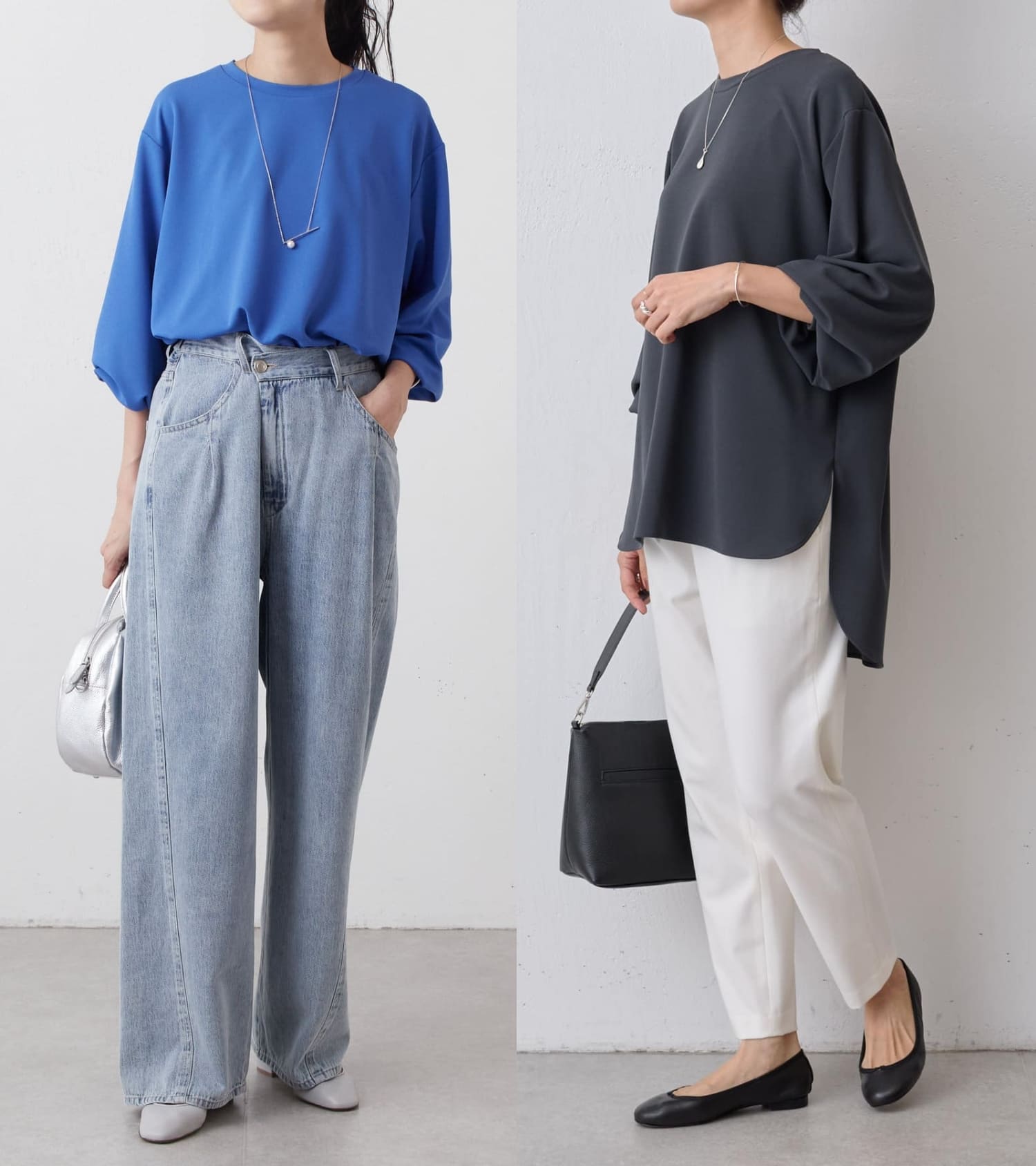 シャツよりもシワや透け感も気にならなず扱いやすく、Tシャツよりもきちんと感が出て身体のラインも拾わないので、ヘビロテしてます。