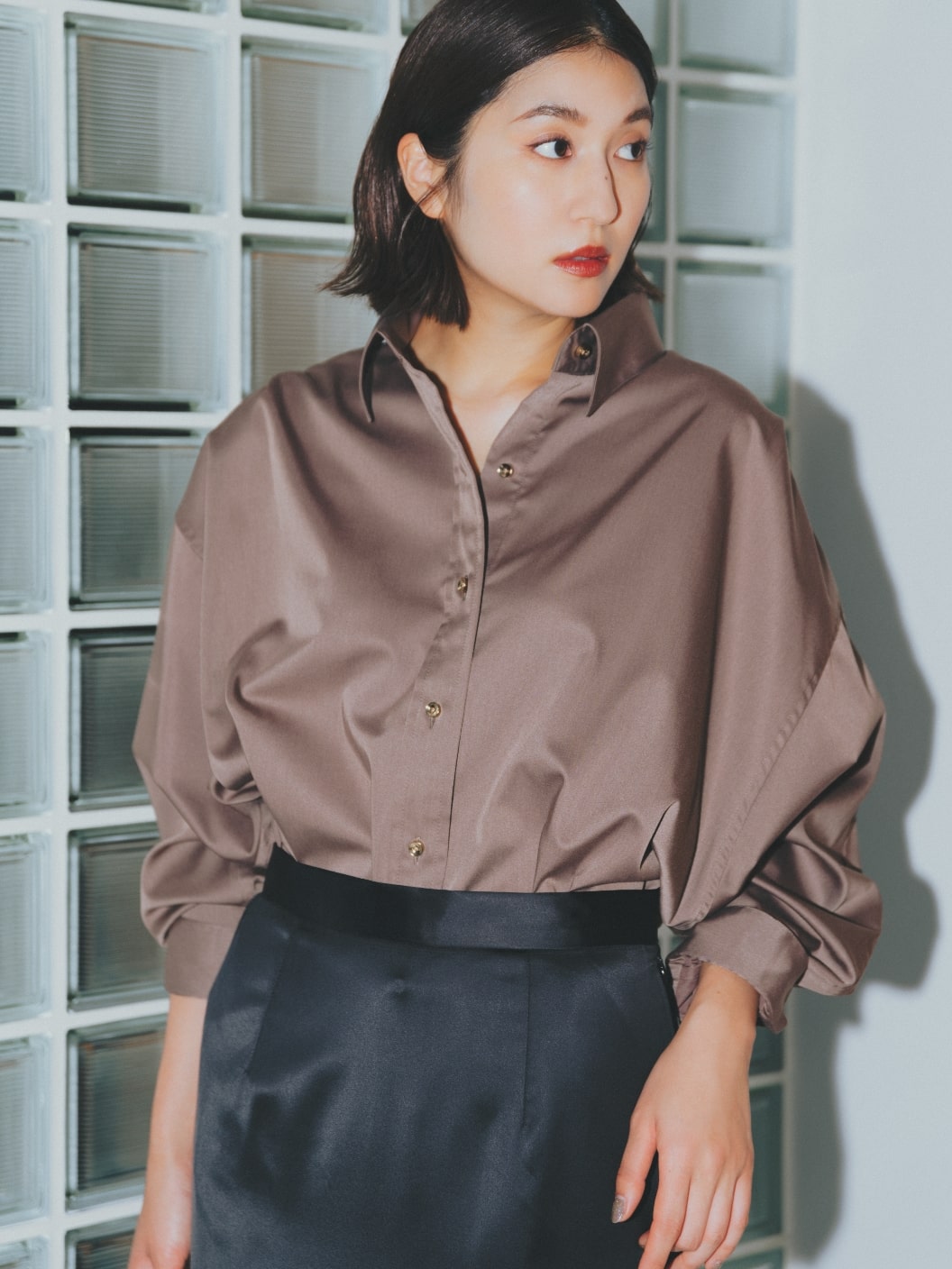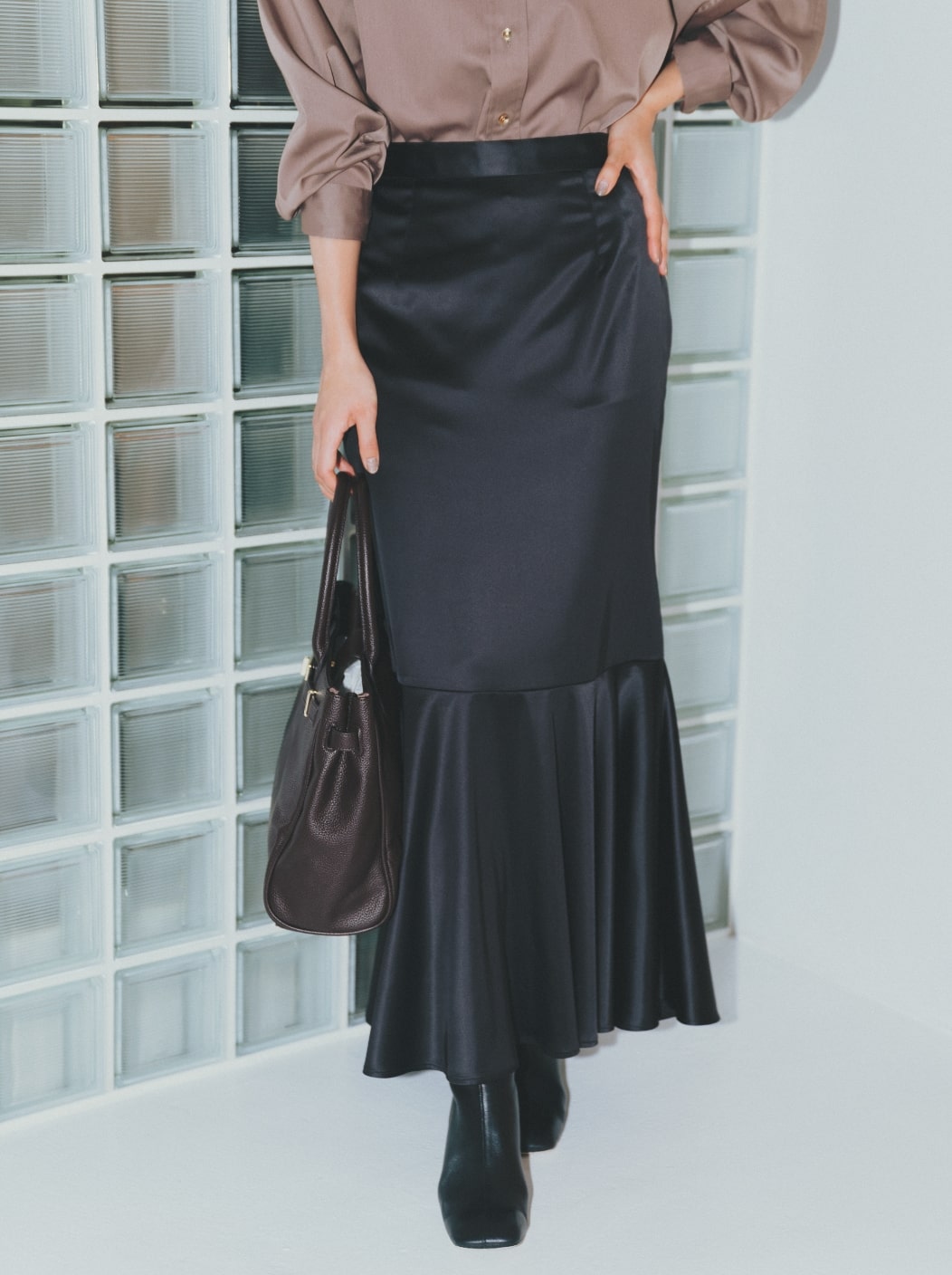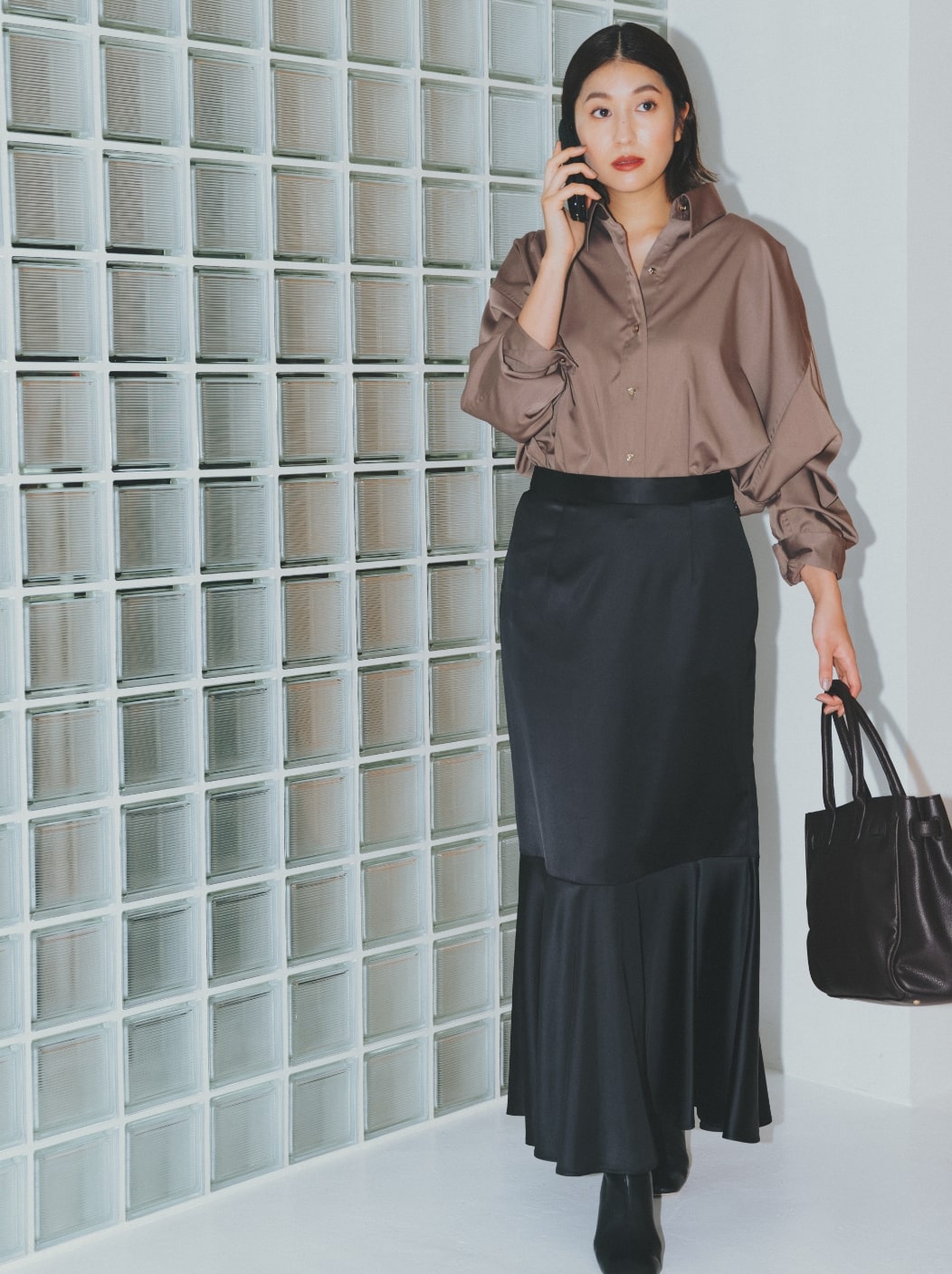 ツヤ感のあるトップス×マーメイドスカートを合わせて女性らしい身体のラインを演出。