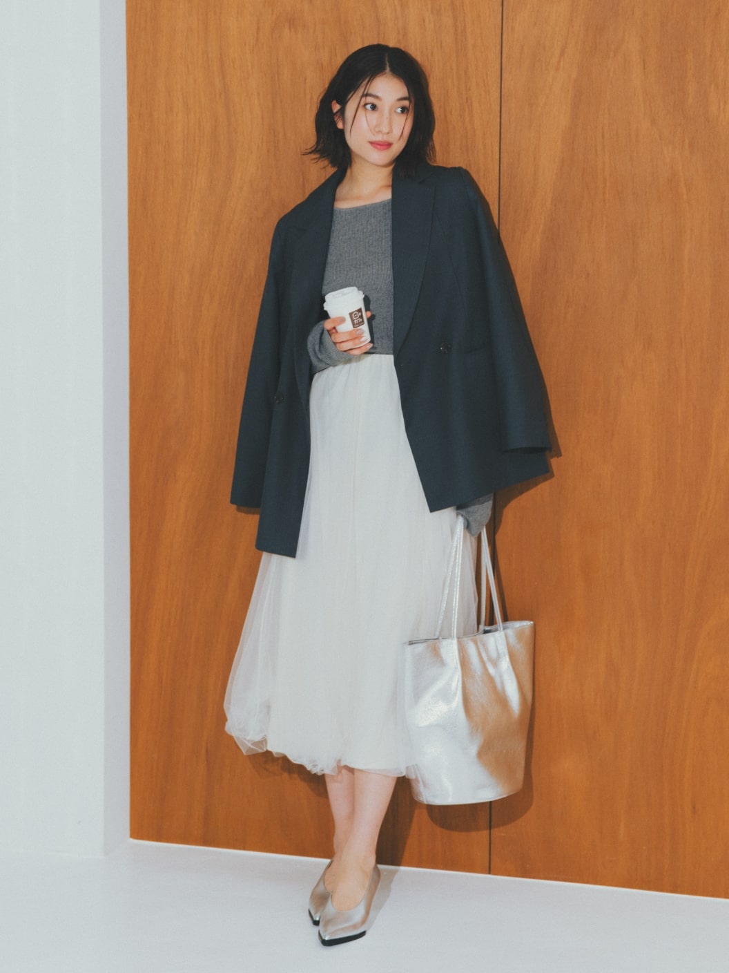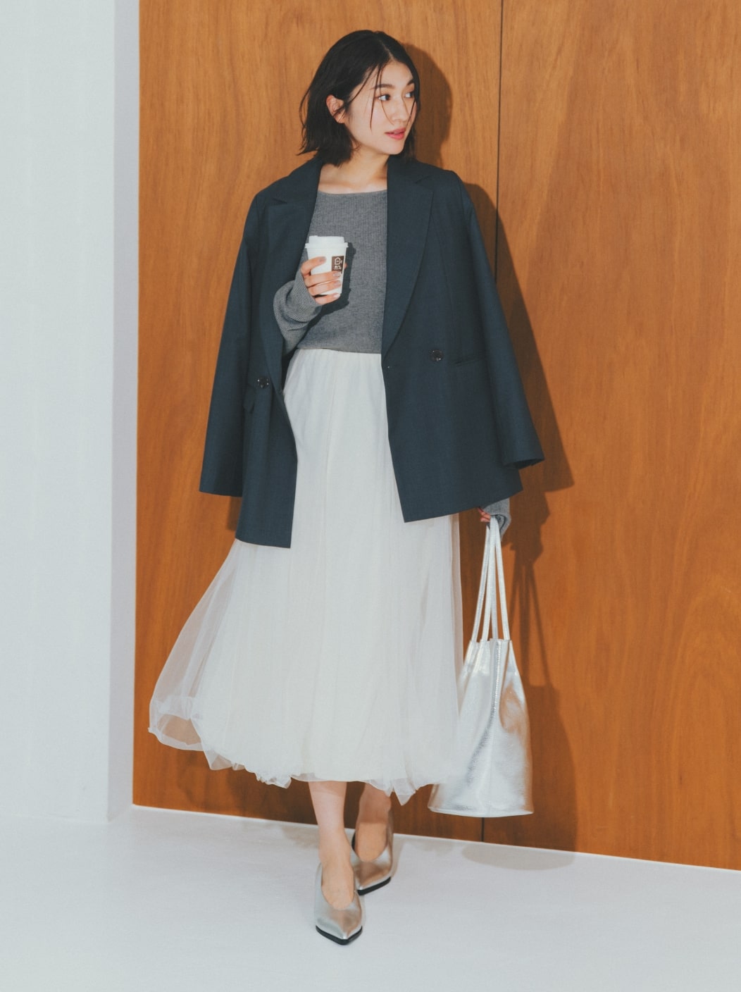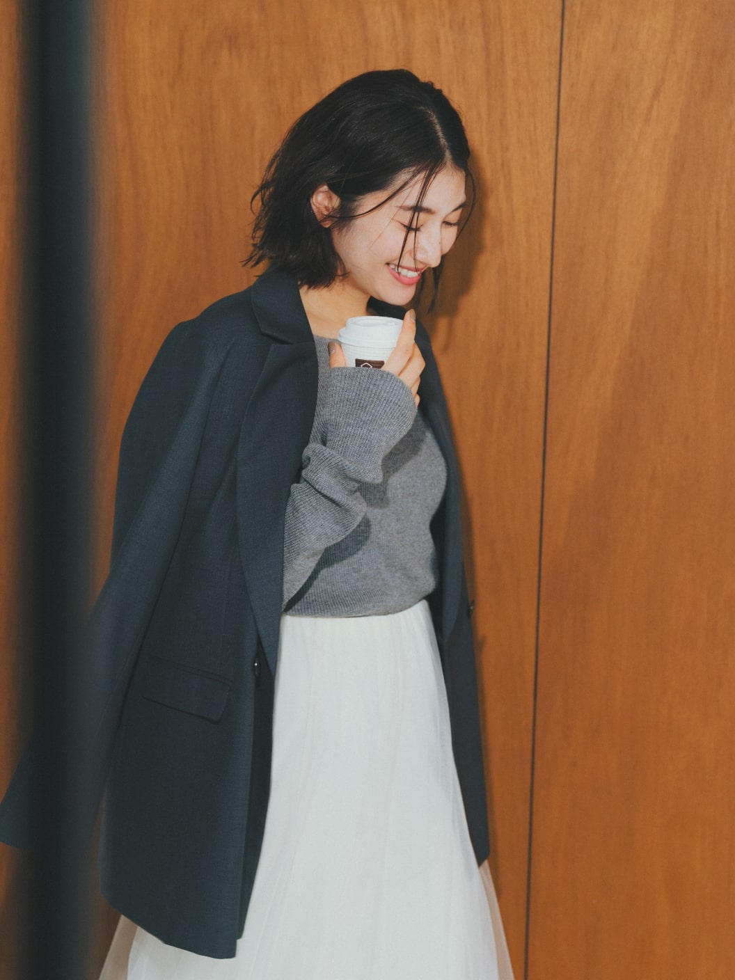 フェミニン派にお馴染みの白のスカートはグレーのジャケットを合わせて知的な雰囲気に。
