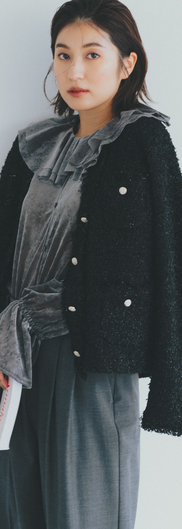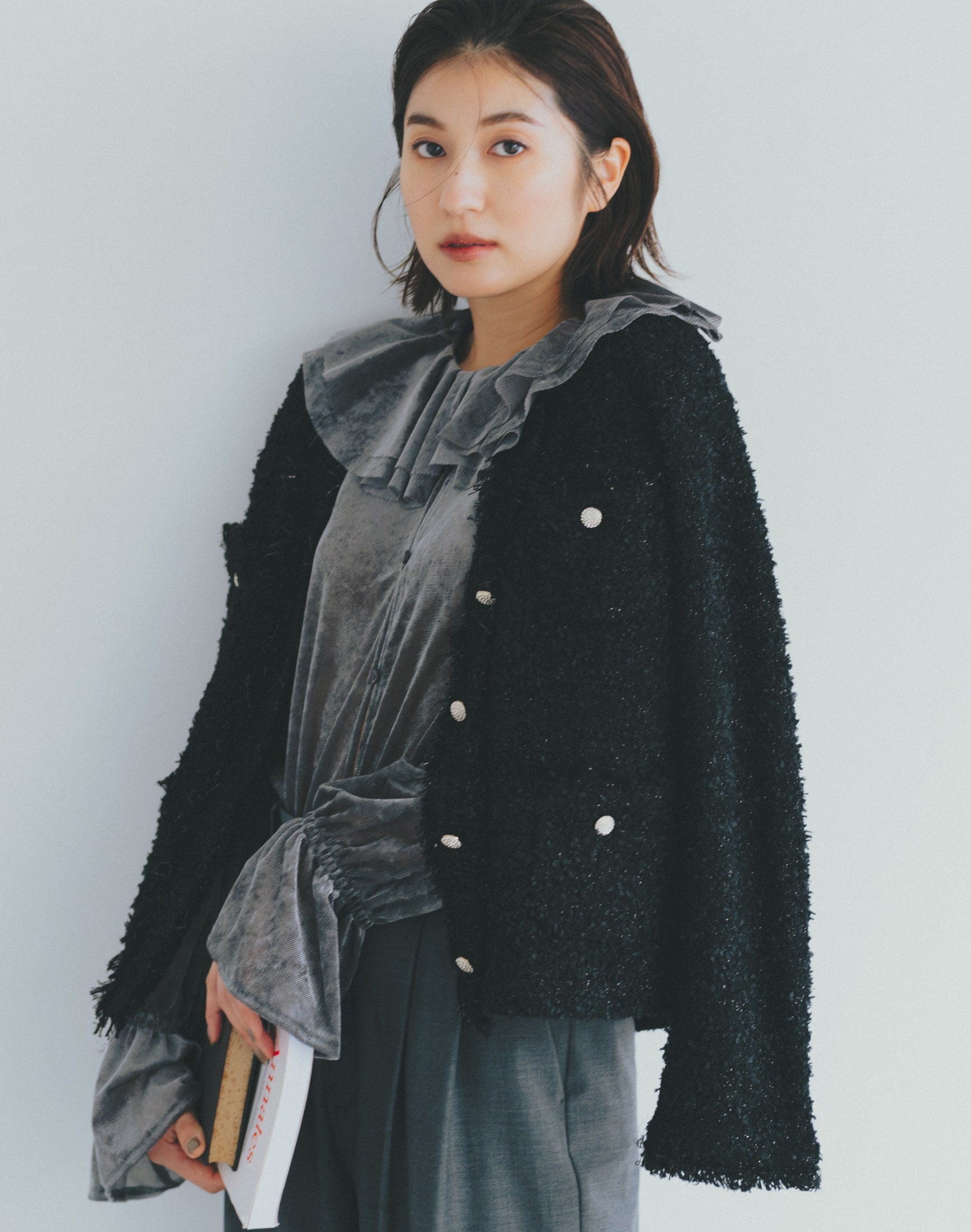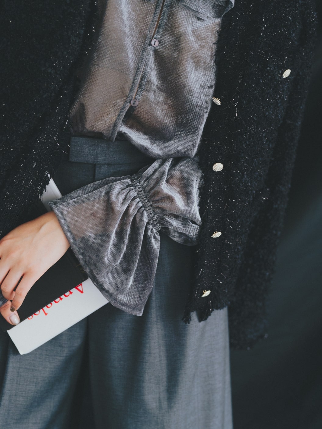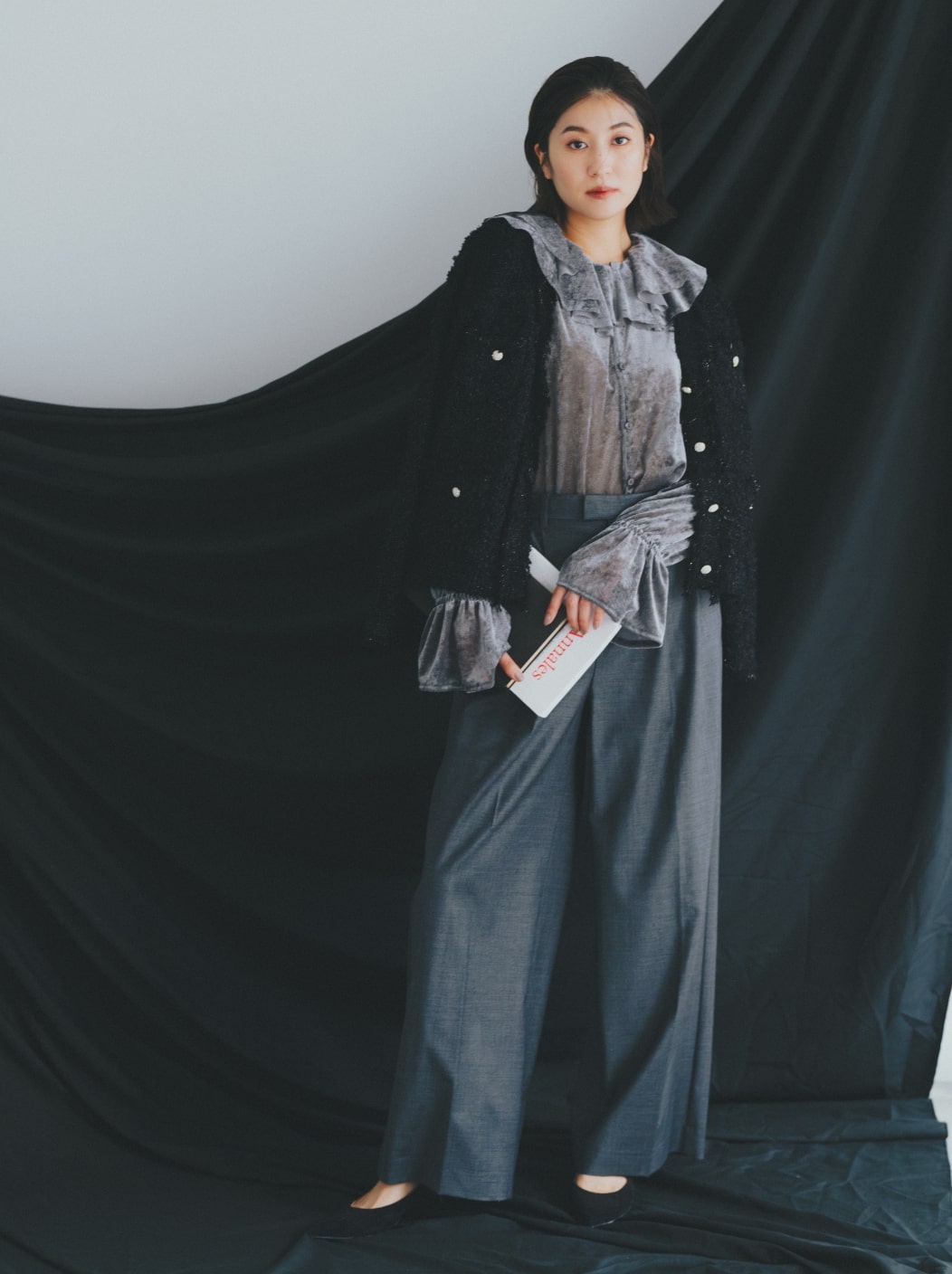 モノトーンでまとめれば甘いデザインのブラウスもクールな印象に。