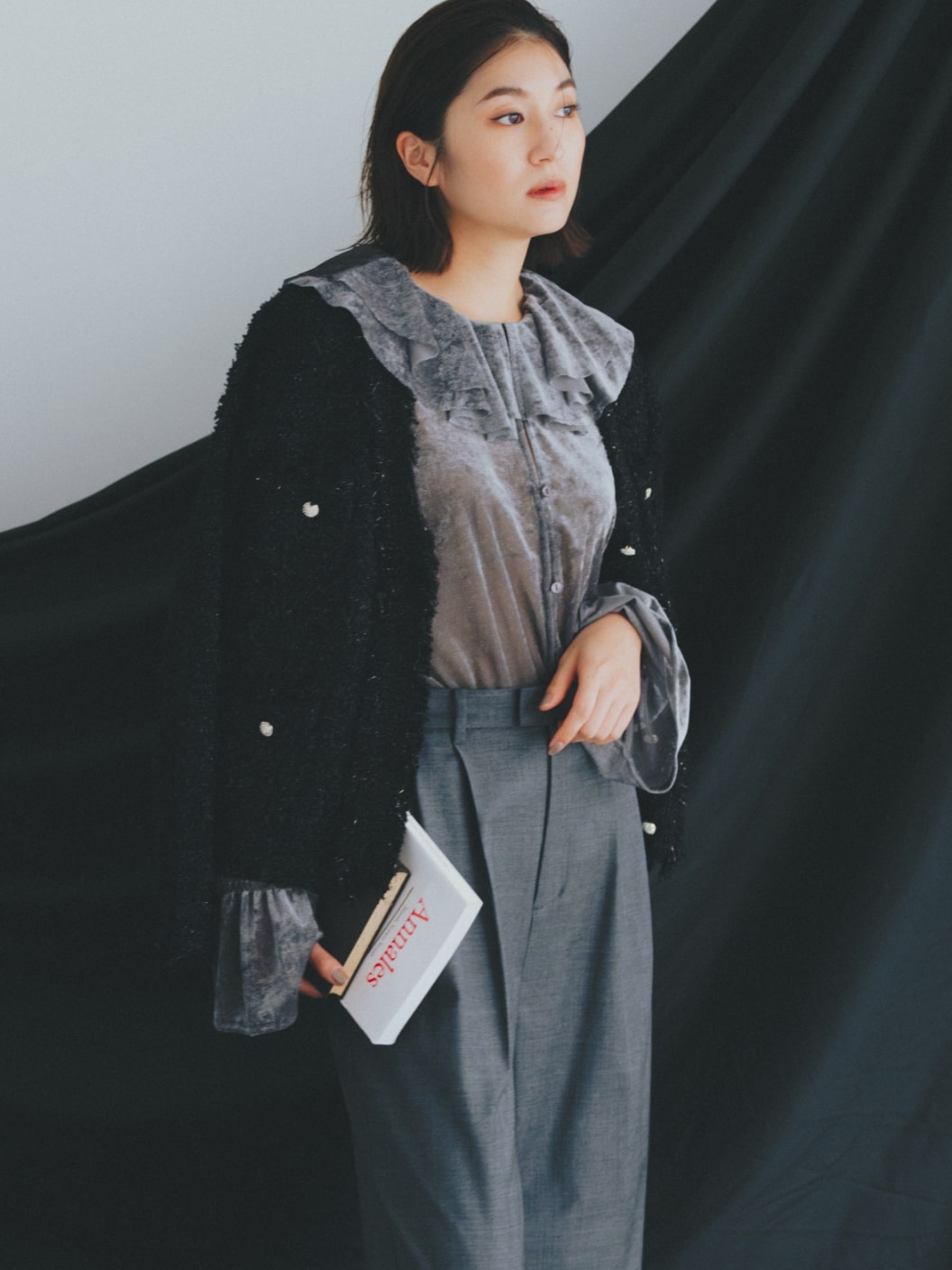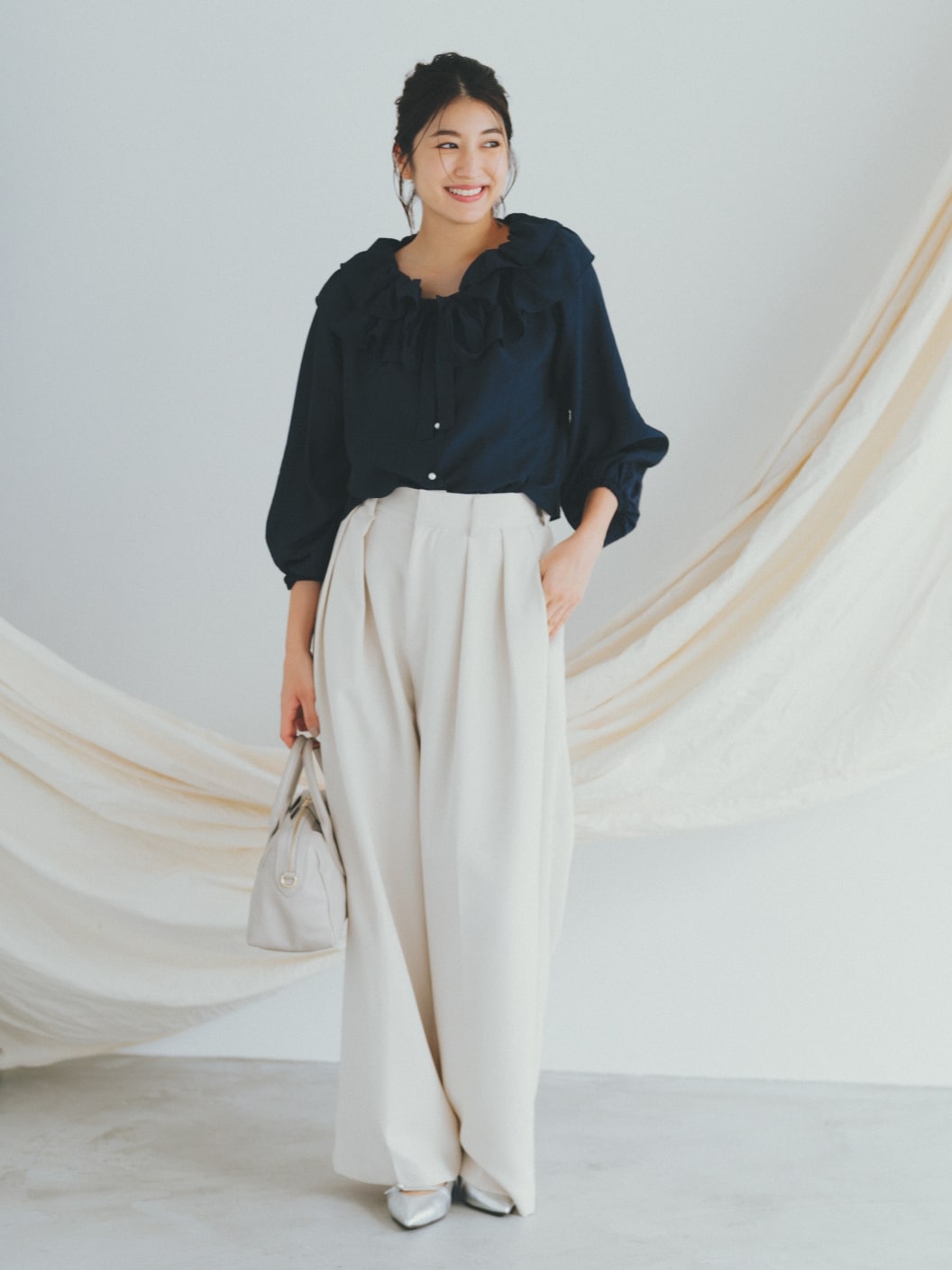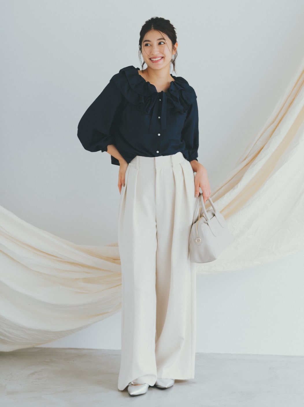 デコラティブなデザインのブラウスは、パールボタンとパンツの色を合わせてまとまりのあるコーデに。