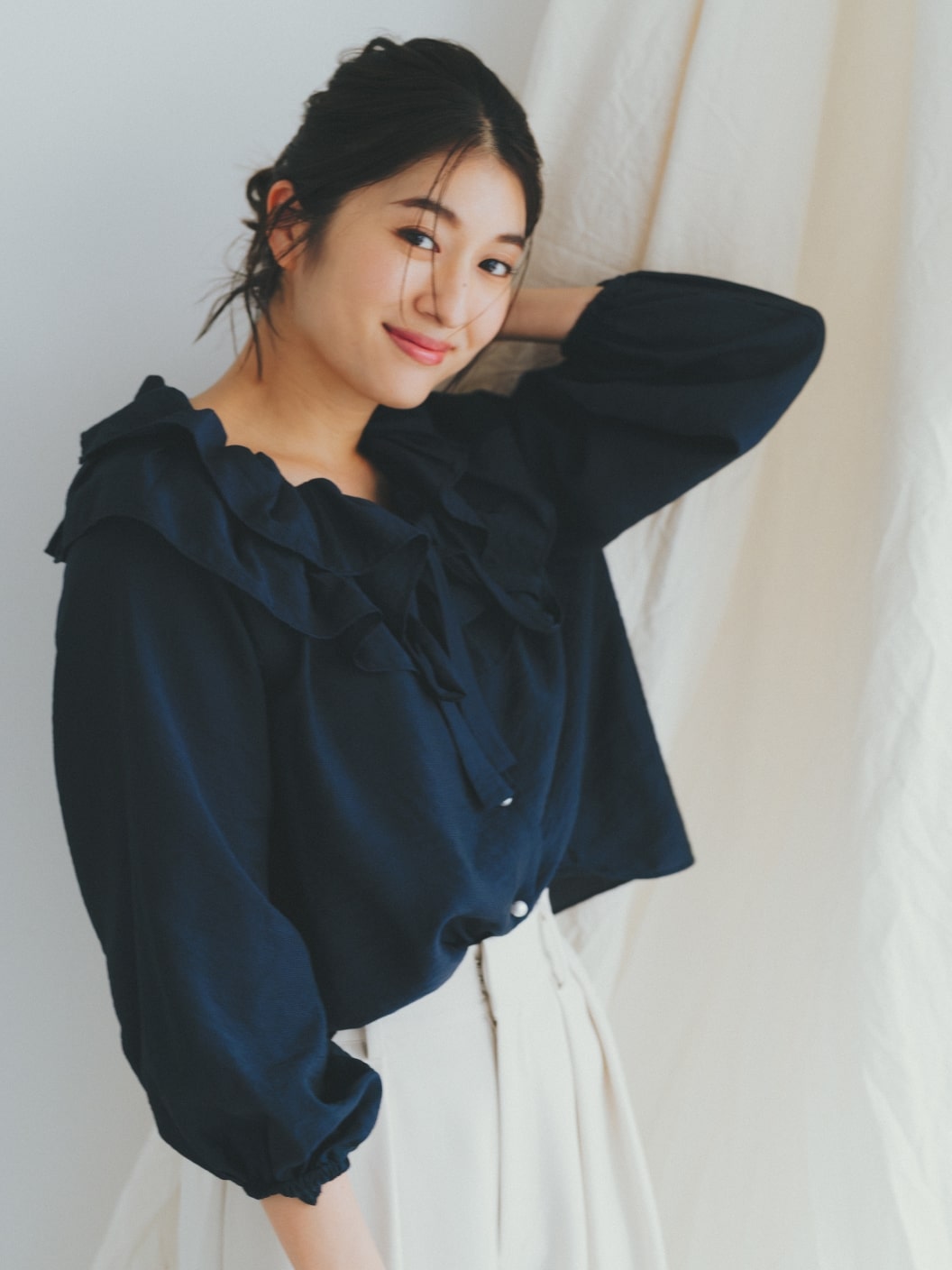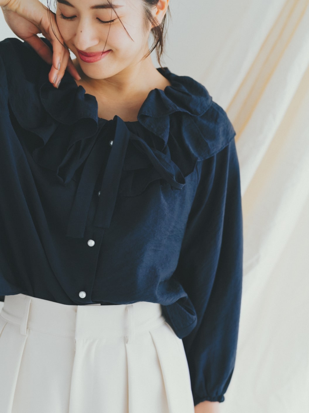 仕事中も気分を明るくするために、一枚でもサマになるブラウスを味方につけて。