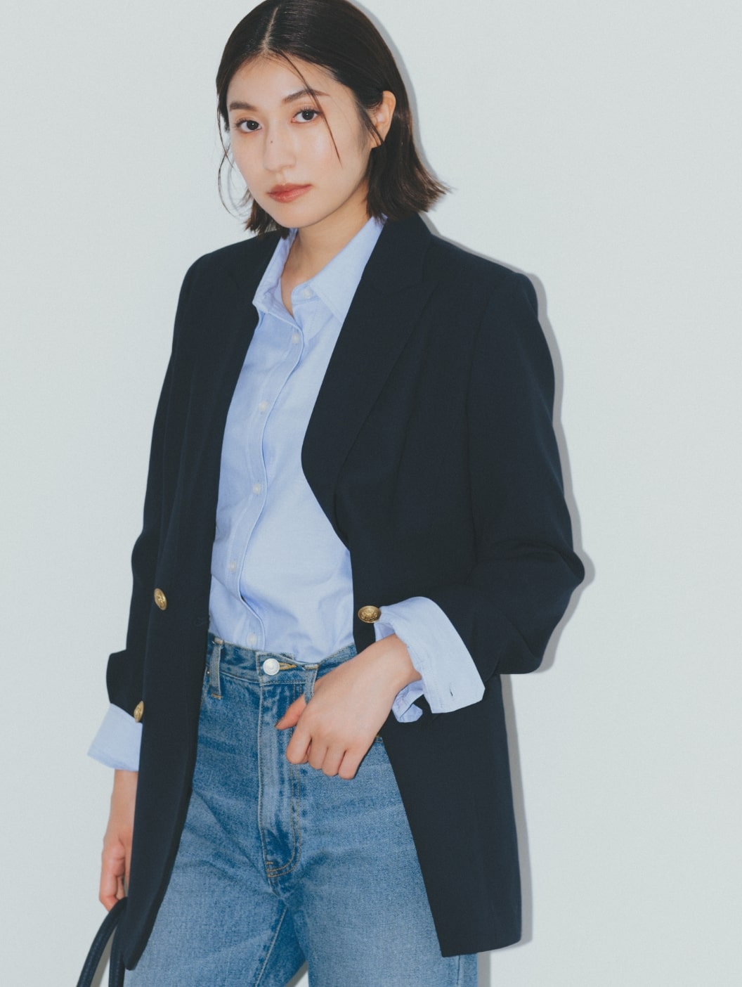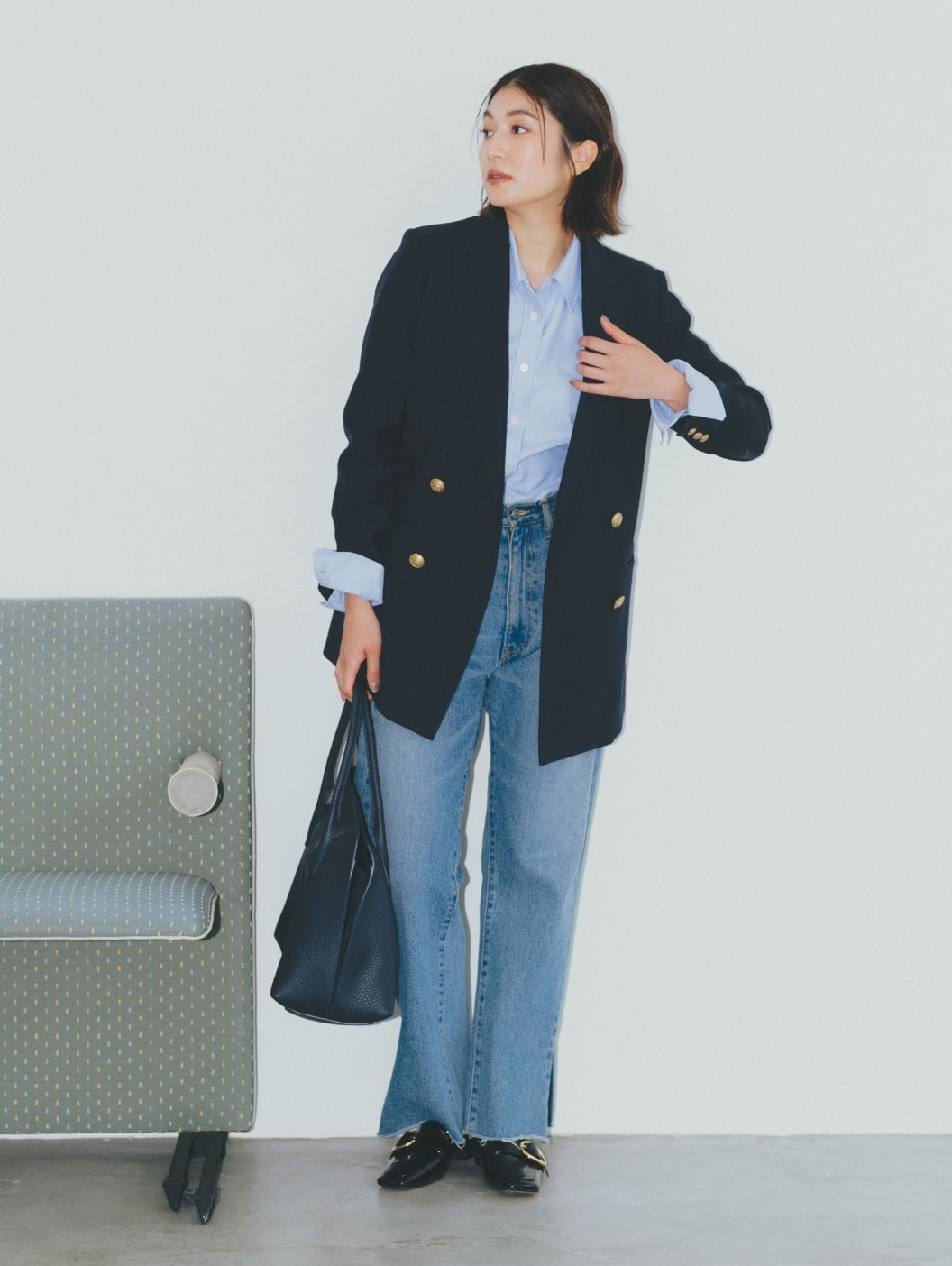 今年トレンドの紺ブレにブルーのシャツとデニムを合わせて上級トラッド。
