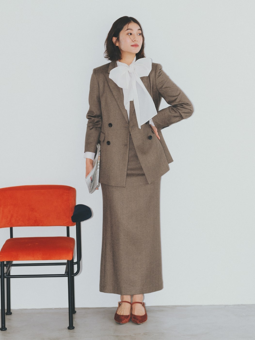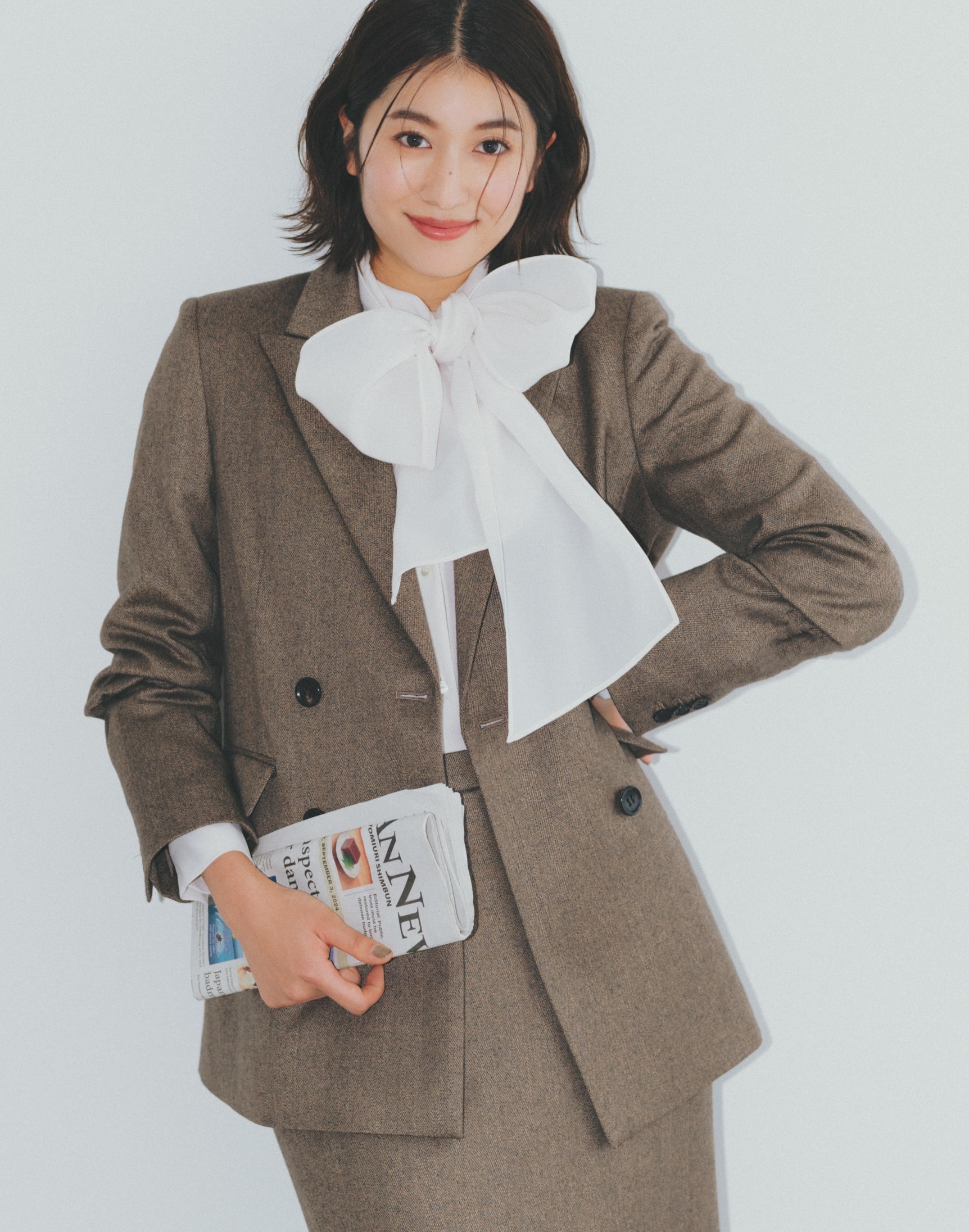 やわらかい雰囲気のツイード素材のセットアップをブラウンのワントーンでまとめて上品見え。