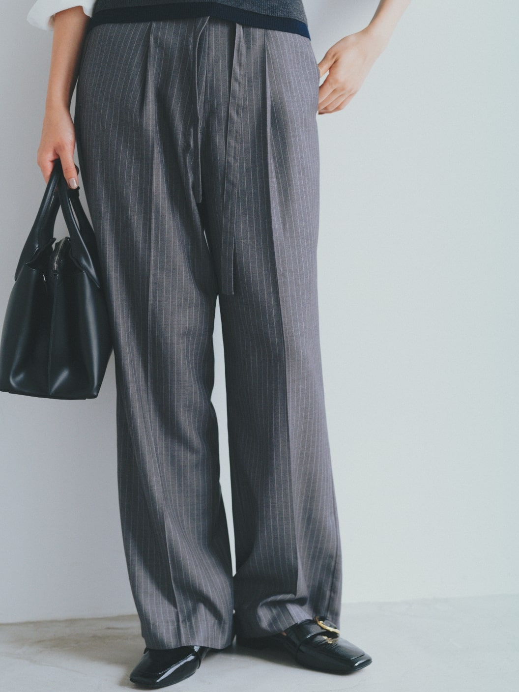 ベルト付きのパンツで視線を上に。ストライプ柄をチョイスすれば、他のアイテムがシンプルでもサマになる。