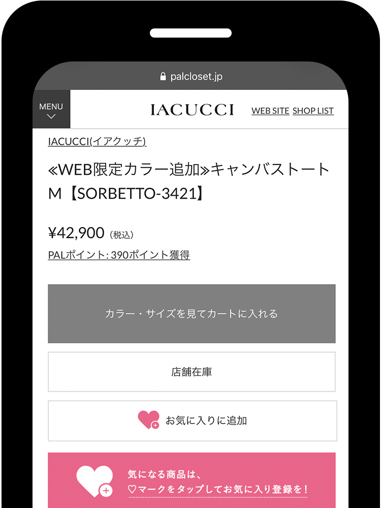 商品ページ「カートに入れる」ボタン左の♡をクリックし♡が赤くなるとお気に入り登録完了です