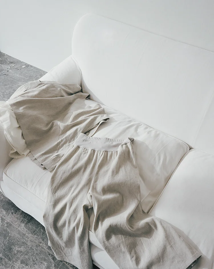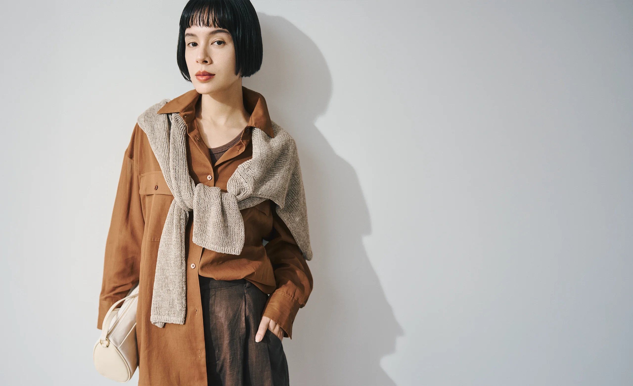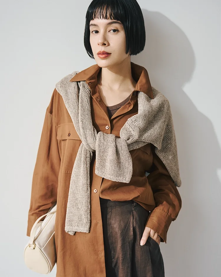 質感と色味のトーンが微妙に違う「3つの茶色」を重ねる、ワントーンコーデ。ドライなシャツに、ハーフパンツ、さらに柔らかなニットを肩掛け。この絶妙なズレが奥行きを生み、単調にならない洗練された大人っぽさと、旅の品格を纏って。