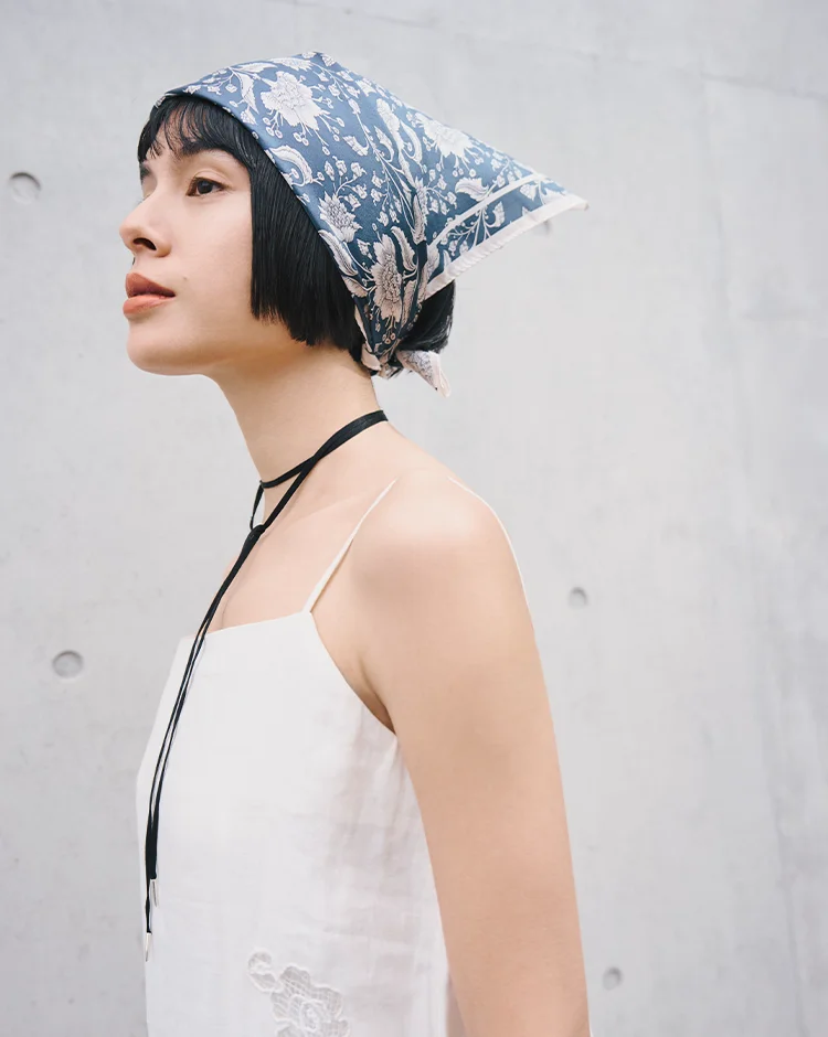 真っ白なレースワンピースを、ただレディに纏うのではなく、頭に巻いたバンダナや重めのサンダルでハズす。あえてリゾートの定石を外すことで、甘さの中に自分らしい意志を宿した、遊び心のある洗練された大人のバランス、その自由な空気感を。