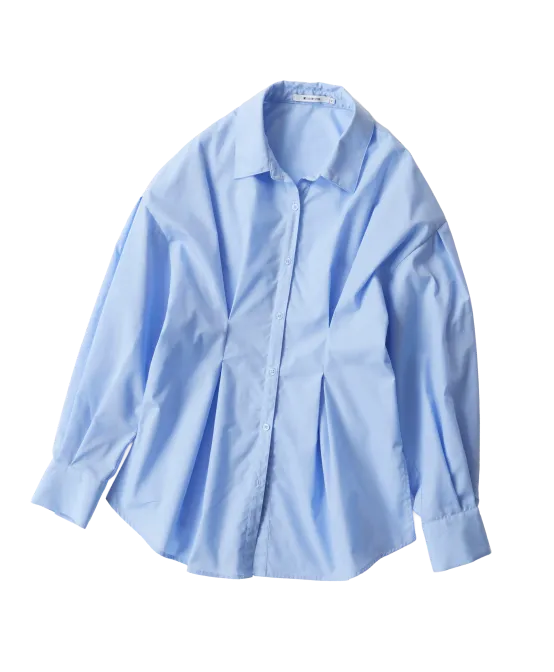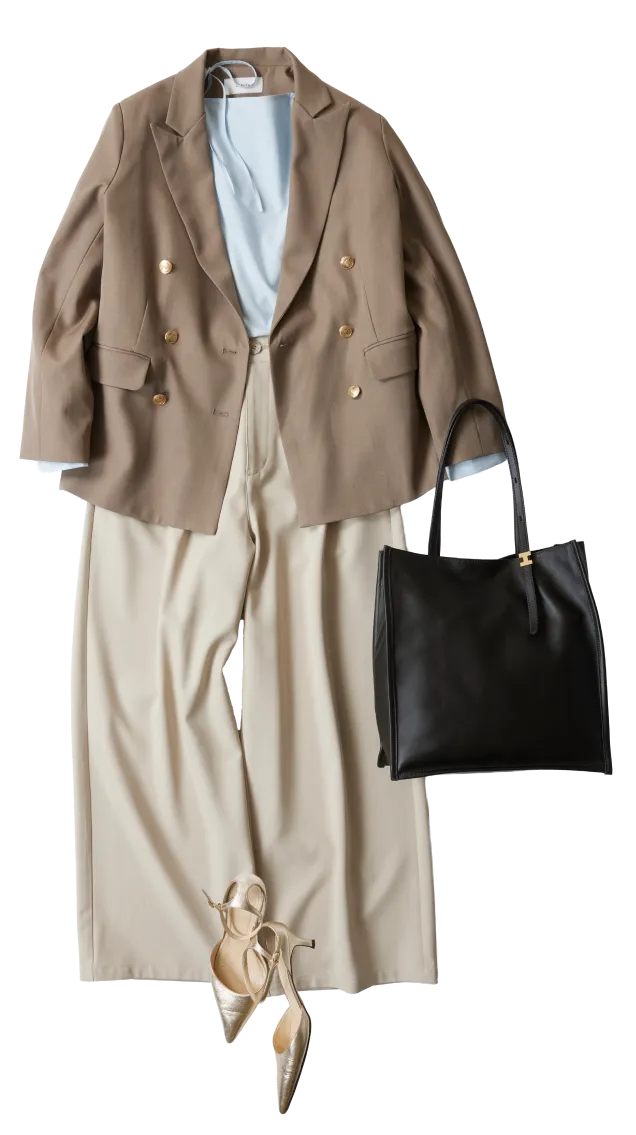 春らしいライトブルーのブラウスを主役に、ジャケットとパンツはトーンオントーンでまとめてなじませ、カラートップスを楽しむスタイリングに。