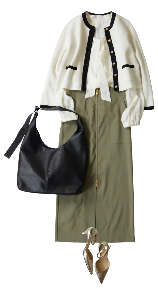 フェミニンなボウタイブラウスは、カーキのスカートでほんのりカジュアルに。金ボタンカーディガンを合わせれば、きちんと見えも叶います。