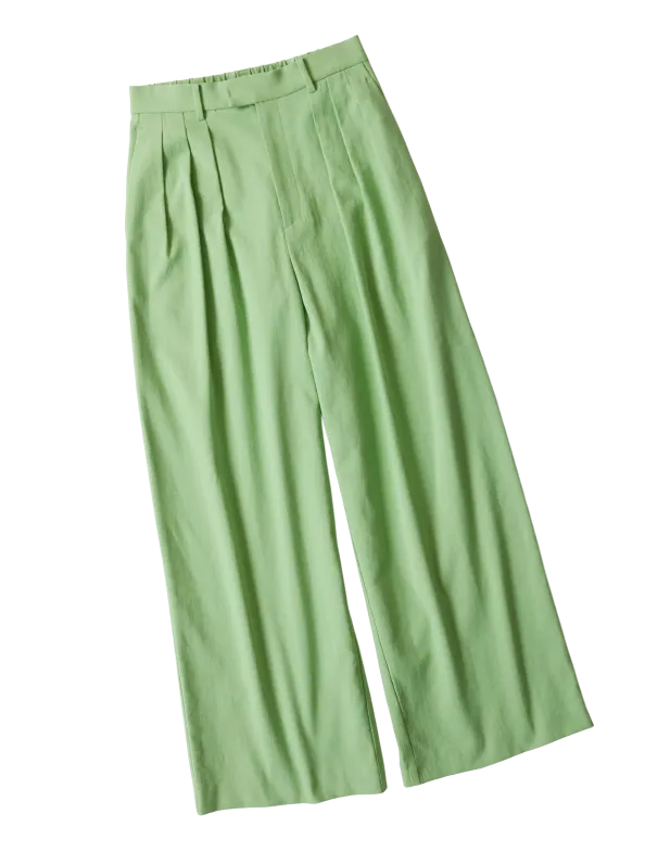 明るいグリーンのパンツは、すっきりとしたVネックのトップスでクールに決めたい。 着丈長めのトップスを選べば、カラーパンツも挑戦しやすくなります。