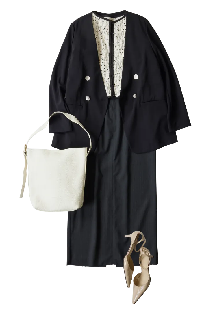 重くなりがちな黒のジャケットは、今年気になるドットトップスを中に合わせることで、軽やかな印象に。
