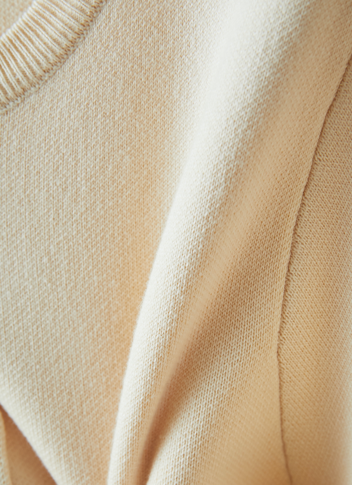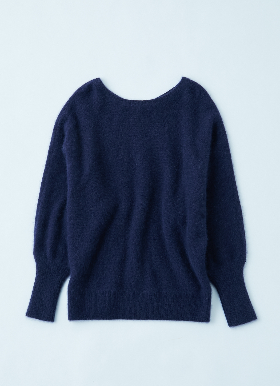 前後2wayで使えるので、クルーネックとVネックで印象を変えて楽しめます。デコルテがきれいに見える上品なニットです。