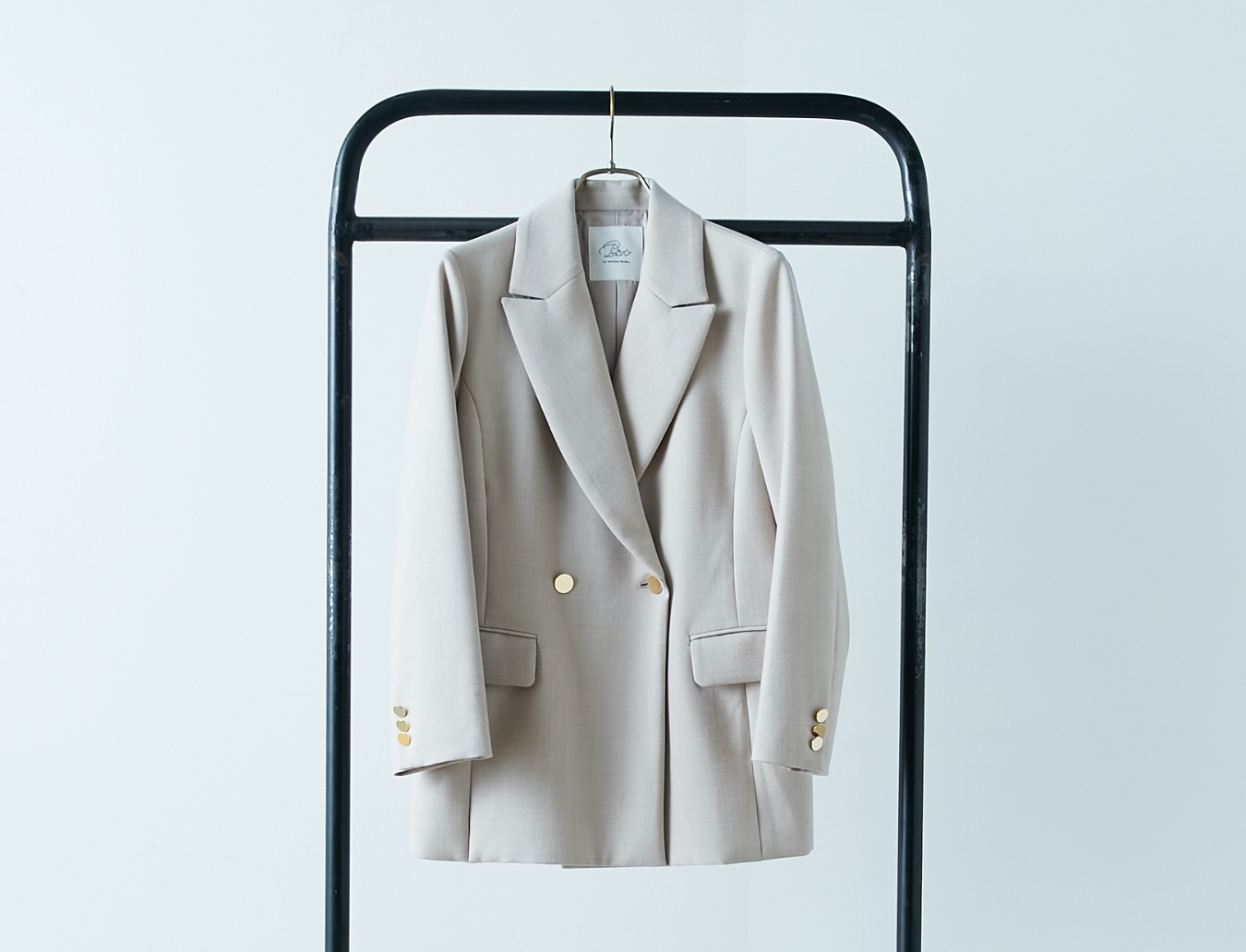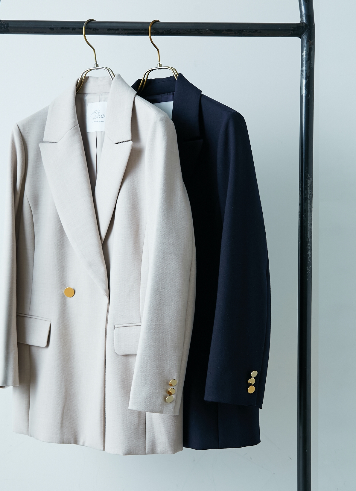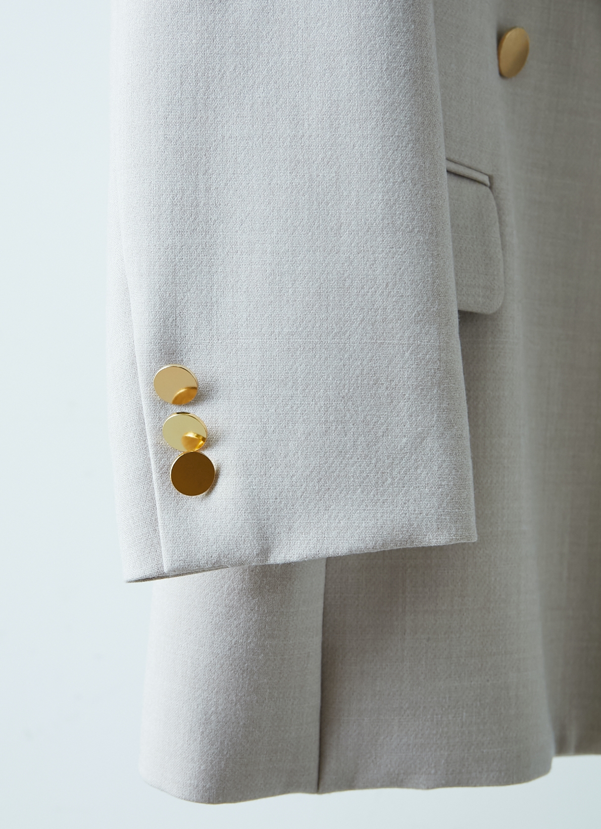 ゴールドのボタンがさり気なく上品でデザインのポイント。2つボタンでかっちりしすぎず、柔らかい印象を与えてくます。すっきり見せで着用時のスタイルアップが叶います。