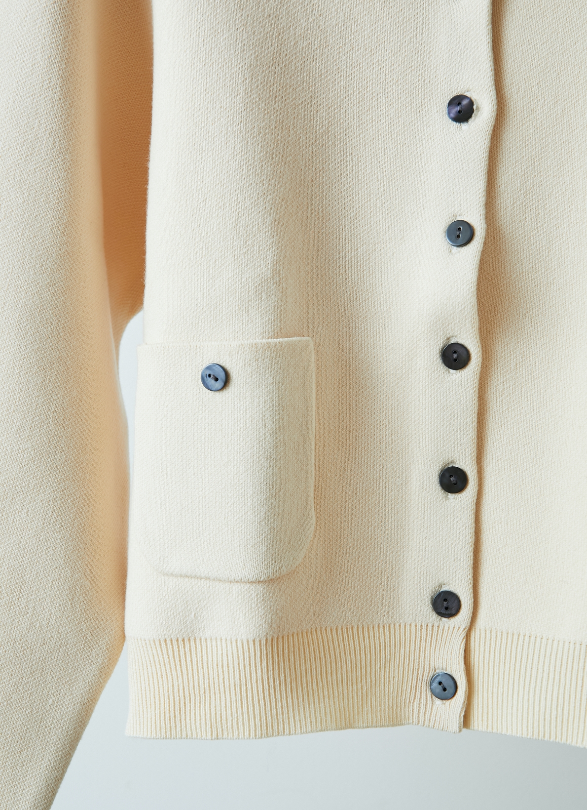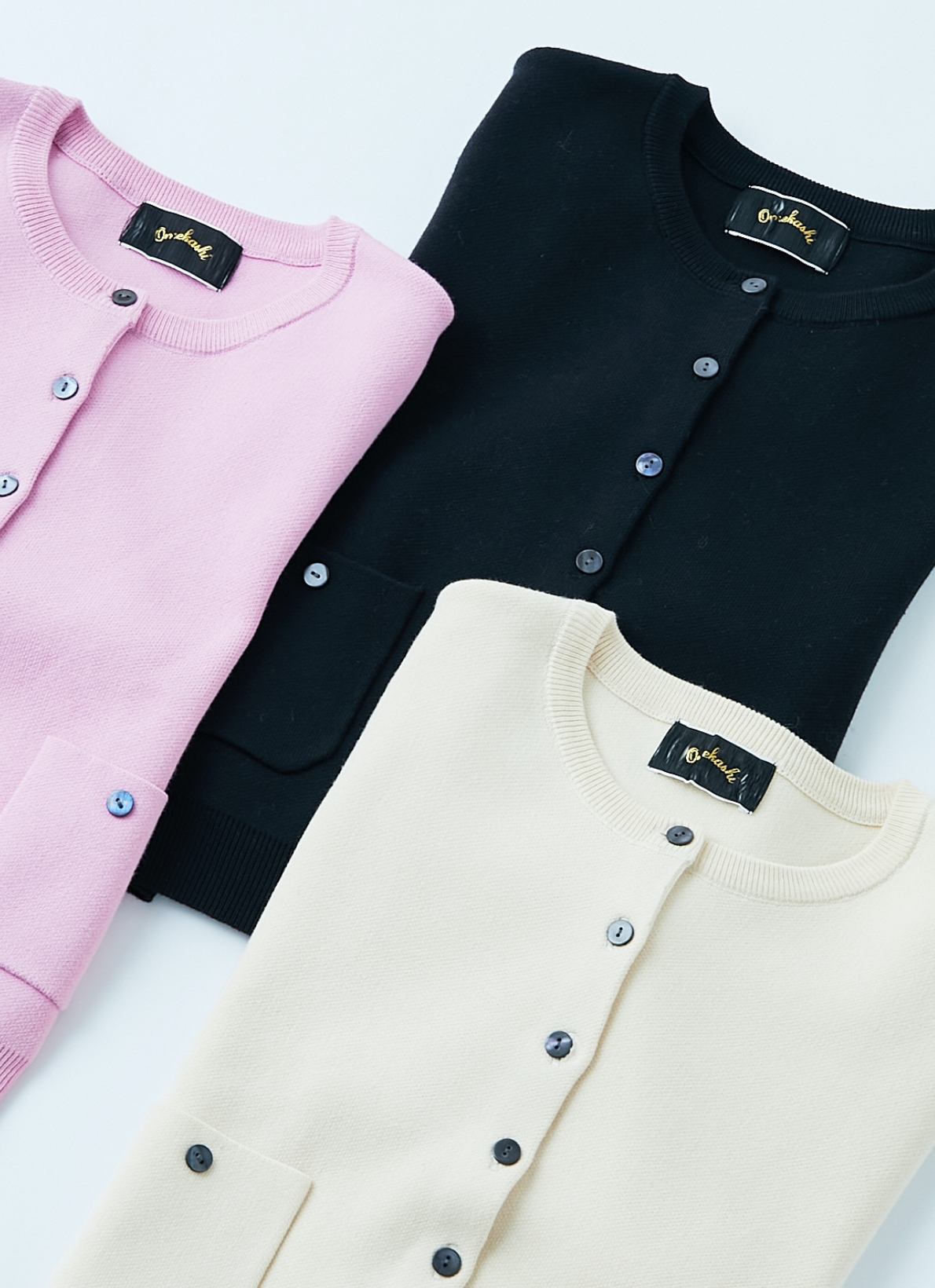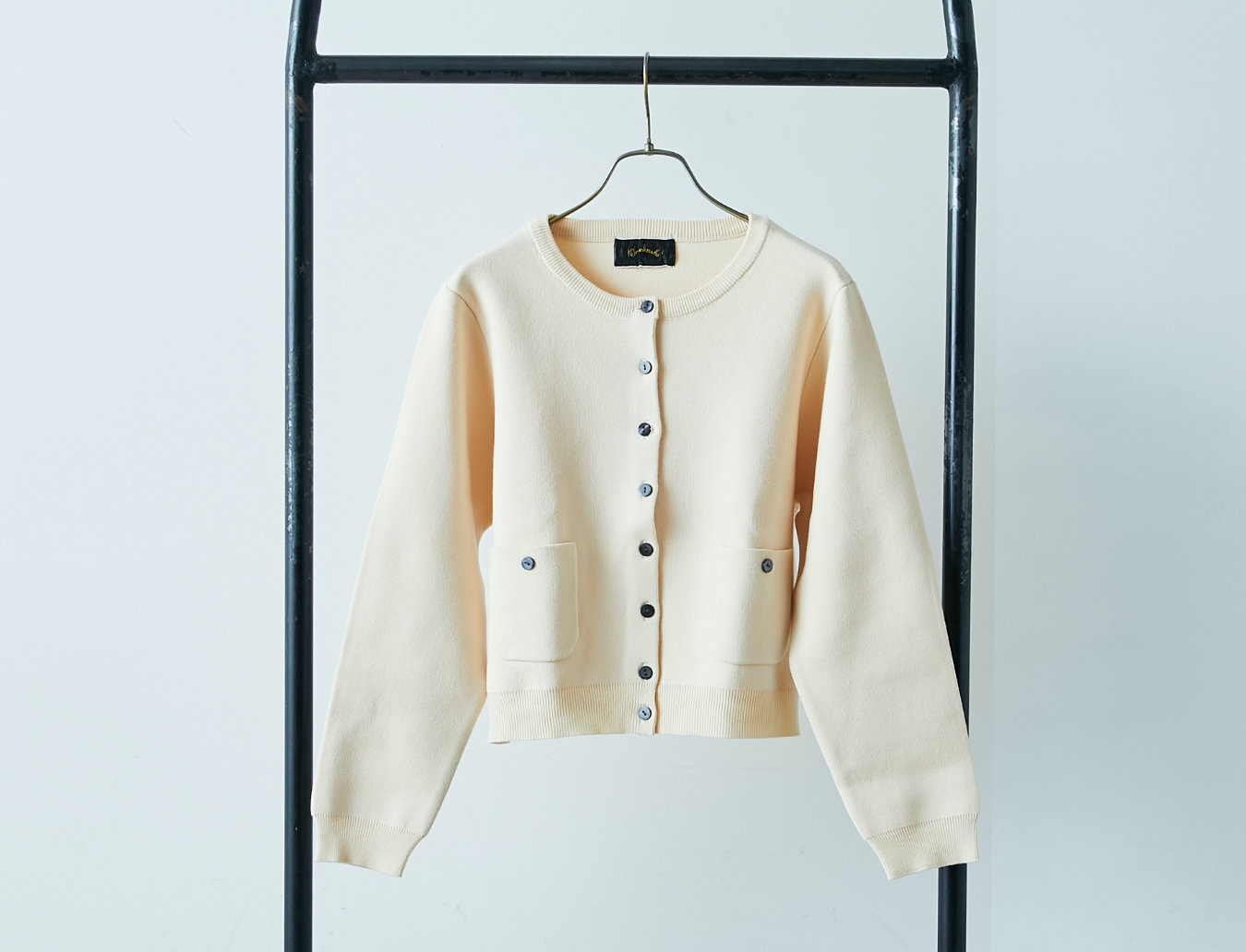 シンプルになりがちなカーディガンですが、フロントにポケットがあることで遊び心をくすぐります。1枚で華やかに主役となってくれるデザインです。