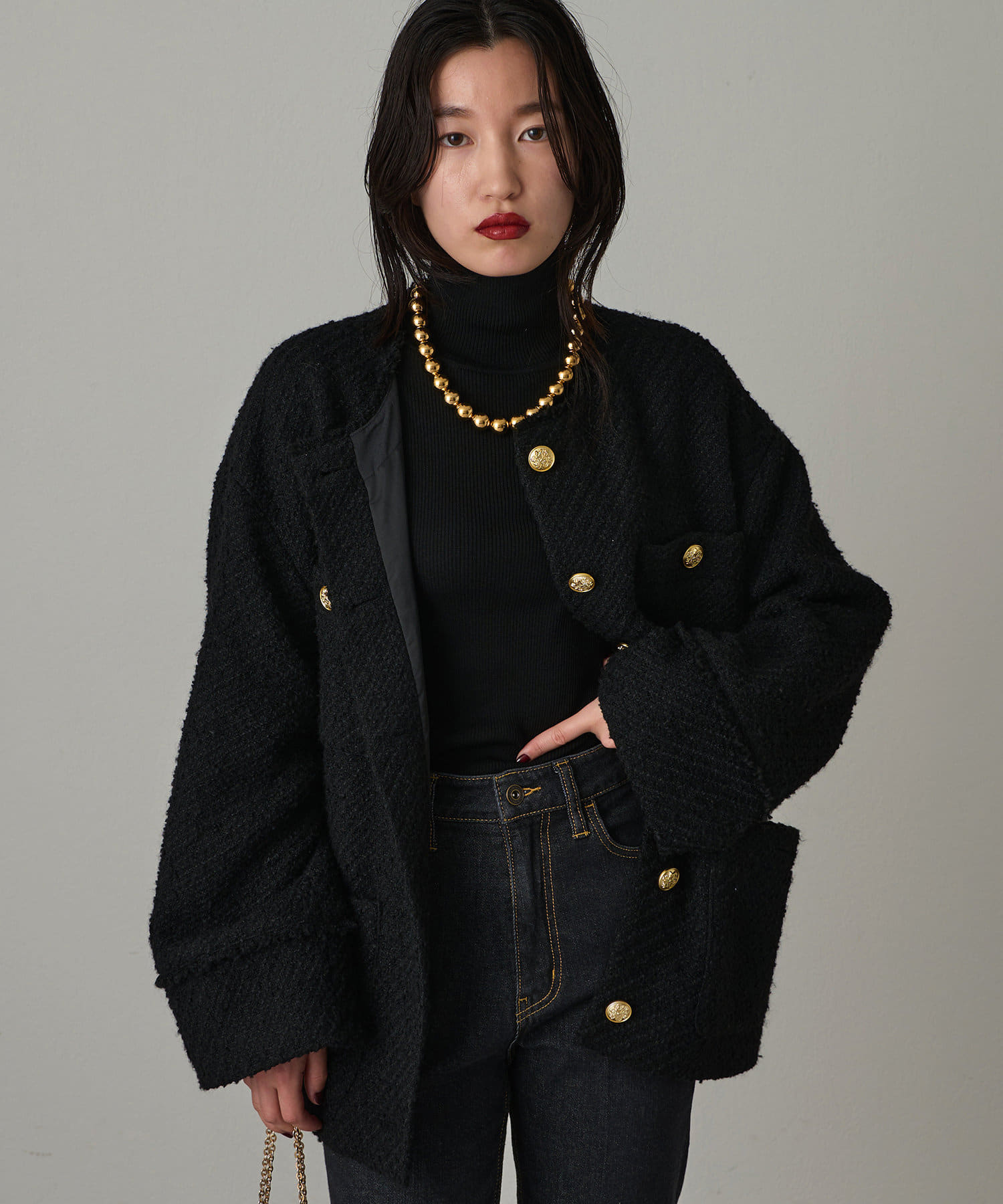 ツイード素材って可愛いですが、ジャストサイズだったりどこかコンサバっぽかったりするイメージがなかなか馴染めなかったのですが、このジャケットはオーバーサイズのオシャレ感がたまりません。>友人からも褒められる一着で、本当にオススメです!