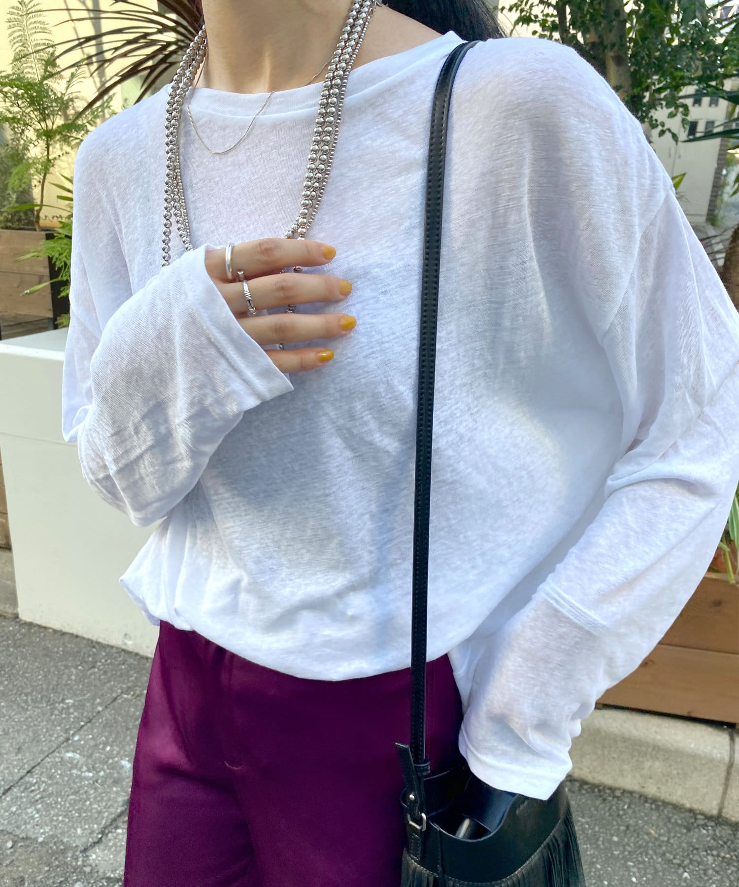 とにかく素材感がさらっとしていて着やすいです。落ち感もあるのでそのままでもインしてもきれいにまとまります。