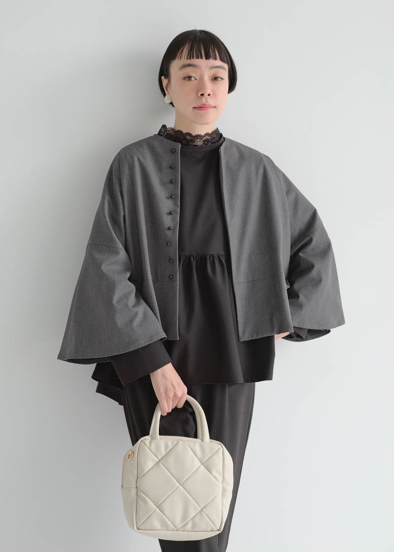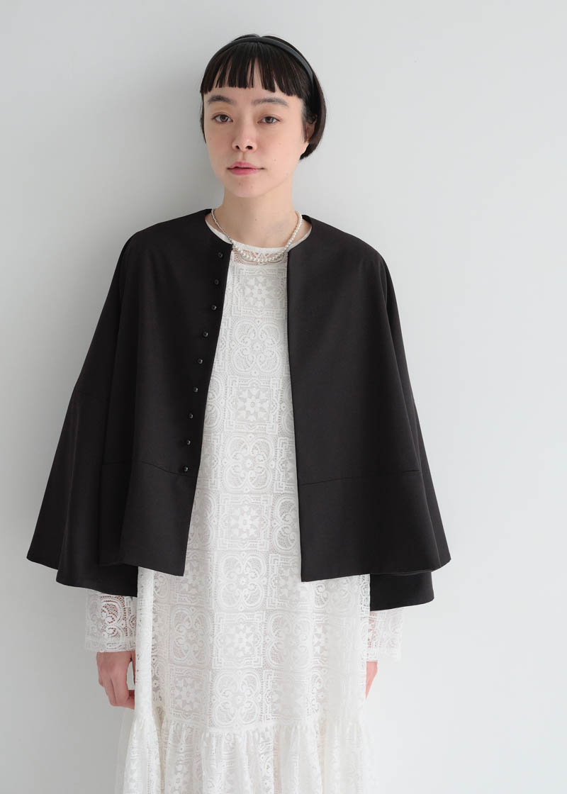 フロントの飾りボタンがアクセントになったノーカラージャケットはケープのようなフレアデザインで動くたびにやわらかく揺らめくシルエットが魅力。日本製の縫製の良さが伝わる上質で上品な『Du noir』の名品ジャケット。