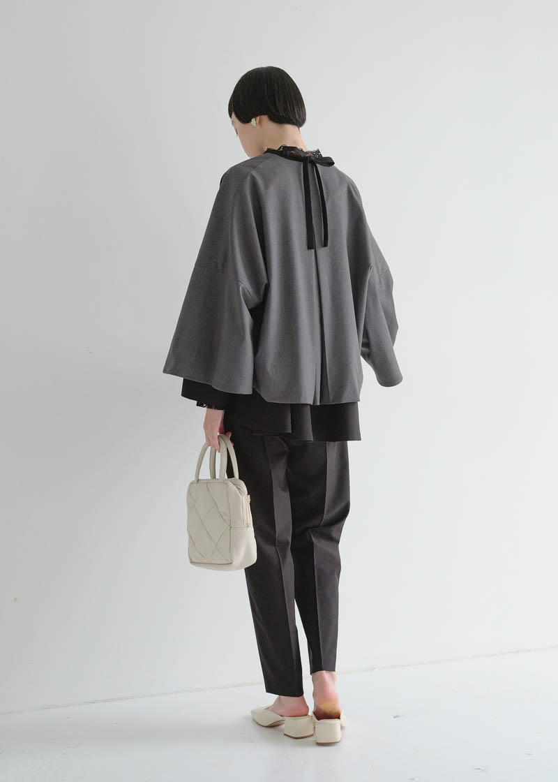 カッチリした印象になりすぎないよう、少しオーバーサイズに仕上げることでトレンド感があり、襟のフリンジ使いがこなれ感を演出してくれます。カラーはオケージョンにも使いやすいモノトーン展開。主役アイテムとしてON/OFF両方で使えて、今っぽさのある着こなしが出来ます。