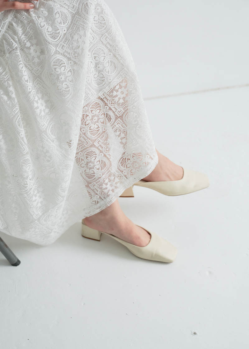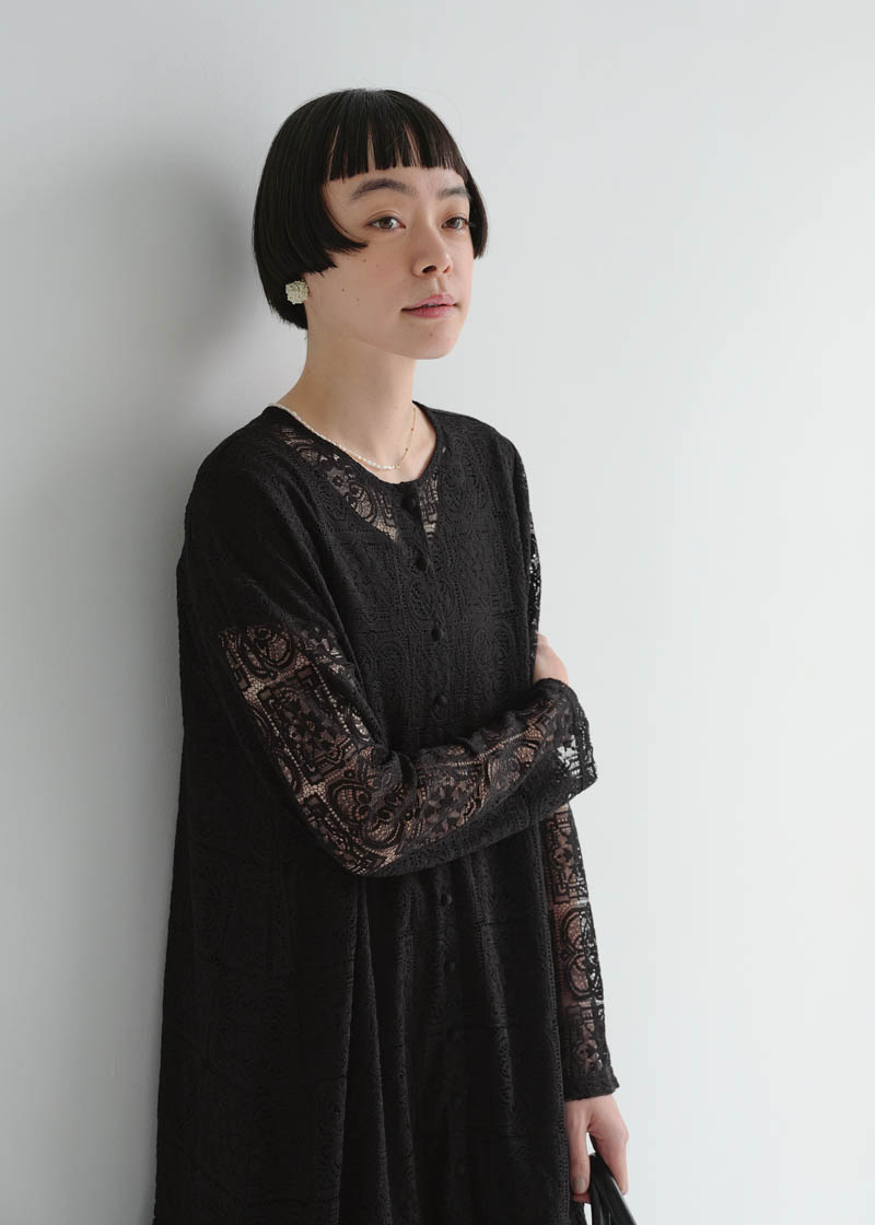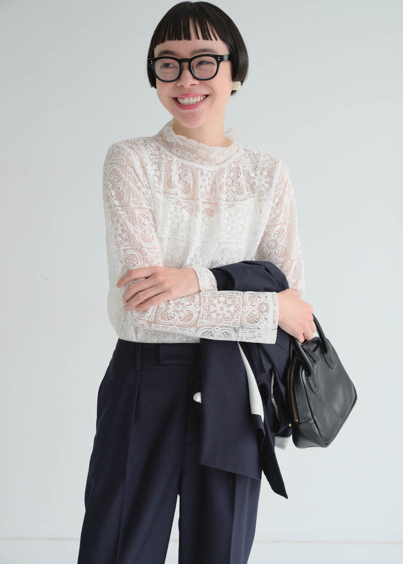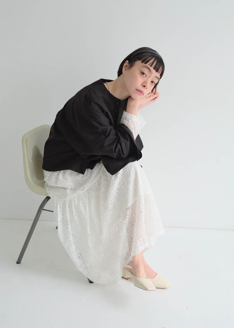 繊細なレース素材がエレガントで華やかな印象の一枚。レースの上品な透け感がワンランク上のスタイリングを実現。着こなしのアレンジを楽しめる前後2way仕様です。シワになりにくいので、長時間座ることの多い、[ハレ]の日にもおすすめです。