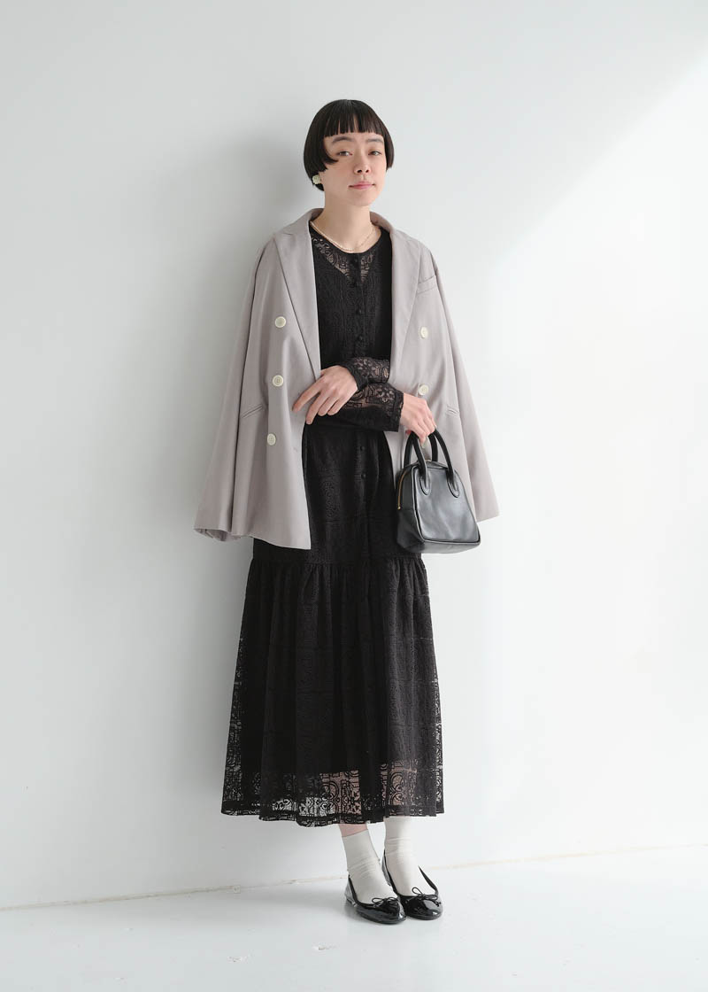 女性らしくヘルシーな総レースワンピースは1点で着映えるアイテム。大切な日には、ジャケットを重ねればきちんと感もあり、晴れやかな印象に◎ニットやスウェットをレイヤードして、カジュアルダウンした着こなしも楽しめます。「式のそのあとも着たい!」という方にも納得いただけるアイテムです。