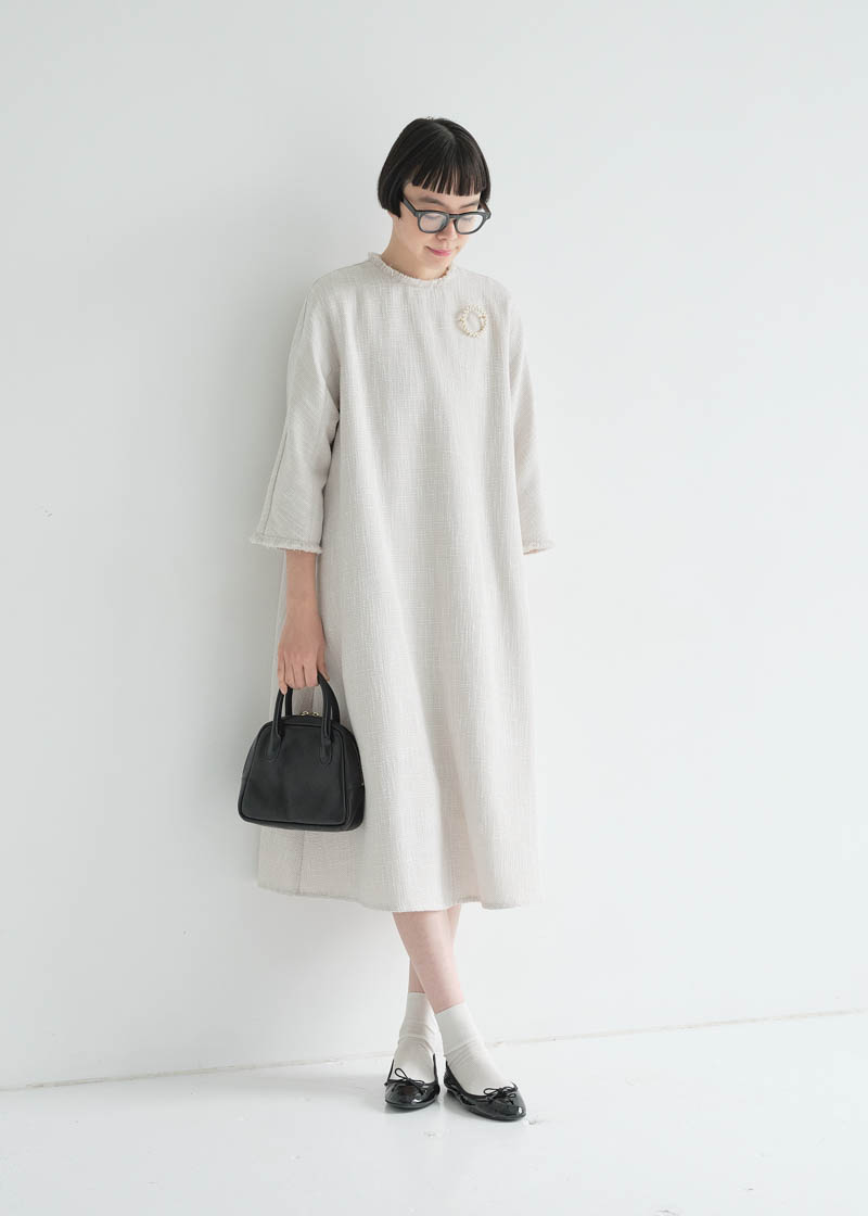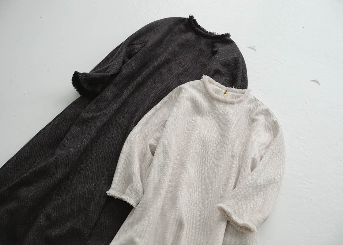 引き続き注目のツイード素材でお作りしたワンピース。裾に向かって広がるAラインシルエットが女性らしい一着です。一見シンプルなデザインながらも、首元や袖口に施したフリンジがアクセントに。ぱっと着るだけでこなれ感あるキレイめスタイルを叶えてくれます。