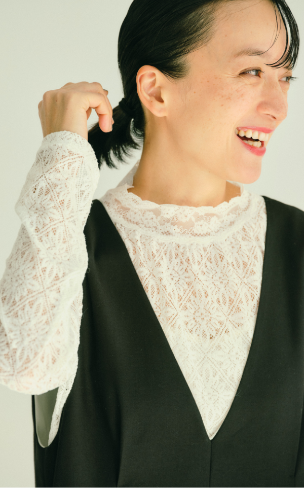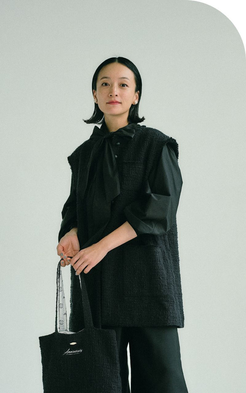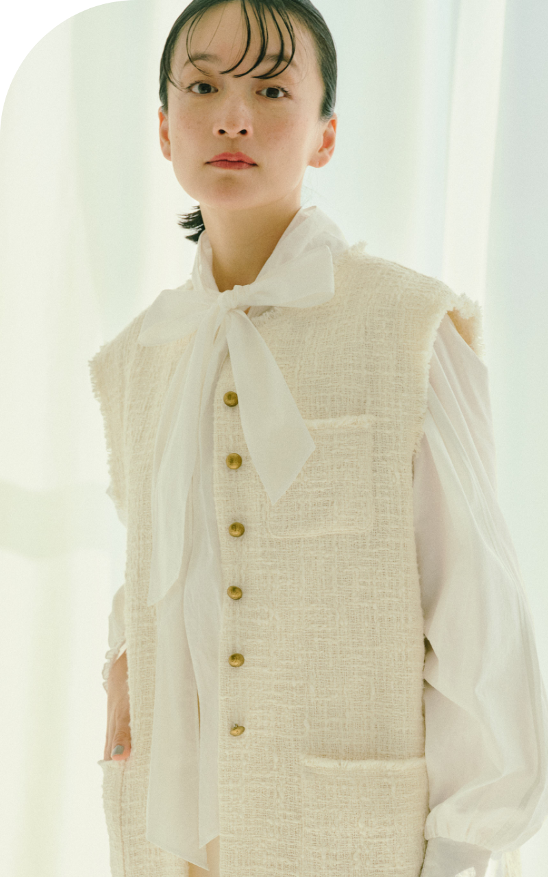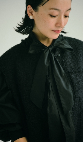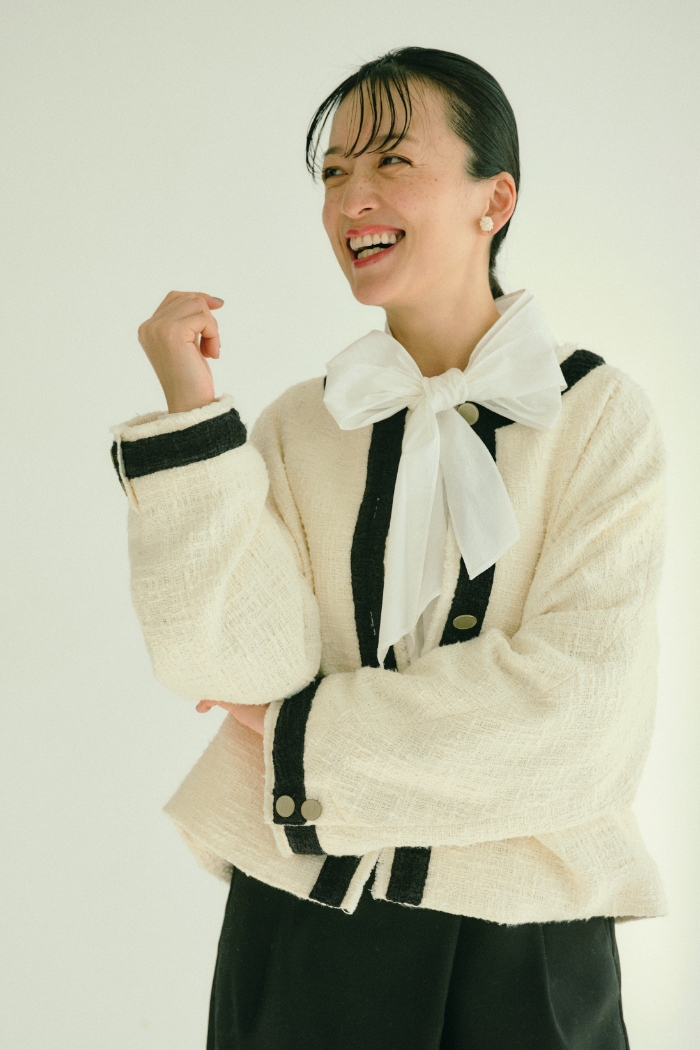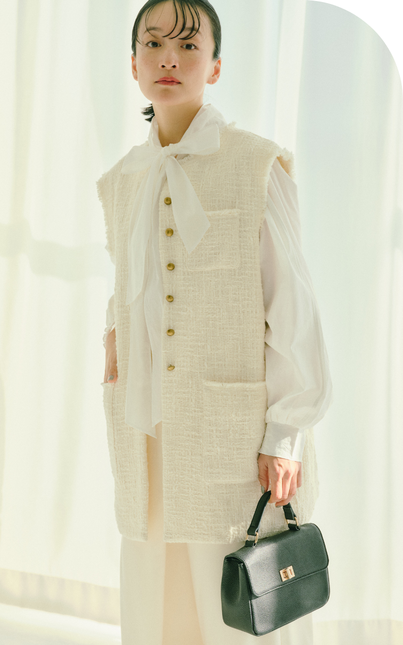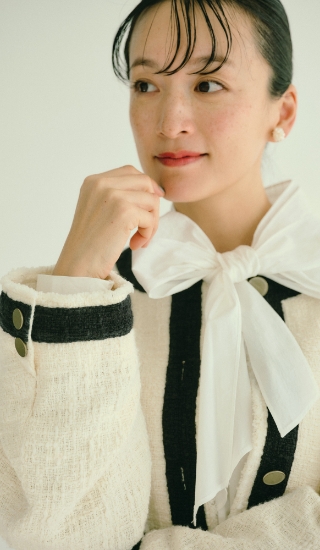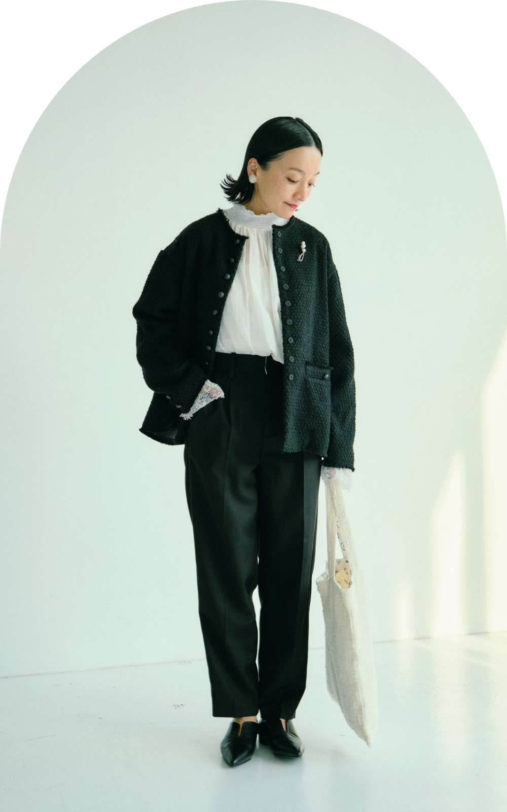 生地作りからこだわり、オリジナルで作ったツイードはセレモニーらしい華やかムードをさらに高めてくれます。ブラウス×パンツのシンプルなコーデに取り入れるだけで無理なく[ハレ]の日にふさわしい気品と女性らしい柔かさと優しさを感じられます。