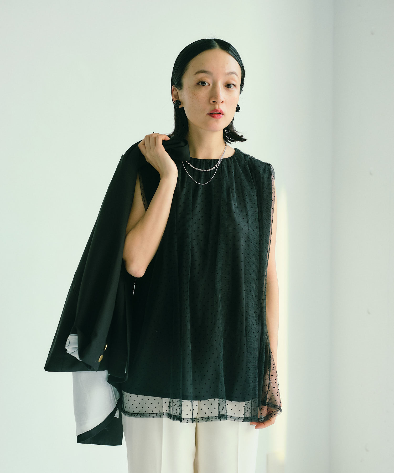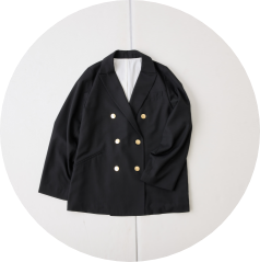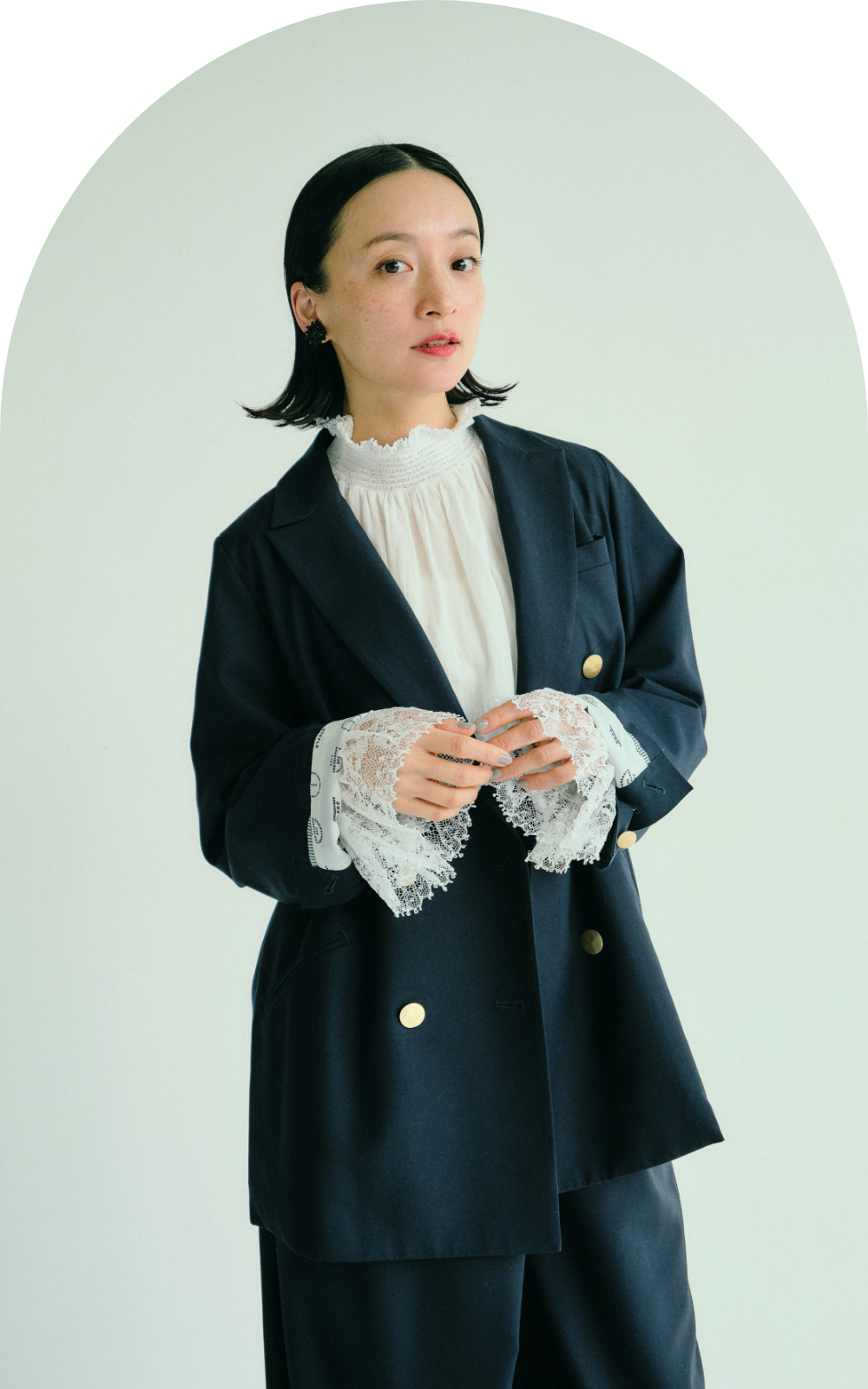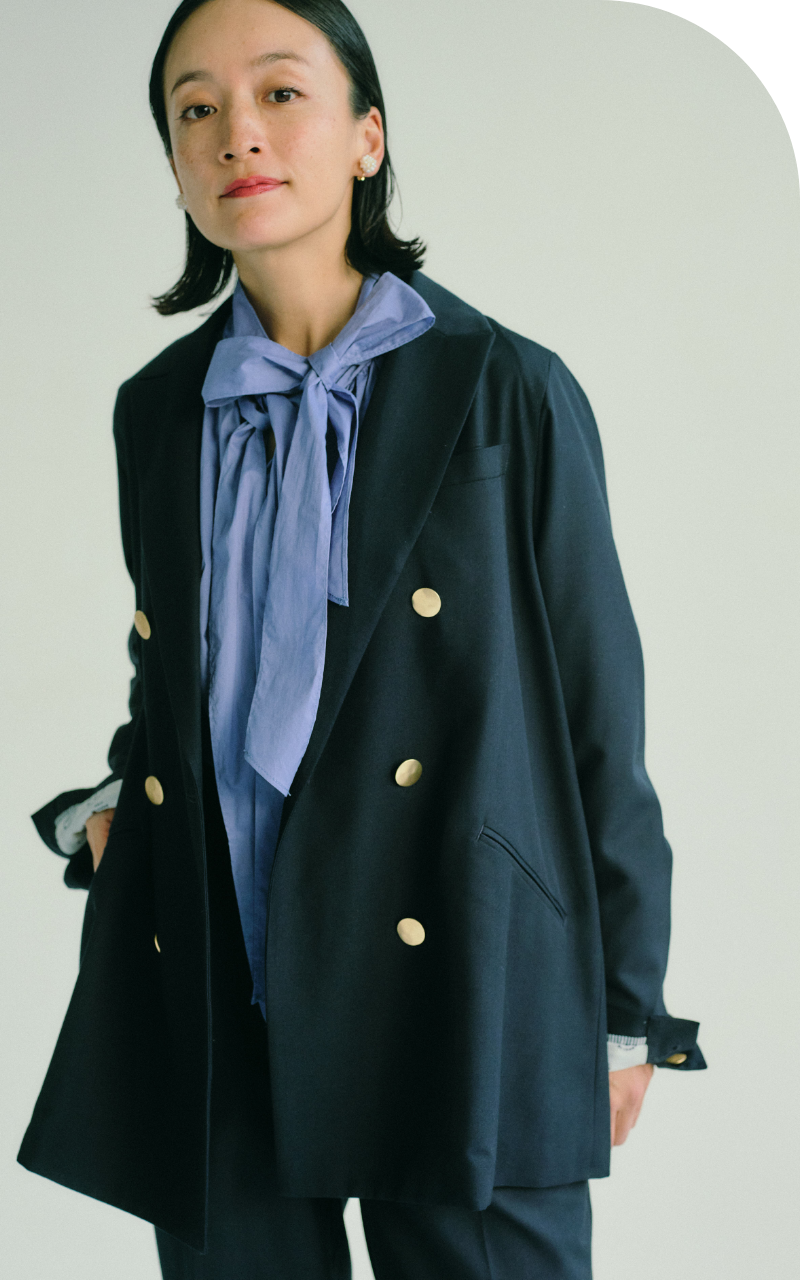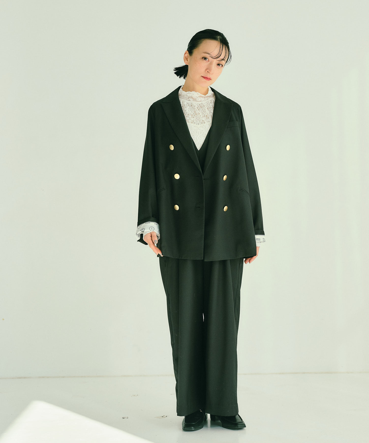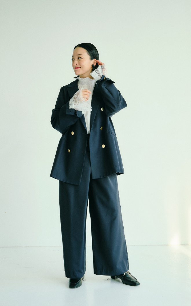 シャープな印象のテーラードのインナーにはレースやリボンなど少し甘さのあるブラウスを合わせることでより特別感を彩るコーディネートが実現。同シリーズのパンツやサロペットと組み合わせて着ていただけます。今年はネイビーとブラックの色展開です。