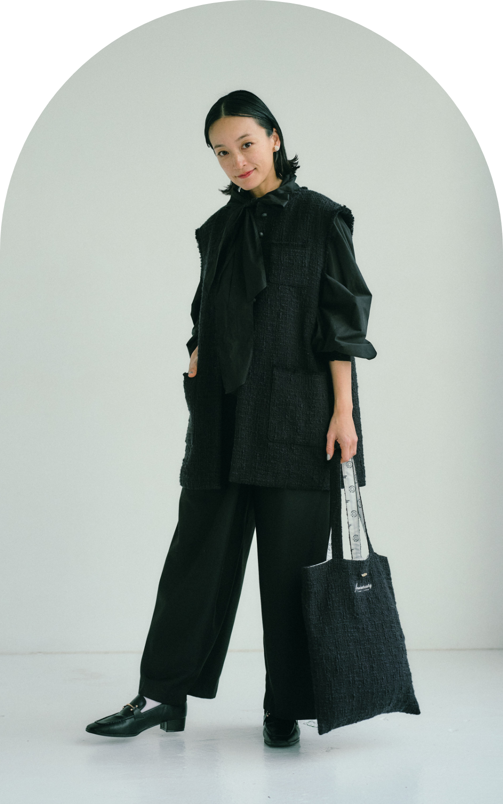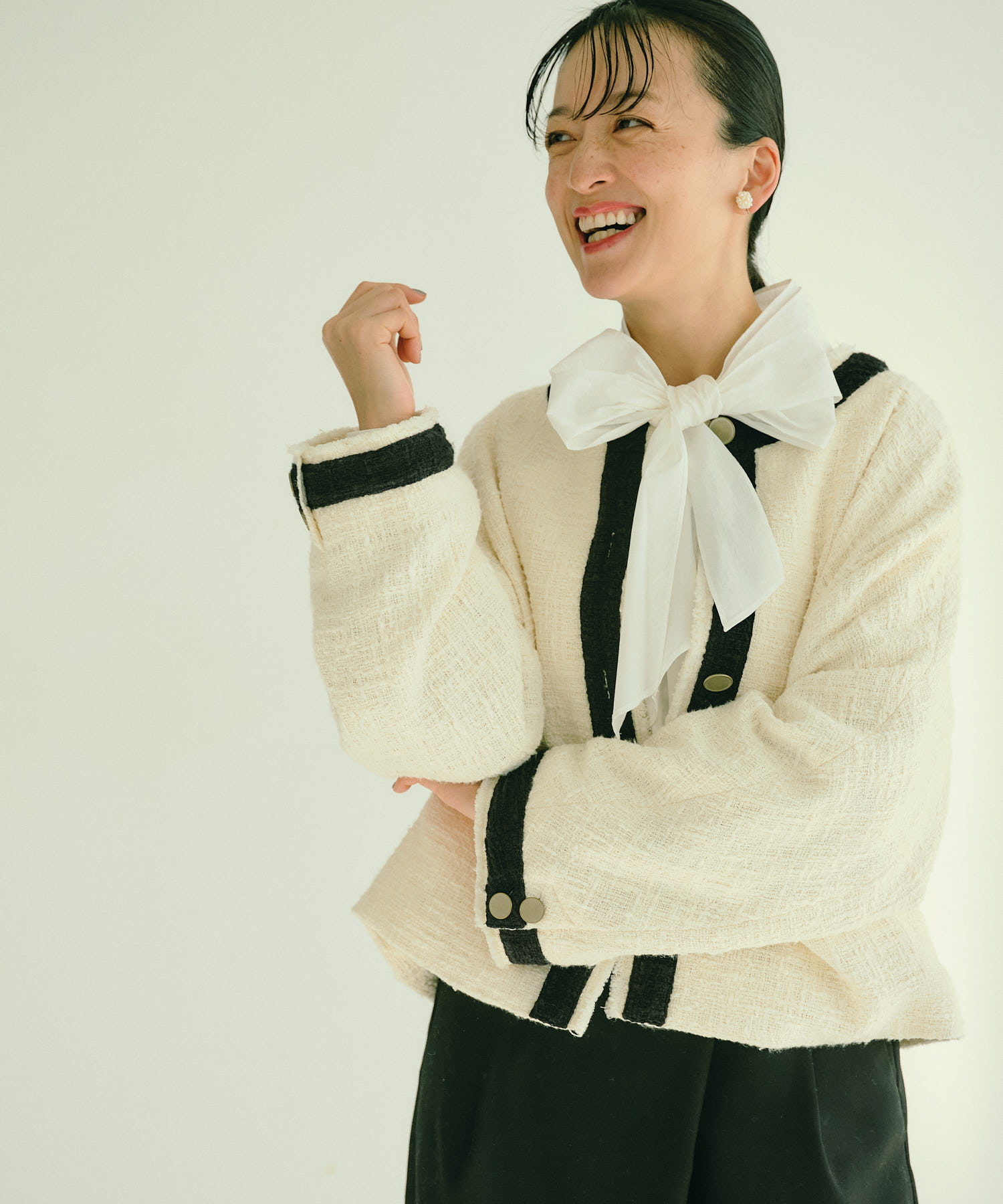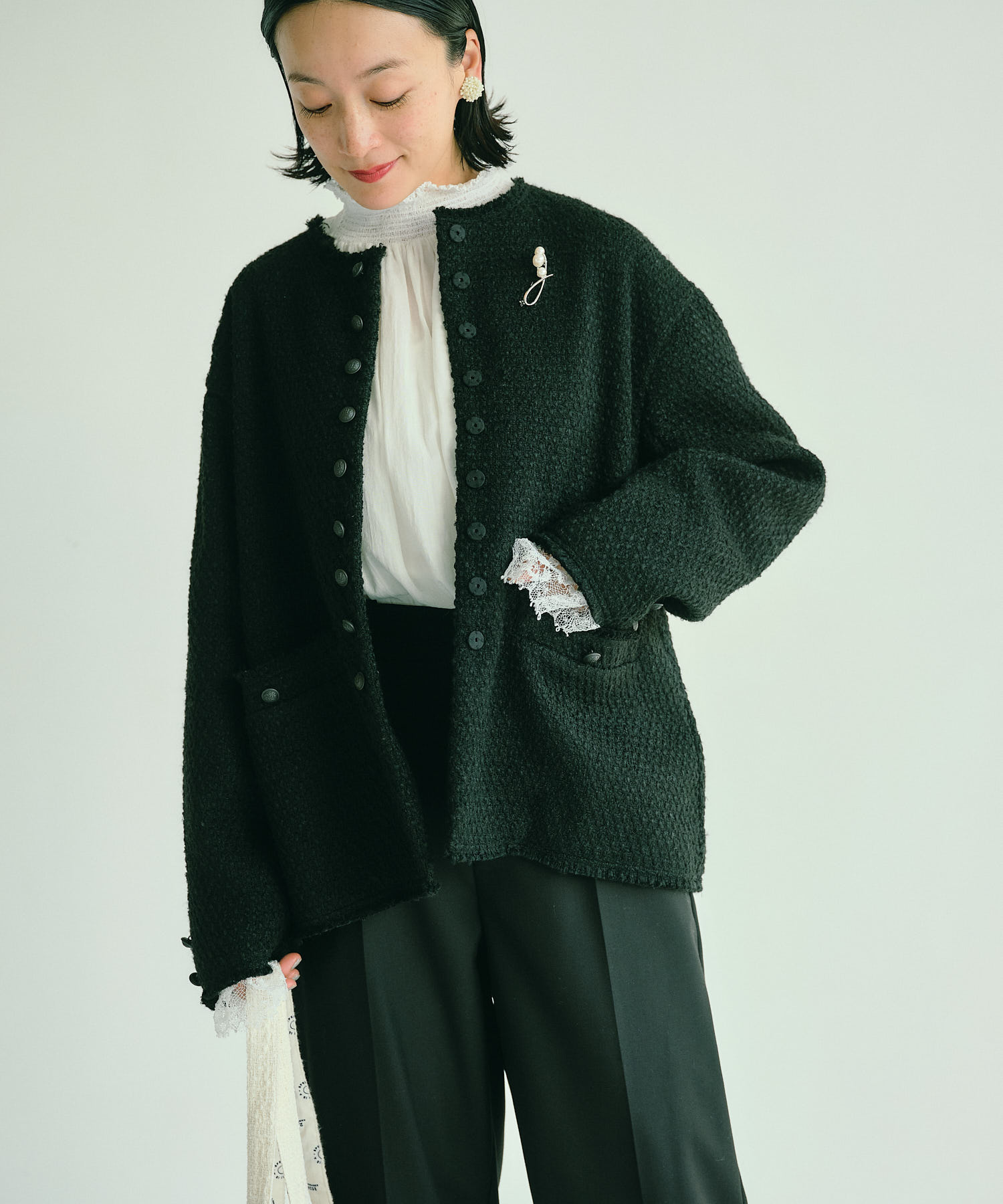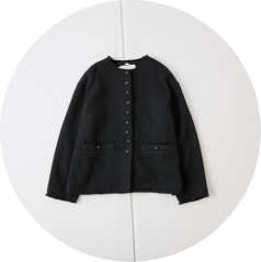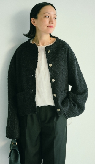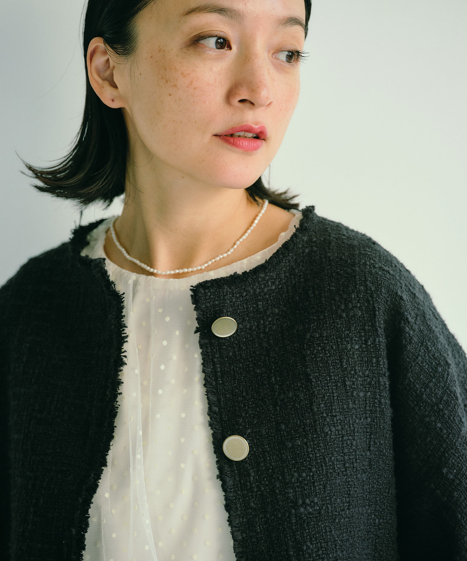 首元のフリンジ仕様で少しオーバーサイズに仕上げることで、 かっちりしすぎないツイードにこだわりました。肩の力は抜きつつちょっぴり着飾りたい日にもおすすめです