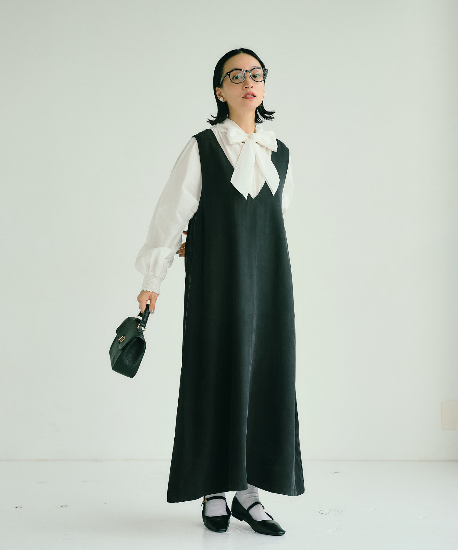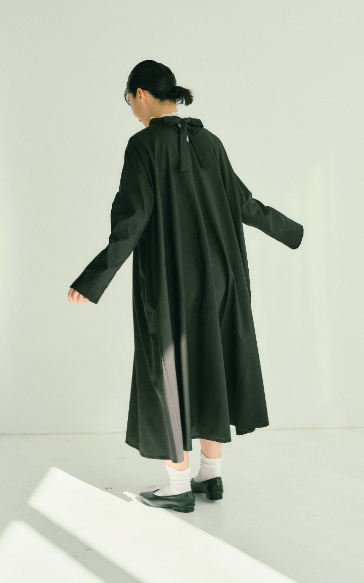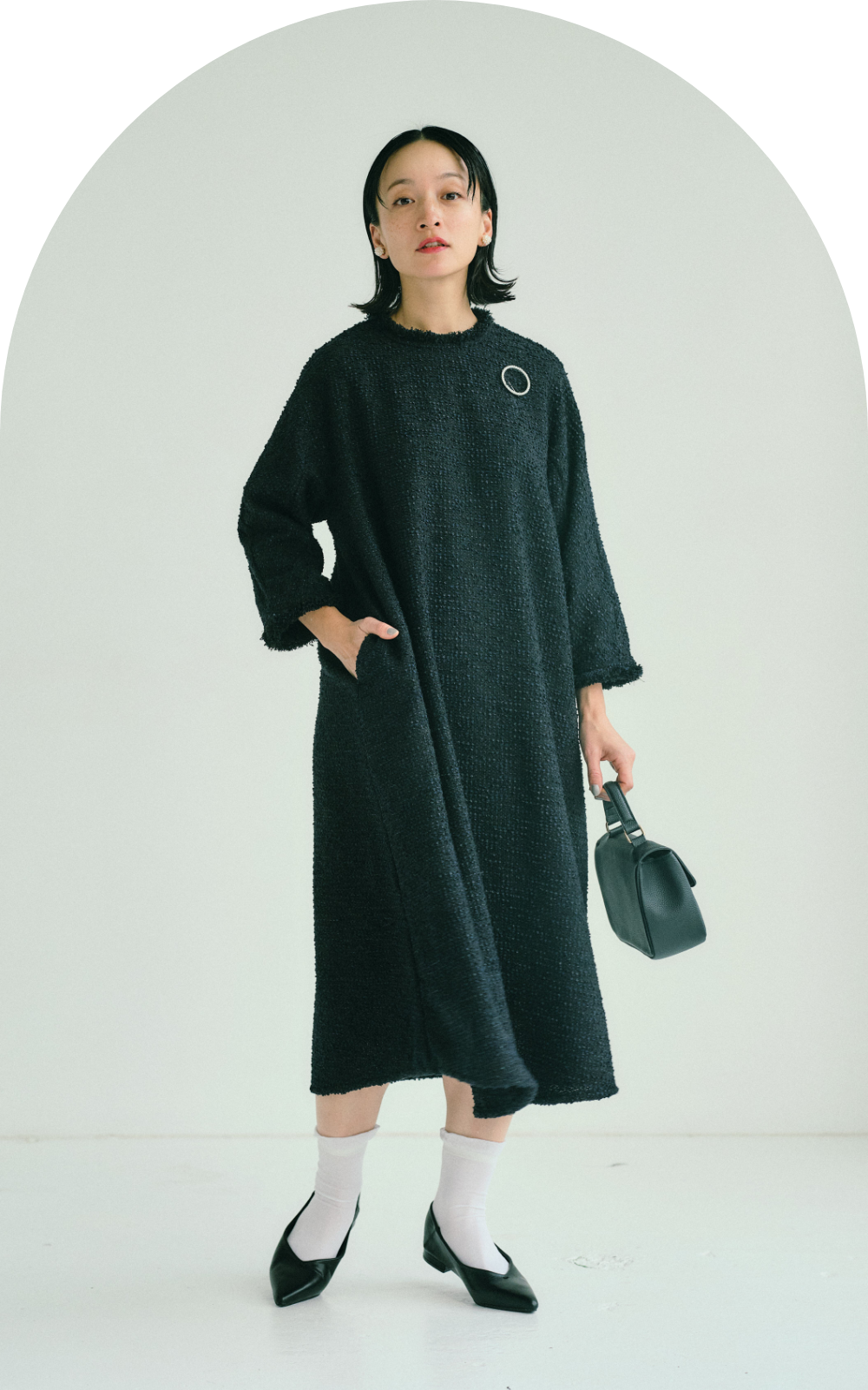 セレモニーシーンにおいて1枚でスタイリングが完成する心強いアイテム。シンプルだからこそ大切な日にふさわしい素材感や表面感にこだわったワンピースはイベントムードを盛り上げてくれます。