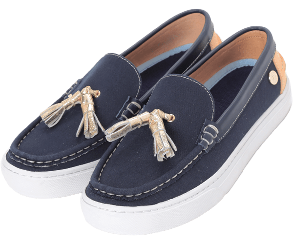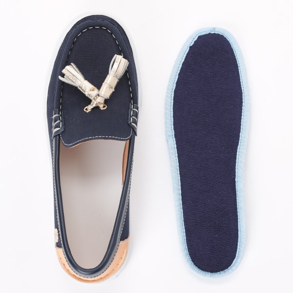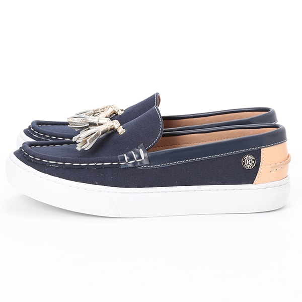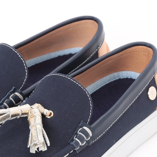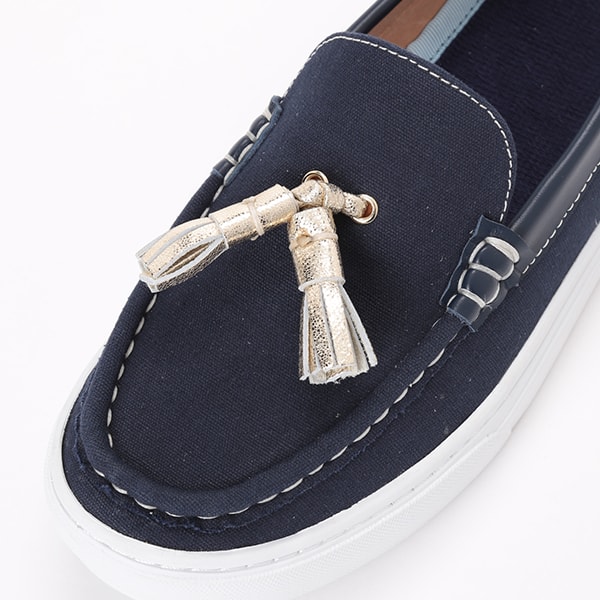 キャンバス素材を使用し、タッセルをデザインした遊び心のあるスリッポン。