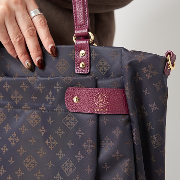 アクセントハンドルやショルダーベルトにカラーレザーを使用することでぐっと洗練された印象に。トートバッグのフロントにはロゴマークが箔押しされ、さりげなくクラス感もアップ。
