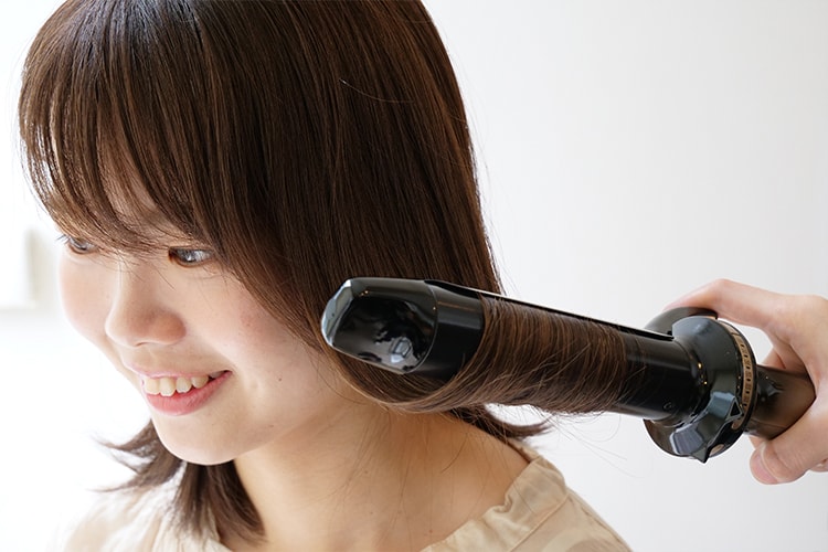 ①全体の毛先を32ミリのヘアアイロンで軽く外ハネにしていきます。毛先を巻き込み、1回転半が目安。