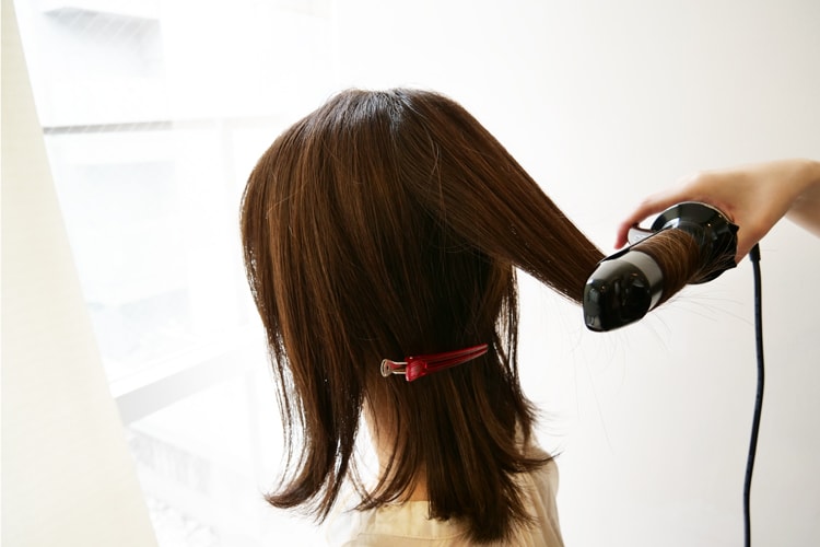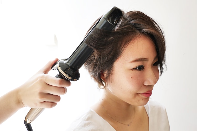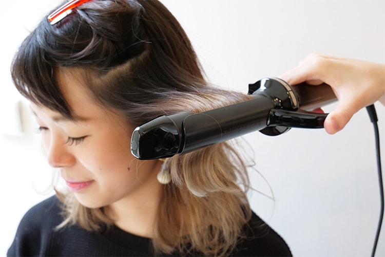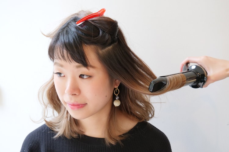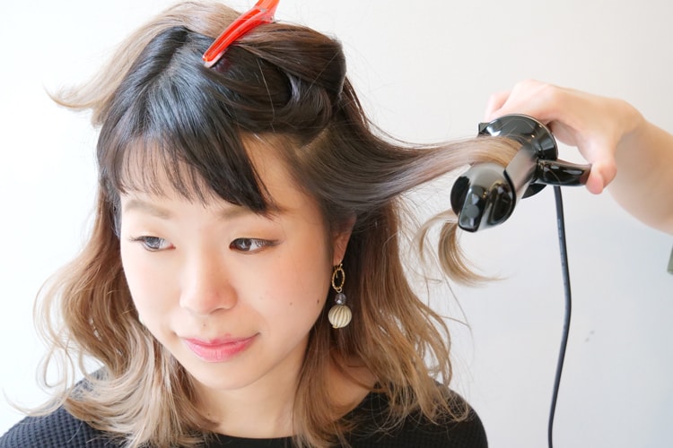 ②顔まわりの外ハネをダウンステムでボリュームを抑えながら巻いていきます。