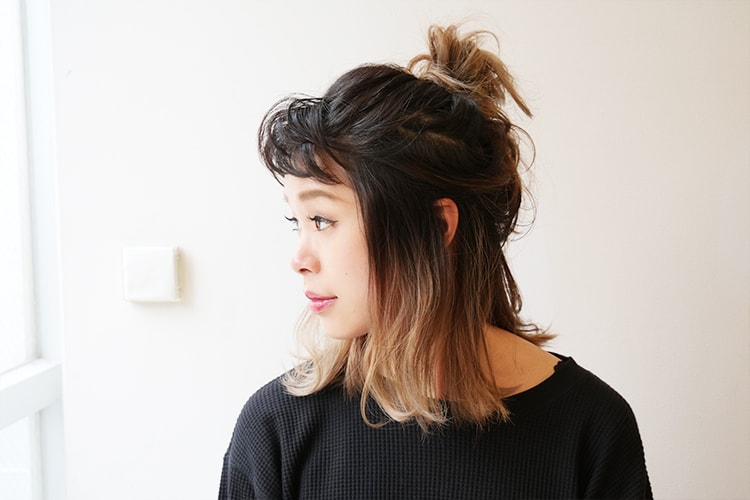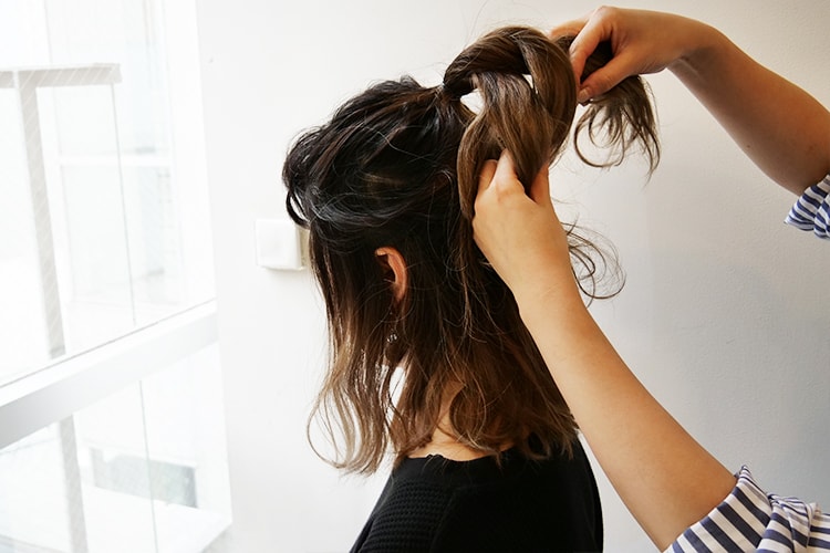 ⑤両手で左右の毛束を持ち上げながら、ヘア全体をほぐします。最後にスタイリング剤をつけ、完成!